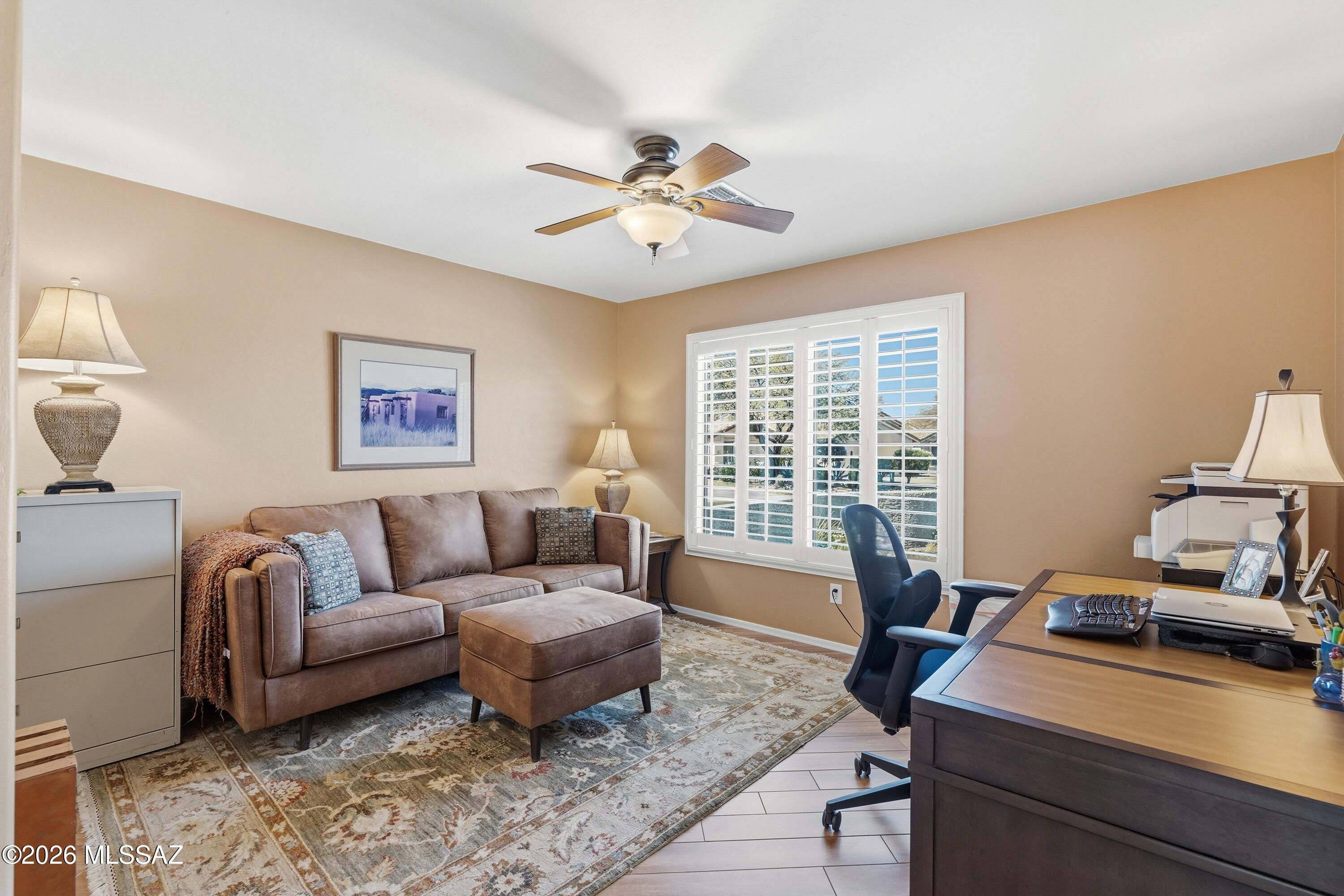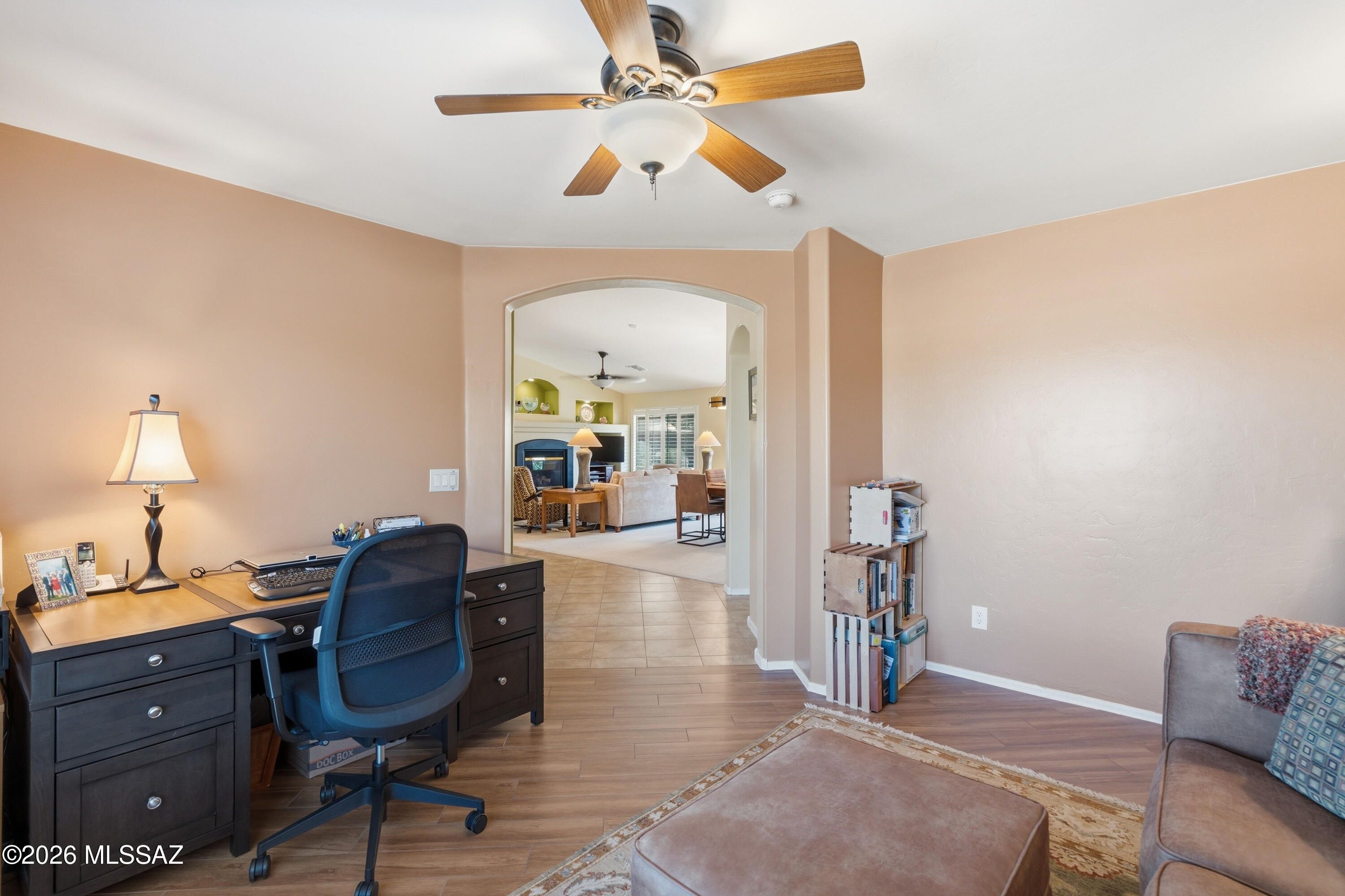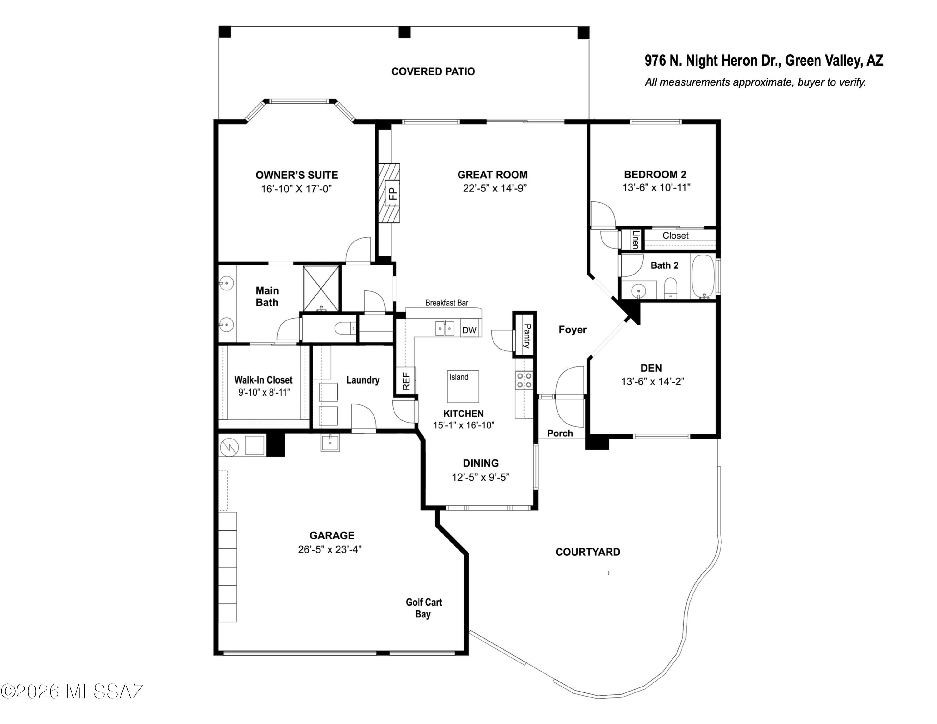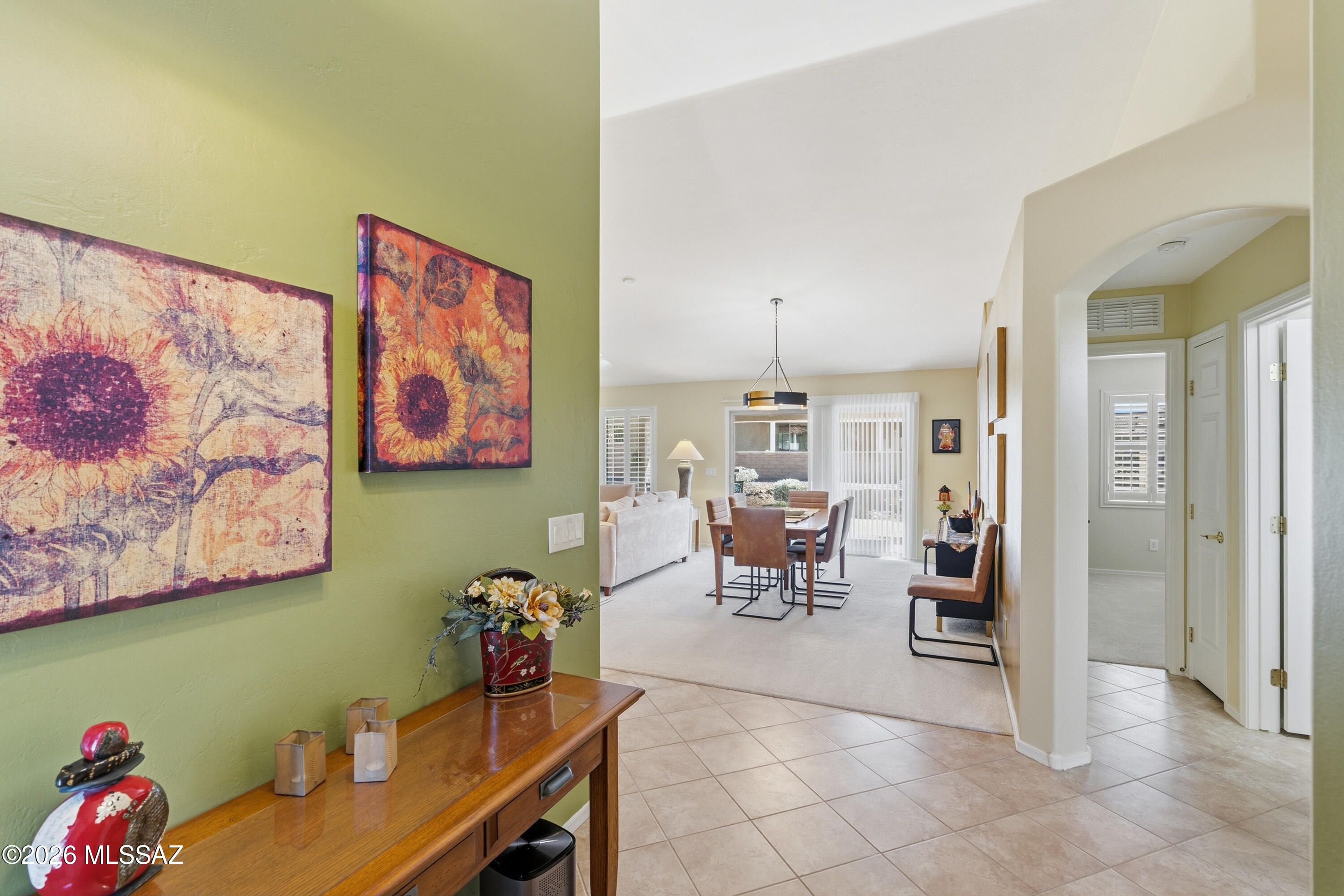 Situated on a prime corner cul-de-sac lot in Quail Creek, this expanded and updated Laredo model offers 1,960 sq. ft., 2 BR, 2 BA, a versatile den, golf cart garage, new roof and HVAC system, and a beautifully updated kitchen. Attractive front desert landscaping, highlighted by two majestic saguaros, creates outstanding curb appeal, while the gated front paver courtyard provides a welcoming entry and an ideal setting to enjoy sunset views. A wrought iron security door opens to the foyer and spacious great room, featuring a cozy gas fireplace, built-in display niches, and generous space for both everyday living and formal dining. The interior has been thoughtfully refreshed with newer paint, updated ceiling fans, and modern lighting, creating a warm and inviting atmosphere throughout.