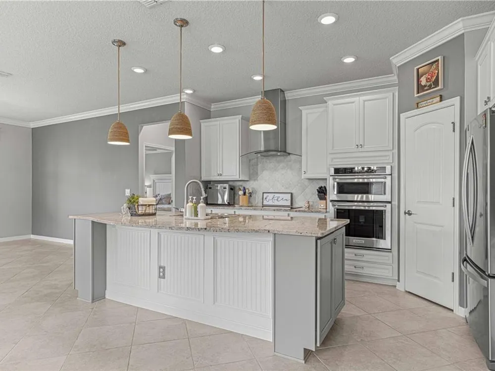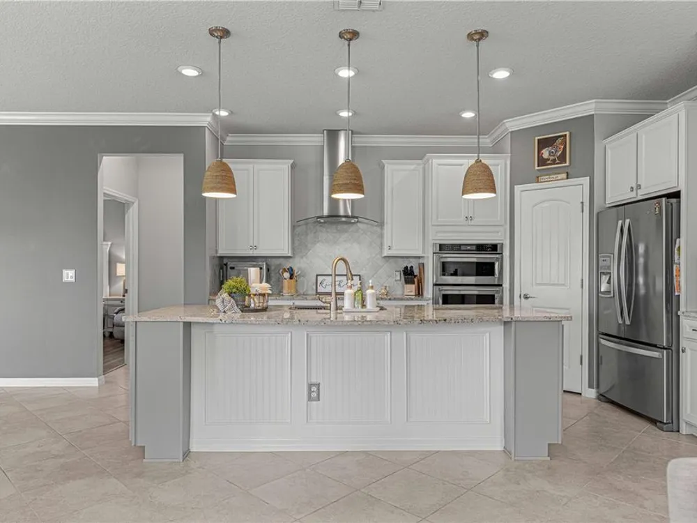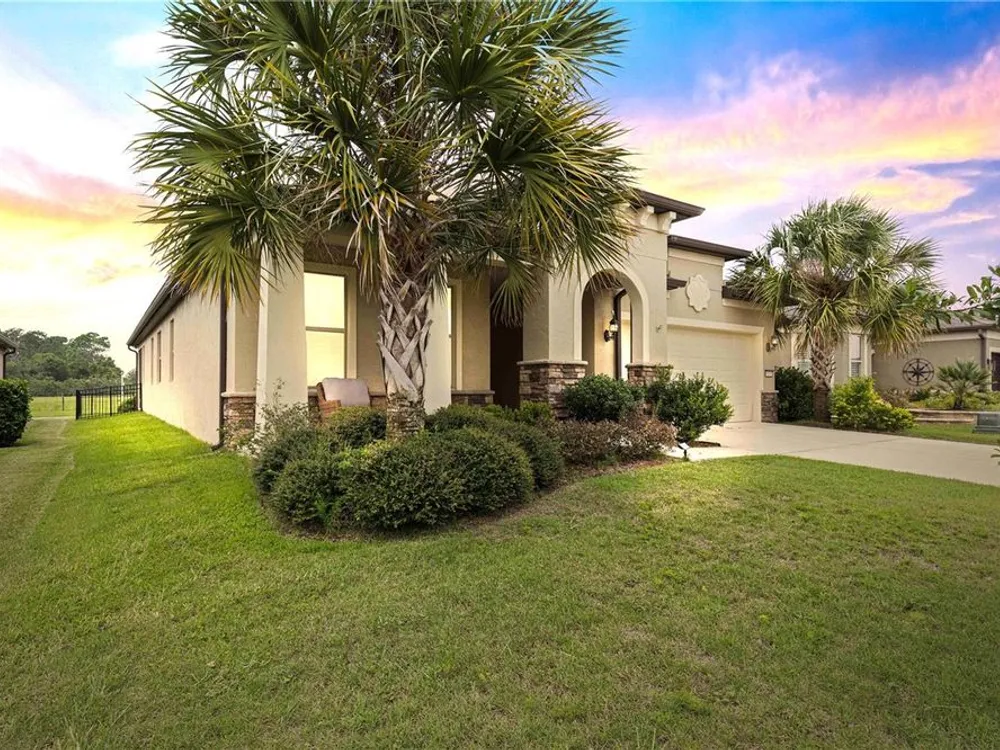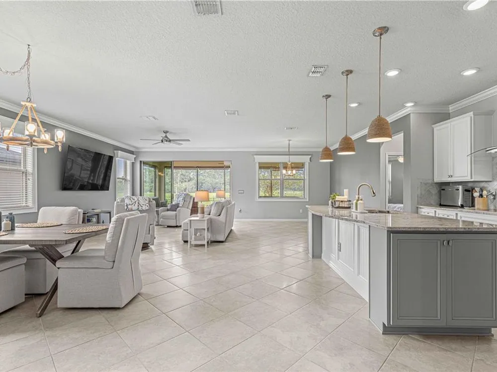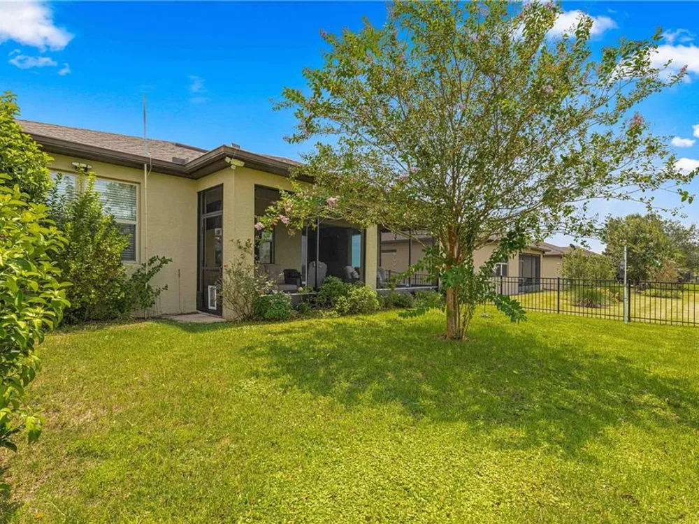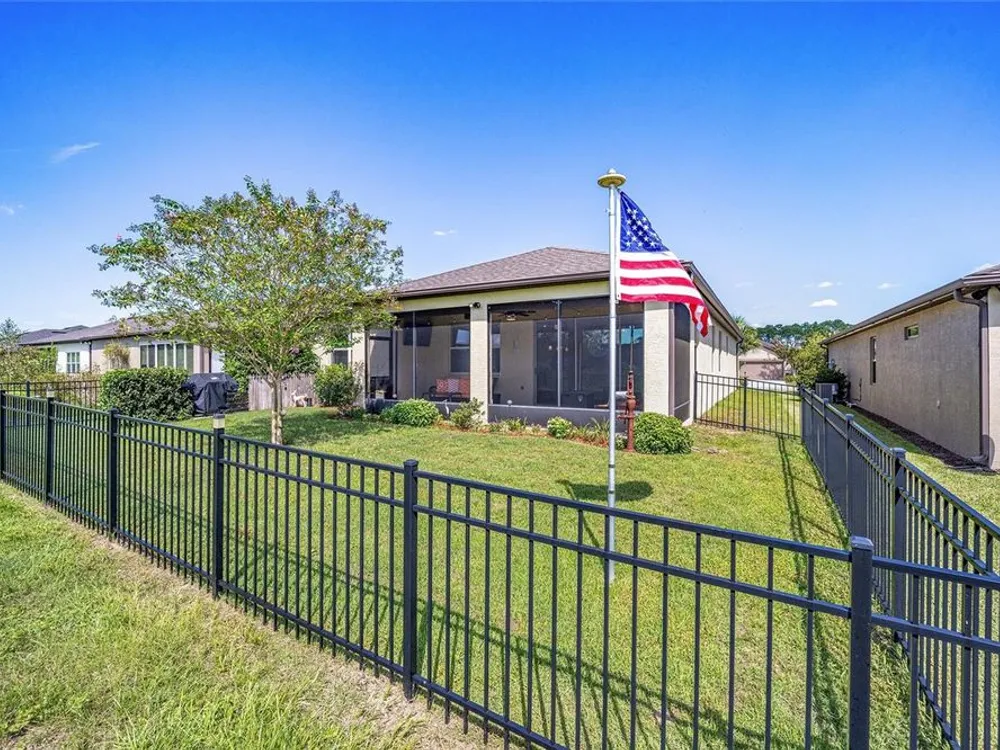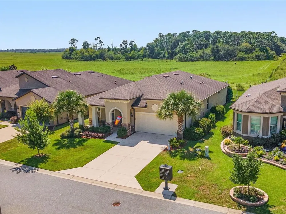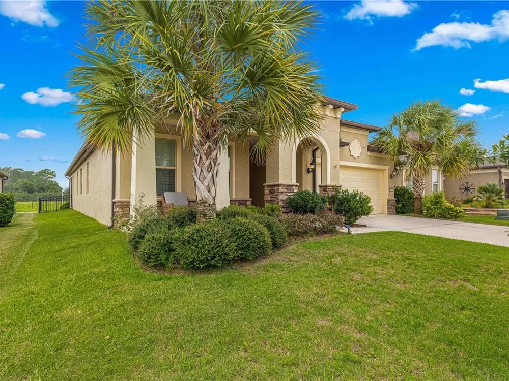 This exquisite 4/2/2 can be your home with the absolute best location in a gated, 55+ community located in the Horse Capital of the World, Ocala, Florida. Sought after Stone Creek by Dell Webb Community is your perfect paradise for enjoying the 18-hole championship golf course, resort-style pool, clubhouse, state of the art fitness center, spa, community gardens, dog parks, a myriad of game courts and activities with a lifestyle director on staff. Our luxurious Summerwood model is a versatile one-story floorplan with open concept modern design which features a large kitchen island overlooking the bright, inviting gathering room, making everyday living and entertaining a breeze. Upon entering the grand foyer area the view is mesmerizing as your eyes are drawn to the unrestricted view through the gathering room, screened lanai and on out to the fenced rear yard and lush pastures beyond, where you will occasionally see a very calm group of cows grazing in the distance. A mature Crepe Myrtle tree accents the lovely rear yard where the Sellers have also established a stone patio perfect for your outdoor grill. Back inside, you will notice the attention to detail, including the 17" porcelain floor tile, plank flooring, (no carpet), granite counter tops, top-of-the-line stainless steel appliances and the very pleasing designer paint colors throughout. The interior of this home was transformed in 2023 with the installation of crown molding in all four bedrooms, the bathrooms, gathering room, kitchen, hallway, foyer, and the laundry room. Additionally, the foyer and arched entrance into the gathering room were enhanced with decorative trim and wainscoting, which was carried on over to accentuate the kitchen island as well. The split floorplan affords privacy for all with three guest bedrooms, (or two guest bedrooms and an office if you desire), and a spa like guest bathroom at the front of the house and the primary suite located at the rear of the house. A large double window affording views of the lush rear yard and fields beyond, (no neighbors behind the house), and the tray ceiling add to the ambiance of the primary suite. The relaxing environment of the primary ensuite bath includes a clear story window, luxurious his and her sinks, a separate dressing table, linen closet, walk-in closet and a private water closet room. Additionally, there is a large interior domestic suite and the Whirlpool washer/dryer, new as of February 2024, with top rated features, shall convey. Lots of recent upgrades have been done that will please any discerning and punctilious Buyer: new dining area and kitchen nook chandeliers, kitchen island pendant light covers, extra quiet ceiling fans, dimmer switches, motion light sensors, a Ring Doorbell installed and solar security lights were added in the rear yard. The 2-car garage includes overhead mounted storage racks that would satisfy any neat-nick's desire to be organized, a 50 AMP RV Outlet and a new LG Refrigerator for storing extra drinks to stay hydrated with your friends after a round of golf. The garage floor has an epoxy coating making it easy to clean and resistant to staining. Interested in more information? Please reach out for our full color brochure and video tour/photos.