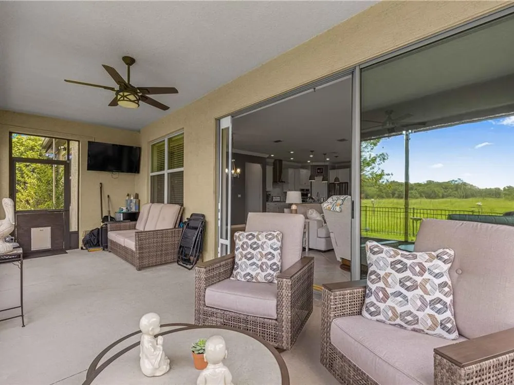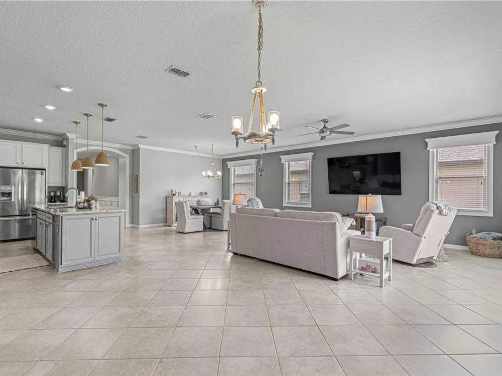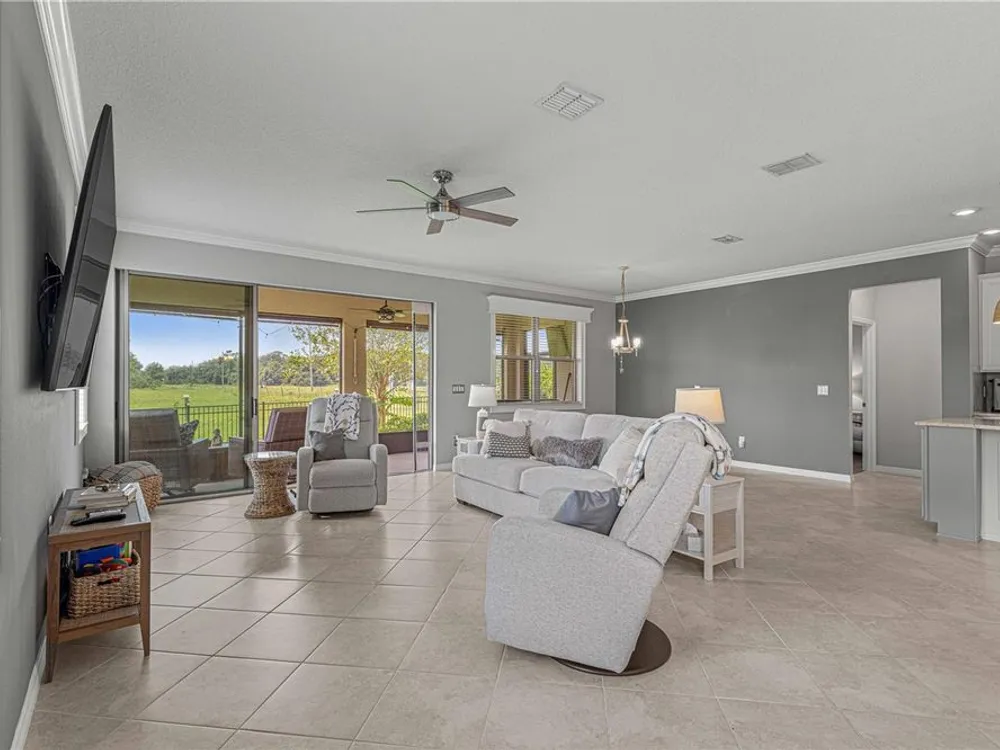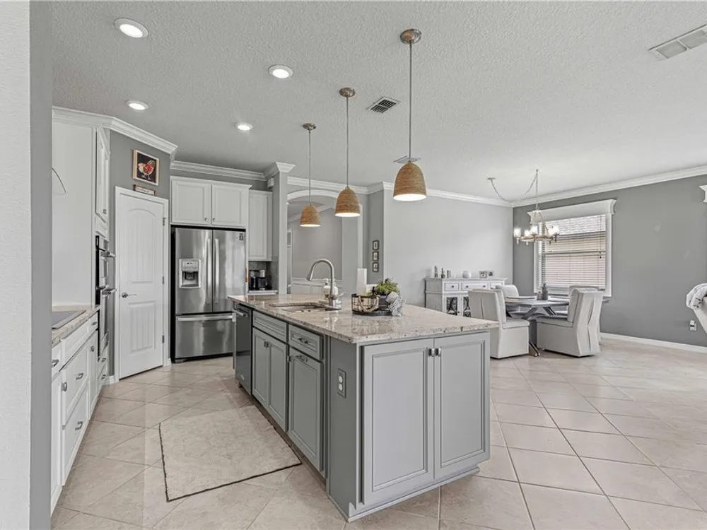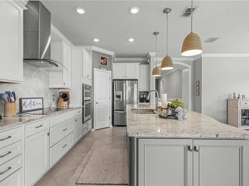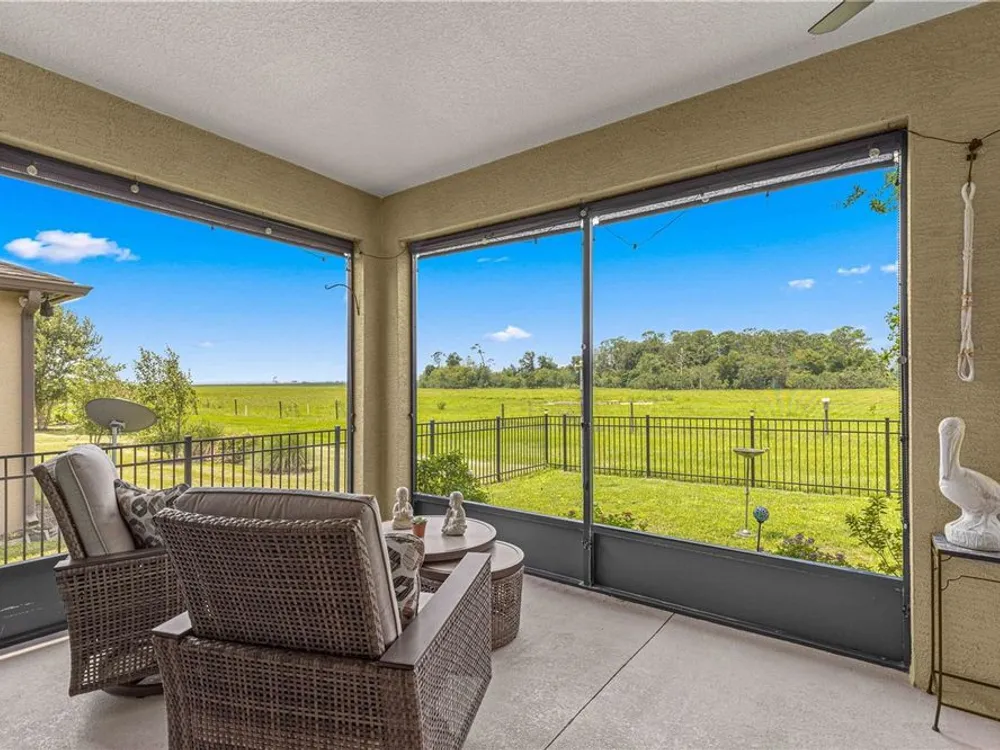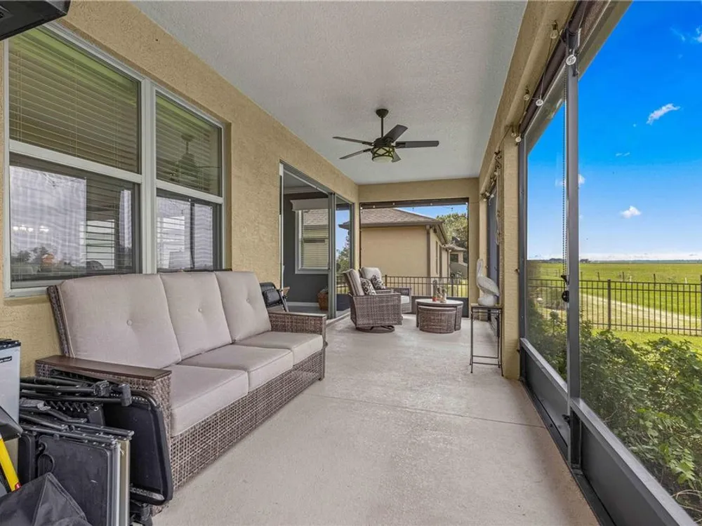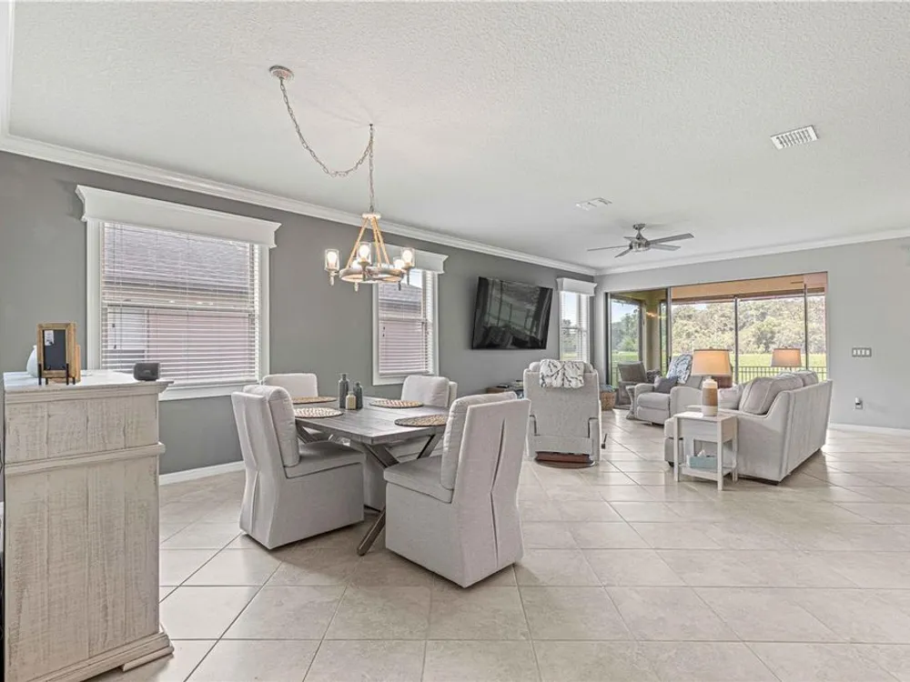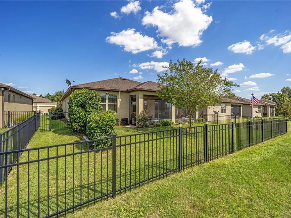 This exquisite 4/2/2 can be your home with the absolute best location in a gated, 55+ community located in the Horse Capital of the World, Ocala, Florida. Sought after Stone Creek by Dell Webb Community is your perfect paradise for enjoying the 18-hole championship golf course, resort-style pool, clubhouse, state of the art fitness center, spa, community gardens, dog parks, a myriad of game courts and activities with a lifestyle director on staff. Our luxurious Summerwood model is a versatile one-story floorplan with open concept modern design which features a large kitchen island overlooking the bright, inviting gathering room, making everyday living and entertaining a breeze. Upon entering the grand foyer area the view is mesmerizing as your eyes are drawn to the unrestricted view through the gathering room, screened lanai and on out to the fenced rear yard and lush pastures beyond, where you will occasionally see a very calm group of cows grazing in the distance. A mature Crepe Myrtle tree accents the lovely rear yard where the Sellers have also established a stone patio perfect for your outdoor grill. Back inside, you will notice the attention to detail, including the 17" porcelain floor tile, plank flooring, (no carpet), granite counter tops, top-of-the-line stainless steel appliances and the very pleasing designer paint colors throughout. The interior of this home was transformed in 2023 with the installation of crown molding in all four bedrooms, the bathrooms, gathering room, kitchen, hallway, foyer, and the laundry room. Additionally, the foyer and arched entrance into the gathering room were enhanced with decorative trim and wainscoting, which was carried on over to accentuate the kitchen island as well. The split floorplan affords privacy for all with three guest bedrooms, (or two guest bedrooms and an office if you desire), and a spa like guest bathroom at the front of the house and the primary suite located at the rear of the house. A large double window affording views of the lush rear yard and fields beyond, (no neighbors behind the house), and the tray ceiling add to the ambiance of the primary suite. The relaxing environment of the primary ensuite bath includes a clear story window, luxurious his and her sinks, a separate dressing table, linen closet, walk-in closet and a private water closet room. Additionally, there is a large interior domestic suite and the Whirlpool washer/dryer, new as of February 2024, with top rated features, shall convey. Lots of recent upgrades have been done that will please any discerning and punctilious Buyer: new dining area and kitchen nook chandeliers, kitchen island pendant light covers, extra quiet ceiling fans, dimmer switches, motion light sensors, a Ring Doorbell installed and solar security lights were added in the rear yard. The 2-car garage includes overhead mounted storage racks that would satisfy any neat-nick's desire to be organized, a 50 AMP RV Outlet and a new LG Refrigerator for storing extra drinks to stay hydrated with your friends after a round of golf. The garage floor has an epoxy coating making it easy to clean and resistant to staining. Interested in more information? Please reach out for our full color brochure and video tour/photos.