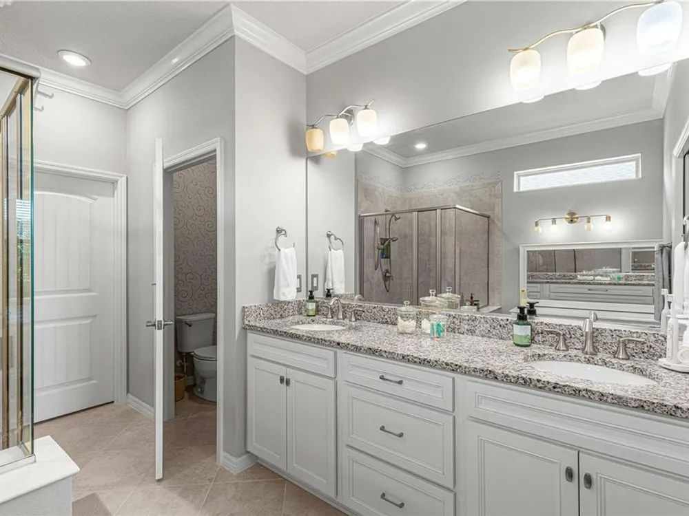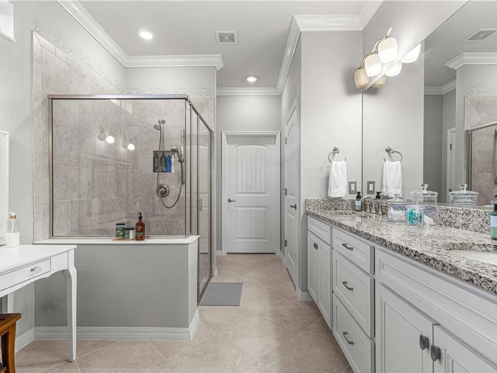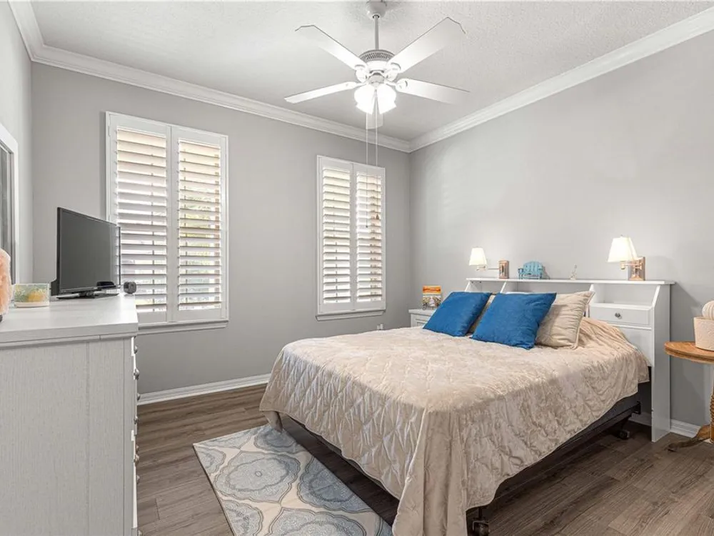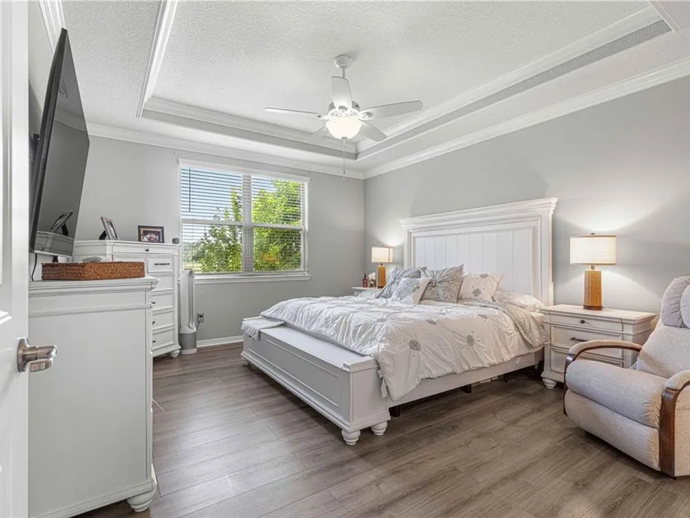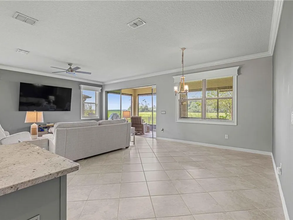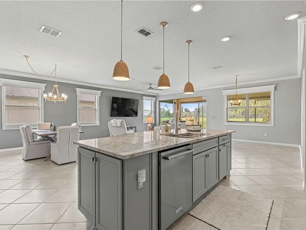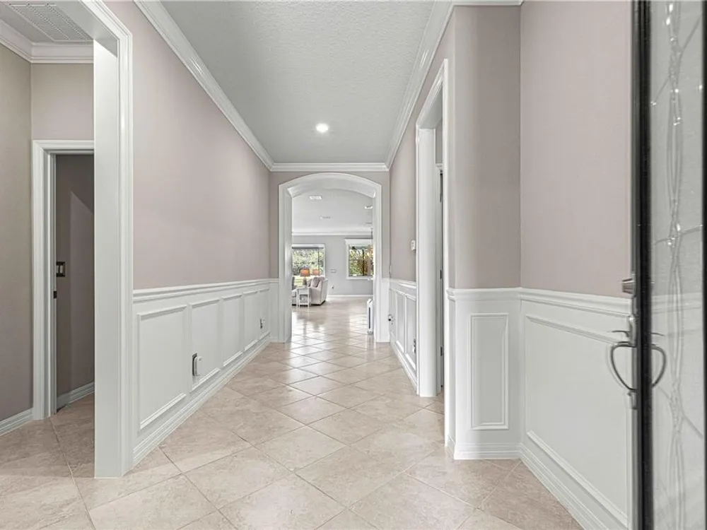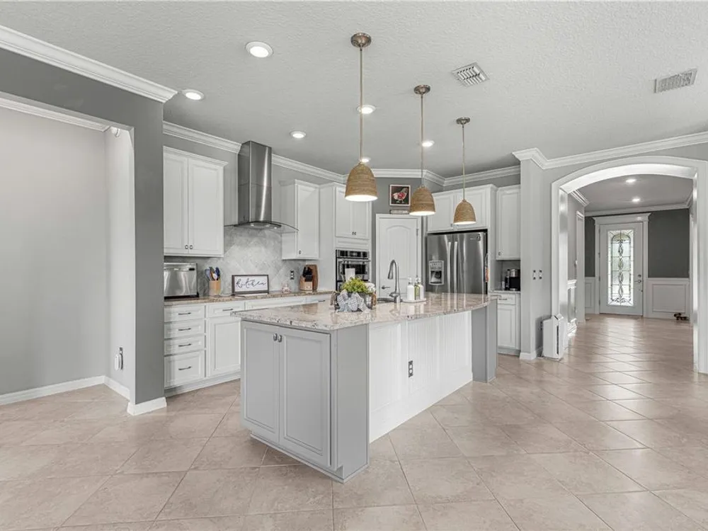This exquisite 4/2/2 can be your home with the absolute best location in a gated, 55+ community located in the Horse Capital of the World, Ocala, Florida. Sought after Stone Creek by Dell Webb Community is your perfect paradise for enjoying the 18-hole championship golf course, resort-style pool, clubhouse, state of the art fitness center, spa, community gardens, dog parks, a myriad of game courts and activities with a lifestyle director on staff. Our luxurious Summerwood model is a versatile one-story floorplan with open concept modern design which features a large kitchen island overlooking the bright, inviting gathering room, making everyday living and entertaining a breeze. Upon entering the grand foyer area the view is mesmerizing as your eyes are drawn to the unrestricted view through the gathering room, screened lanai and on out to the fenced rear yard and lush pastures beyond, where you will occasionally see a very calm group of cows grazing in the distance. A mature Crepe Myrtle tree accents the lovely rear yard where the Sellers have also established a stone patio perfect for your outdoor grill. Back inside, you will notice the attention to detail, including the 17" porcelain floor tile, plank flooring, (no carpet), granite counter tops, top-of-the-line stainless steel appliances and the very pleasing designer paint colors throughout. The interior of this home was transformed in 2023 with the installation of crown molding in all four bedrooms, the bathrooms, gathering room, kitchen, hallway, foyer, and the laundry room. Additionally, the foyer and arched entrance into the gathering room were enhanced with decorative trim and wainscoting, which was carried on over to accentuate the kitchen island as well. The split floorplan affords privacy for all with three guest bedrooms, (or two guest bedrooms and an office if you desire), and a spa like guest bathroom at the front of the house and the primary suite located at the rear of the house. A large double window affording views of the lush rear yard and fields beyond, (no neighbors behind the house), and the tray ceiling add to the ambiance of the primary suite. The relaxing environment of the primary ensuite bath includes a clear story window, luxurious his and her sinks, a separate dressing table, linen closet, walk-in closet and a private water closet room. Additionally, there is a large interior domestic suite and the Whirlpool washer/dryer, new as of February 2024, with top rated features, shall convey. Lots of recent upgrades have been done that will please any discerning and punctilious Buyer: new dining area and kitchen nook chandeliers, kitchen island pendant light covers, extra quiet ceiling fans, dimmer switches, motion light sensors, a Ring Doorbell installed and solar security lights were added in the rear yard. The 2-car garage includes overhead mounted storage racks that would satisfy any neat-nick's desire to be organized, a 50 AMP RV Outlet and a new LG Refrigerator for storing extra drinks to stay hydrated with your friends after a round of golf. The garage floor has an epoxy coating making it easy to clean and resistant to staining. Interested in more information? Please reach out for our full color brochure and video tour/photos.