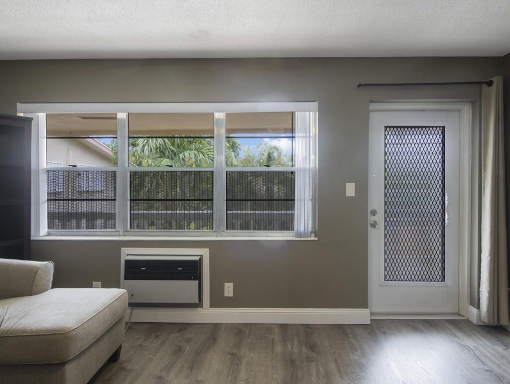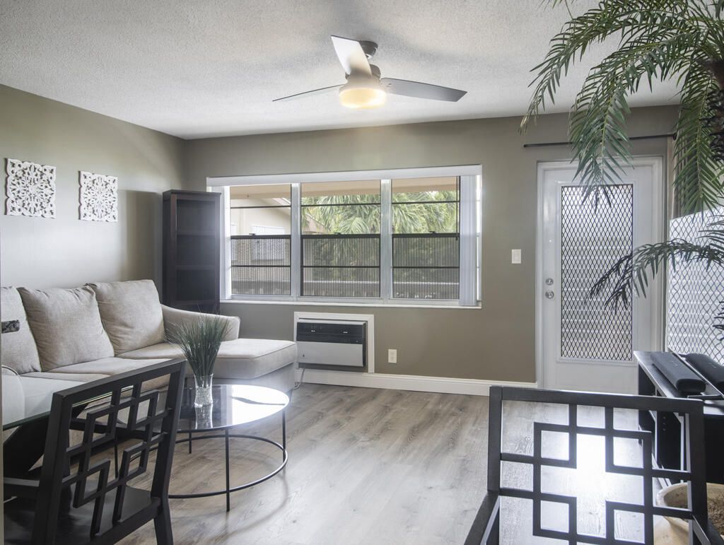 Active 55+ Living in West Palm Beach! Move-in ready and beautifully updated, this condo offers peace of mind with a newer roof, completed concrete/soffit work, and no special assessments. Building features a lift for easy access, and the unit is rentable after 2 years. Inside, enjoy luxury vinyl wood flooring throughout, including the closets. The updated kitchen shines with espresso cabinets, granite counters, tile backsplash, stainless appliances, and recessed lighting. The renovated bath offers large-format tile, glass shower doors, a barn-style vanity, and a vent/light/fan/heat combo for comfort. Additional highlights include hurricane shutters (front), two wall A/C units with heat, new vinyl windows on the patio, and new closet doors in the bedroom. Furniture is negotiable.