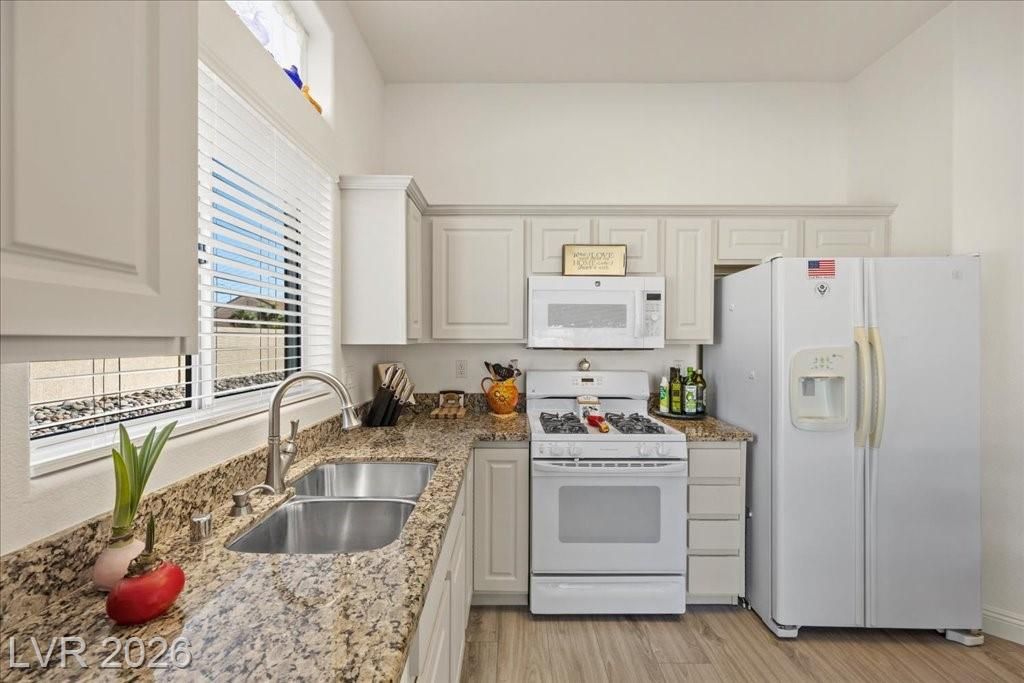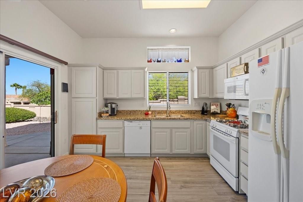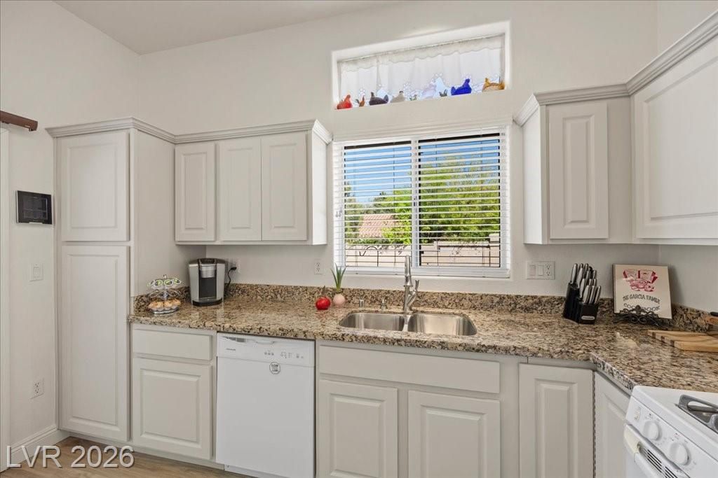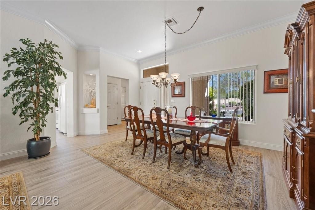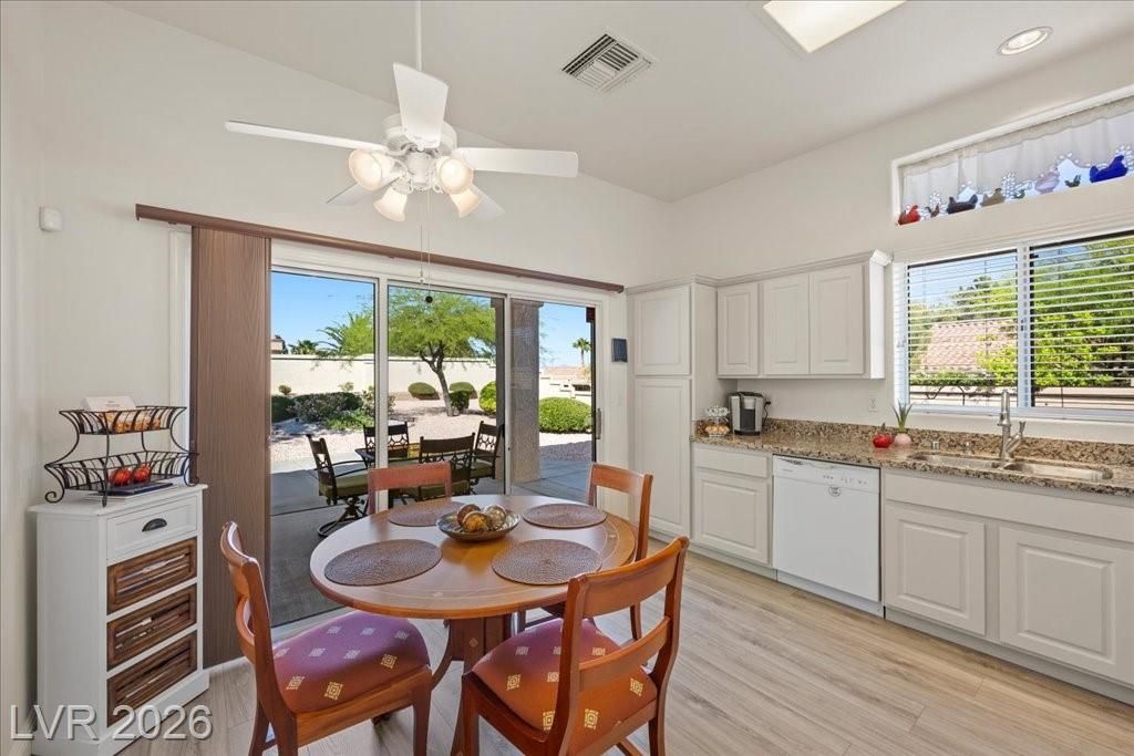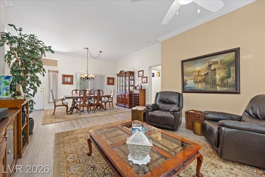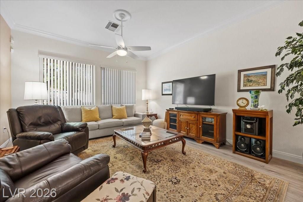 **Sun City Summerlin** Positioned at the end of a quiet cul-de-sac, this meticulously maintained single-story offers 2 bed, 2 bath & effortless, low-maintenance living with inviting curb appeal. The 2023 remodeled kitchen features granite counters & updated cabinetry. Large living room & dining area filled with natural light. Flex space off the kitchen serves as a pantry, office, or additional storage. Upgrades include HVAC (2023), exterior paint (2023) & added attic insulation (2024) for enhanced energy efficiency, luxury vinyl flooring, baseboards & crown molding. Exterior safety shutters provide added security & peace of mind. Set on an oversized 15,000+ sqft lot, the backyard offers space to relax or entertain. 2-car garage with built-in cabinets & space for a golf cart. Enjoy premier golf, fitness centers, pools/spas, pickleball, tennis, 75+ clubs & a vibrant social calendar. Sellers would like to sell the property furnished via a separate bill of sale outside of escrow.