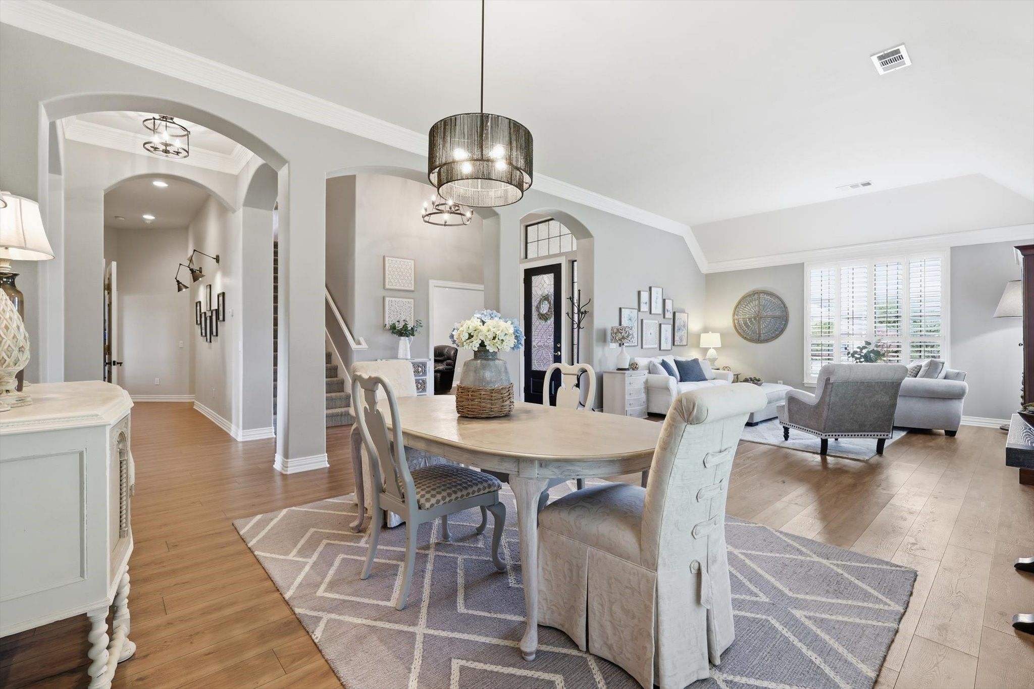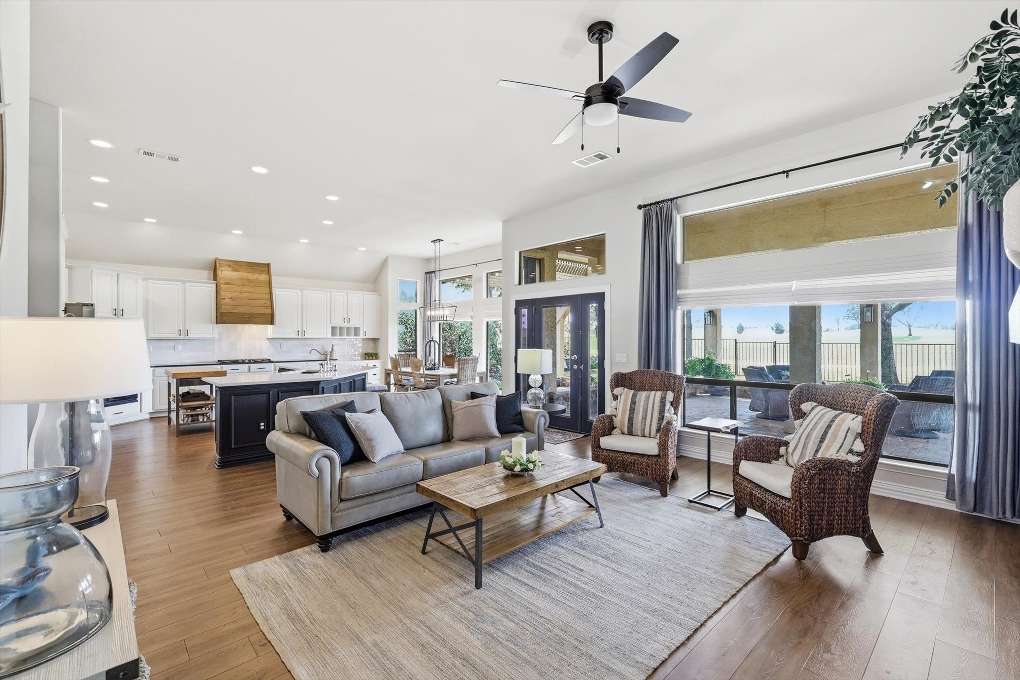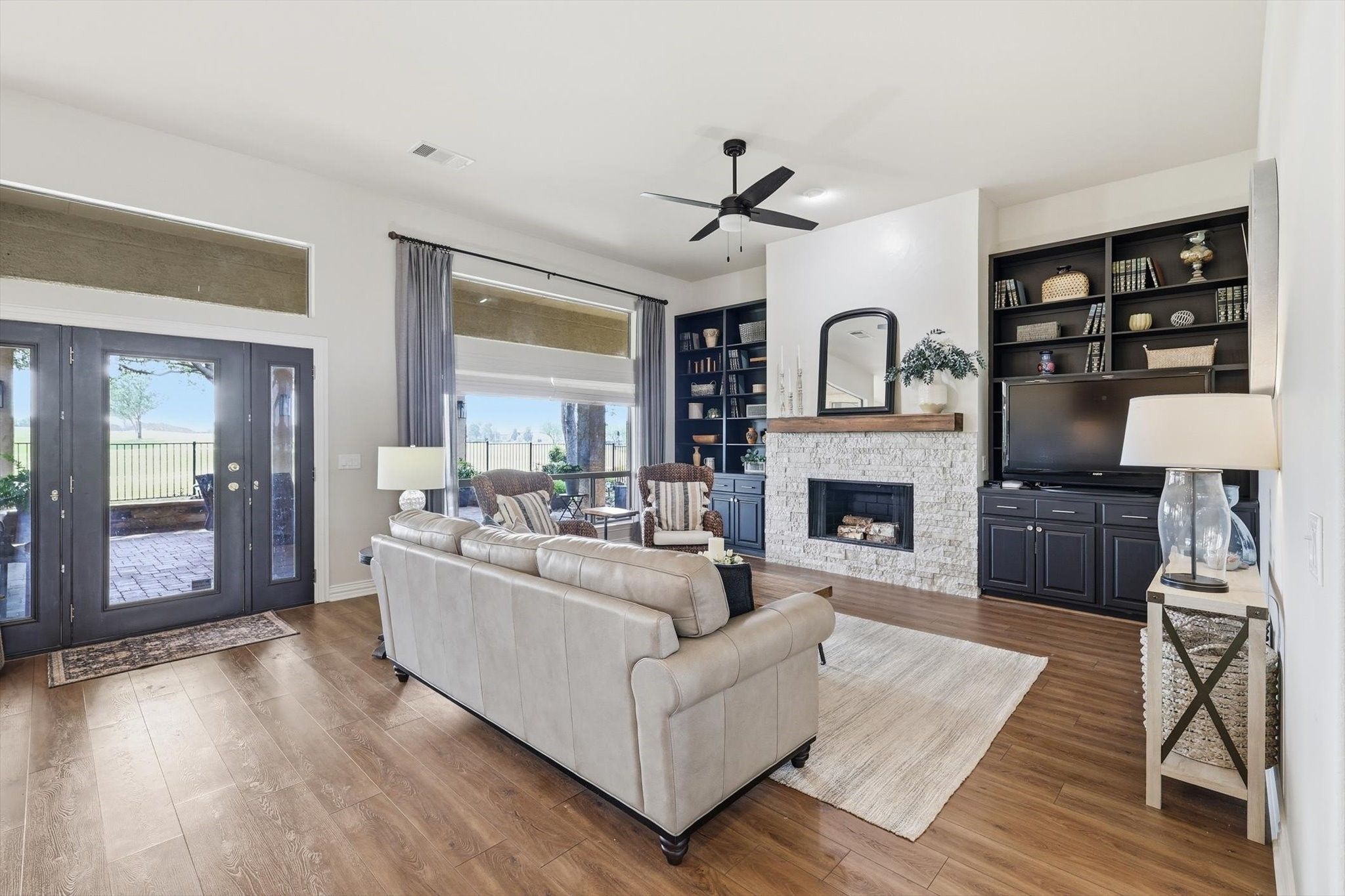 Located in the desirable gated active adult community of Robson Ranch, this beautifully designed and updated home sits on a premium golf course lot. Enormous EAST facing covered back patio extended to look out to golf course from all sides. 130 yards from the green on hole 1 of the west course. 3-car garage, open floor plan, and elegant finishes throughout, ideal for both everyday living and entertaining. Step inside to a grand two-story entryway that flows easily throughout the main level. Plantation shutters add timeless charm. Spacious living room features custom built-ins, a decorative stone fireplace, and large windows overlooking the covered back patio—perfect for enjoying peaceful golf course views. The kitchen is a true centerpiece, open to both the living and dining areas, offering abundant cabinet and counter space, double ovens, a gas cooktop, and a built-in desk area for added functionality. With two dining areas and two living spaces on the main level, there is room for everything from casual mornings to hosting guests. The large private office with French doors, at the front of the home, provides the perfect work from home setup or an additional den space . The large primary suite is a relaxing retreat, featuring dual sinks, a separate tub and shower, and oversized closet. The utility room is thoughtfully designed with a sink, ample counter space, and additional cabinetry for convenience and organization. Upstairs, you’ll find two additional bedrooms, a full bath, and a generously sized floored attic ideal for storage or future flex space. Enjoy outdoor living year-round on the extensive, oversized covered patio—perfect for entertaining or simply relaxing while taking in peaceful golf course views. Residents enjoy access to top-notch community amenities including tennis courts, pickle ball courts, a community pool, golf, and a clubhouse with a full calendar of social activities. Conveniently located 2 miles from the future HEB grocery store and I35W.
