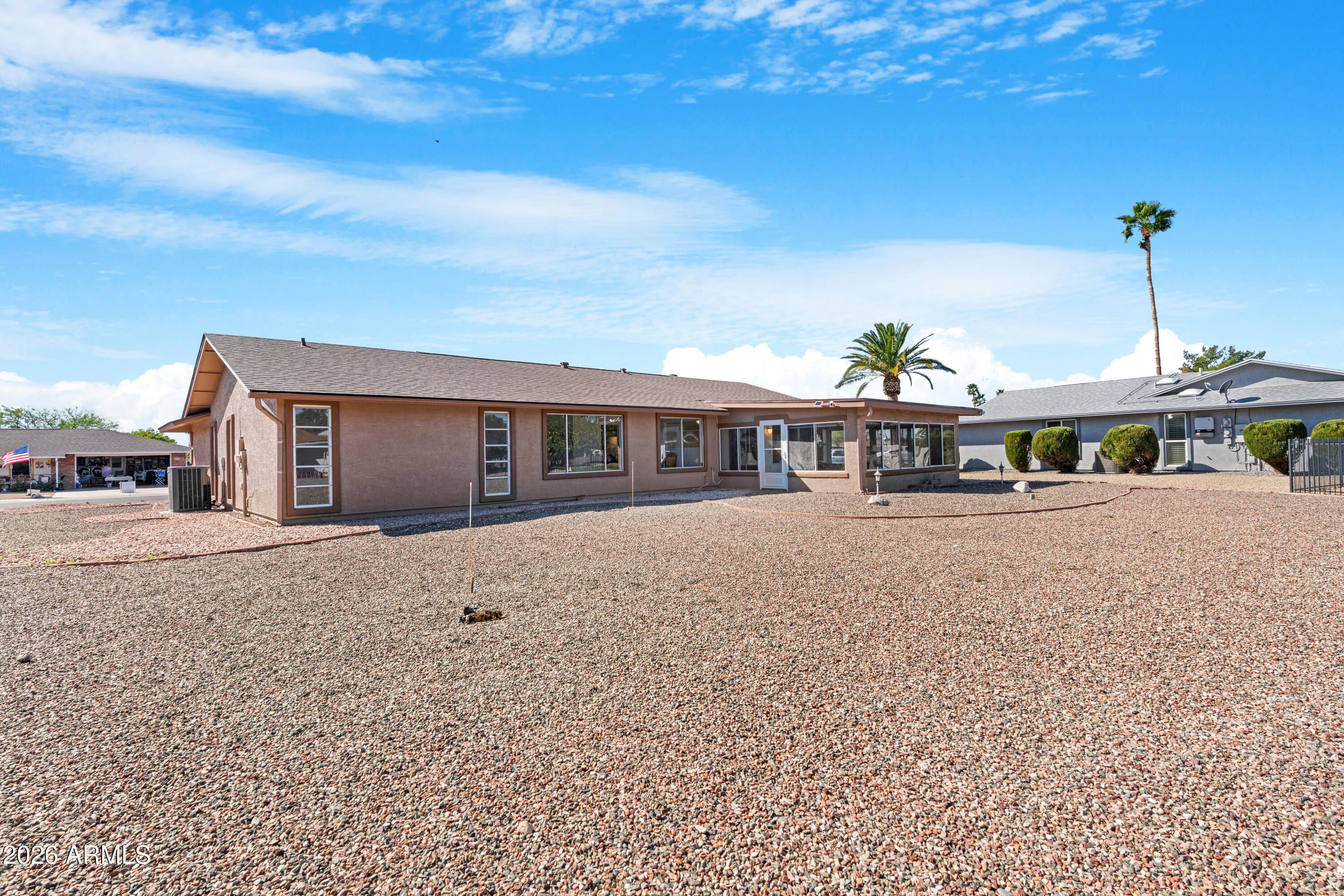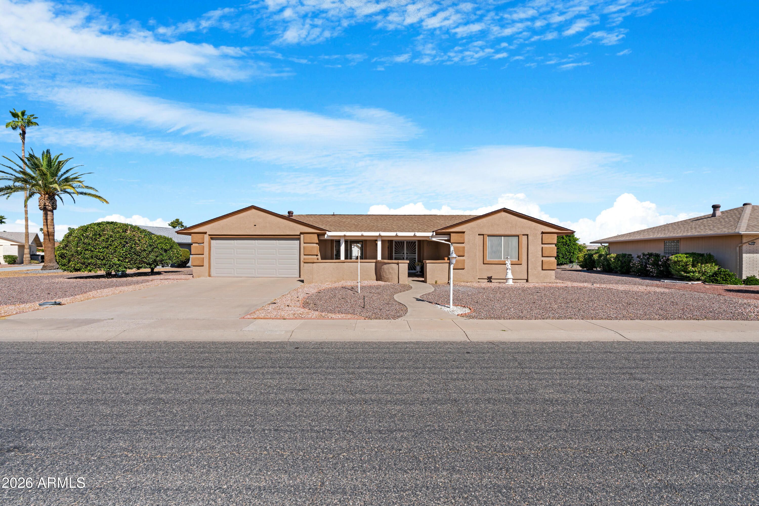 Welcome to easy living in the heart of Sun City. Step inside to a fully renovated kitchen featuring stone countertops, stainless steel appliances and brand new cabinetry designed for both function and flow. The spacious living and dining areas provide flexible space for everyday living or hosting friends and family. Just beyond, the generous Arizona room offers the ideal spot for morning coffee, hobbies, reading or simply enjoying Arizona's abundant sunshine year round. Both bedrooms are thoughtfully positioned for privacy, and the two bathrooms provide comfort and convenience for residents and guests alike. The 2 car garage showcases durable epoxy floors, adding a clean, finished look with low maintenance appeal. A new roof offers added peace of mind for years to come. Located in the heart of Sun City, this home is just minutes from golf courses, recreation centers, shopping, dining, medical facilities and community amenities. With no HOA and a centrally located setting, you have the freedom to enjoy your home and your time on your terms.