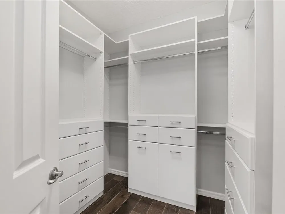 - Living/Dining Room, Open Floorplan, Main Level Primary, Solid Surface Counters, Solid-Wood Cabinets, Split Bedrooms, Stone Counters, Thermostat, Walk-In Closet(s), Window Treatments