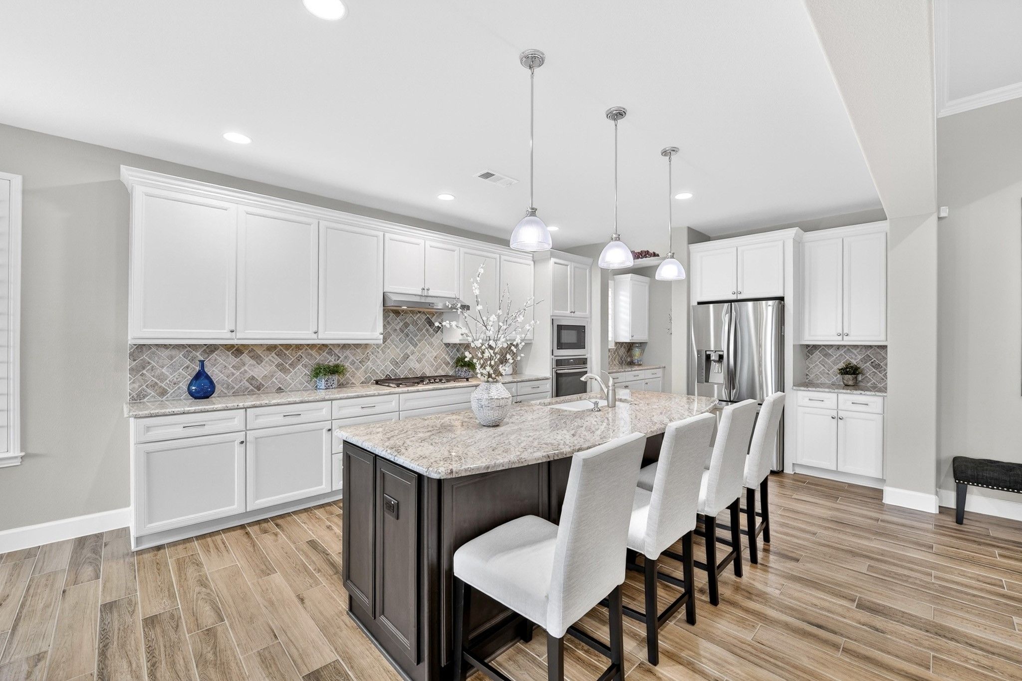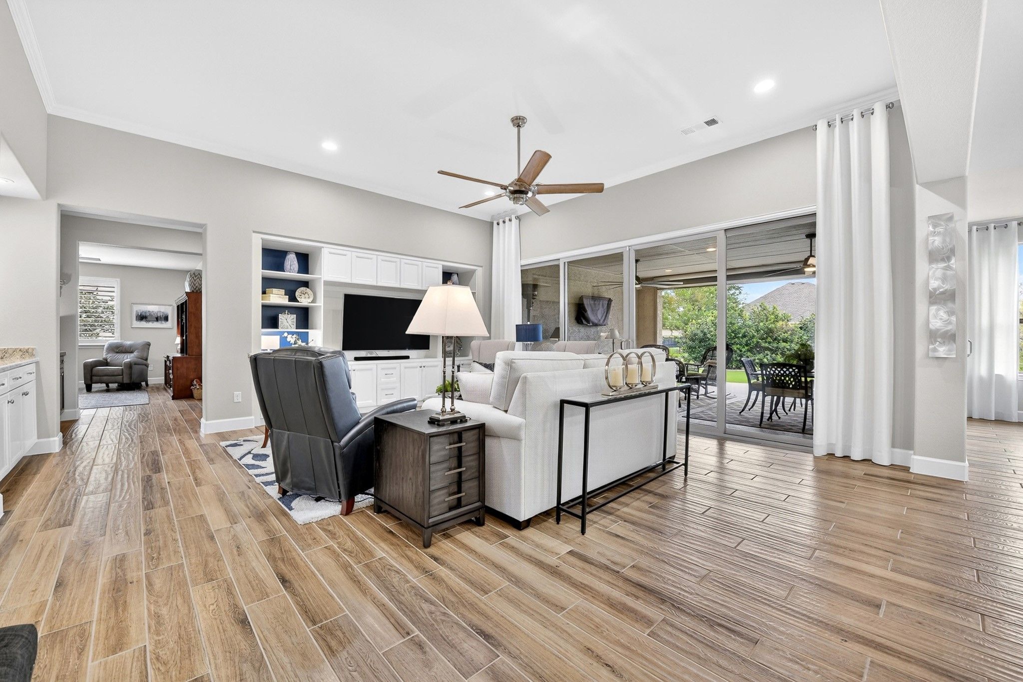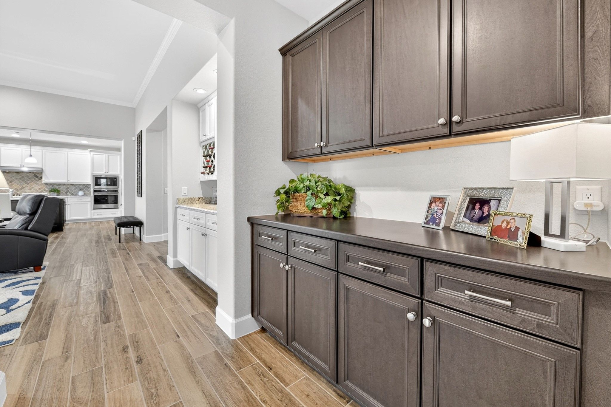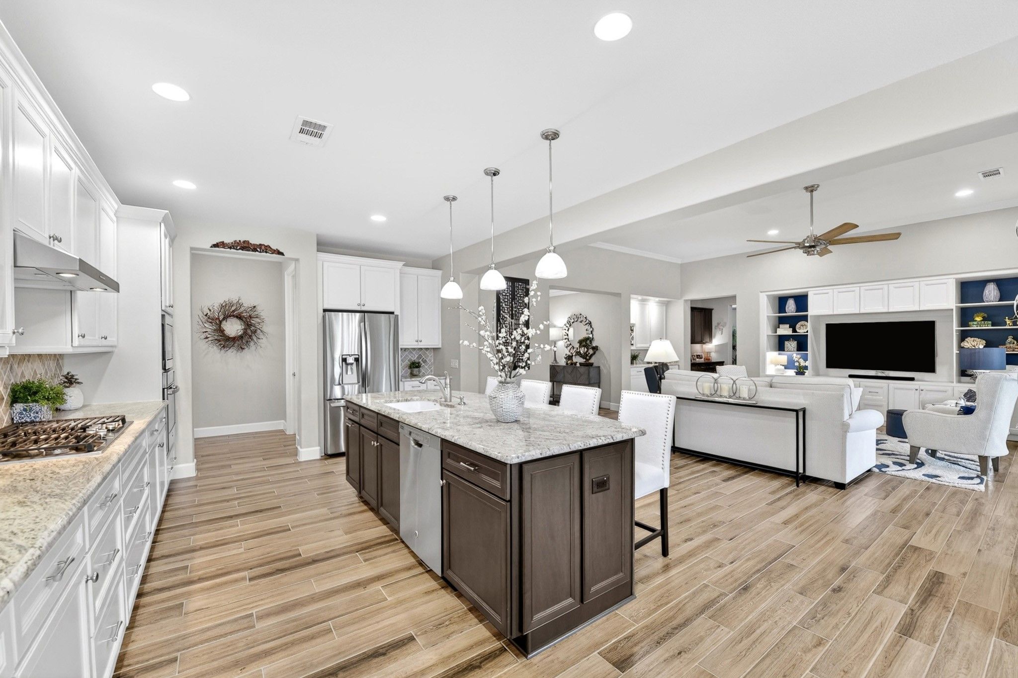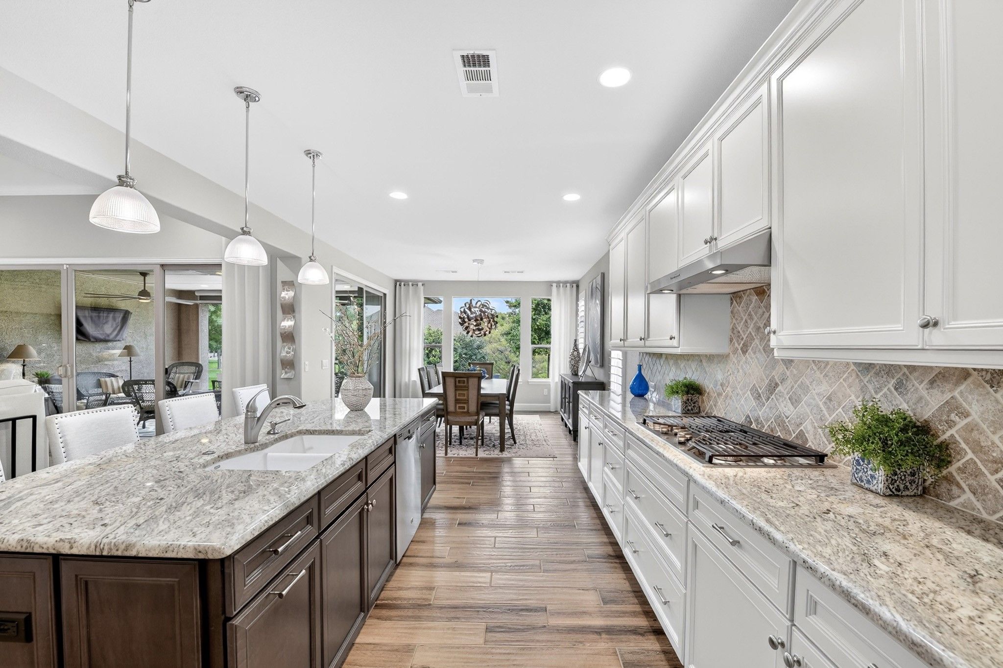 Get ready to fall in love with this stunning, award-winning Aubrey floor plan, perfectly positioned with desirable north-south exposure and packed with upscale upgrades at every turn. From the moment you step inside, the rich, wood-look porcelain tile flooring sets the tone for a home that is both elegant and inviting. The expansive open-concept great room—complete with a custom built-in entertainment center and dramatic center-opening sliding doors—seamlessly connects to a true gourmet kitchen. Here, you’ll find high-end custom cabinetry with pull-out drawers, soft-close maple dovetail construction, premium ovens, a chef’s gas cooktop, a generous wraparound island, under-cabinet lighting, upgraded granite, and a spacious walk-in pantry that makes both everyday living and entertaining a dream. The private primary suite is serene and features a cozy sitting area and a spa-inspired ensuite with dual vanities, abundant storage, and two generously sized walk-in closets and one with custom built-ins. Guests will feel right at home in their own bedroom with an ensuite bath and walk-in closet. Just off the great room, a large flex space offers endless possibilities—perfect for a home office, media room, craft space, or game room. A thoughtfully designed utility room offering a sink, extra cabinetry, and space for an additional refrigerator or freezer. The upgraded three-car garage is equally impressive, featuring an epoxy-finished floor, attic storage with lift, and a convenient side yard door. Step outside to your extended covered patio—complete with motorized screens—overlooking a peaceful greenbelt. Additional highlights include plantation shutters, elegant crown molding and baseboards, LED landscape lighting, a 12-zone irrigation system, and a Class 4 impact-resistant roof installed in July 2024. This move-in ready home offers the perfect blend of luxury, comfort, and functionality—plus the incredible lifestyle and amenities that make Robson Ranch so sought after.