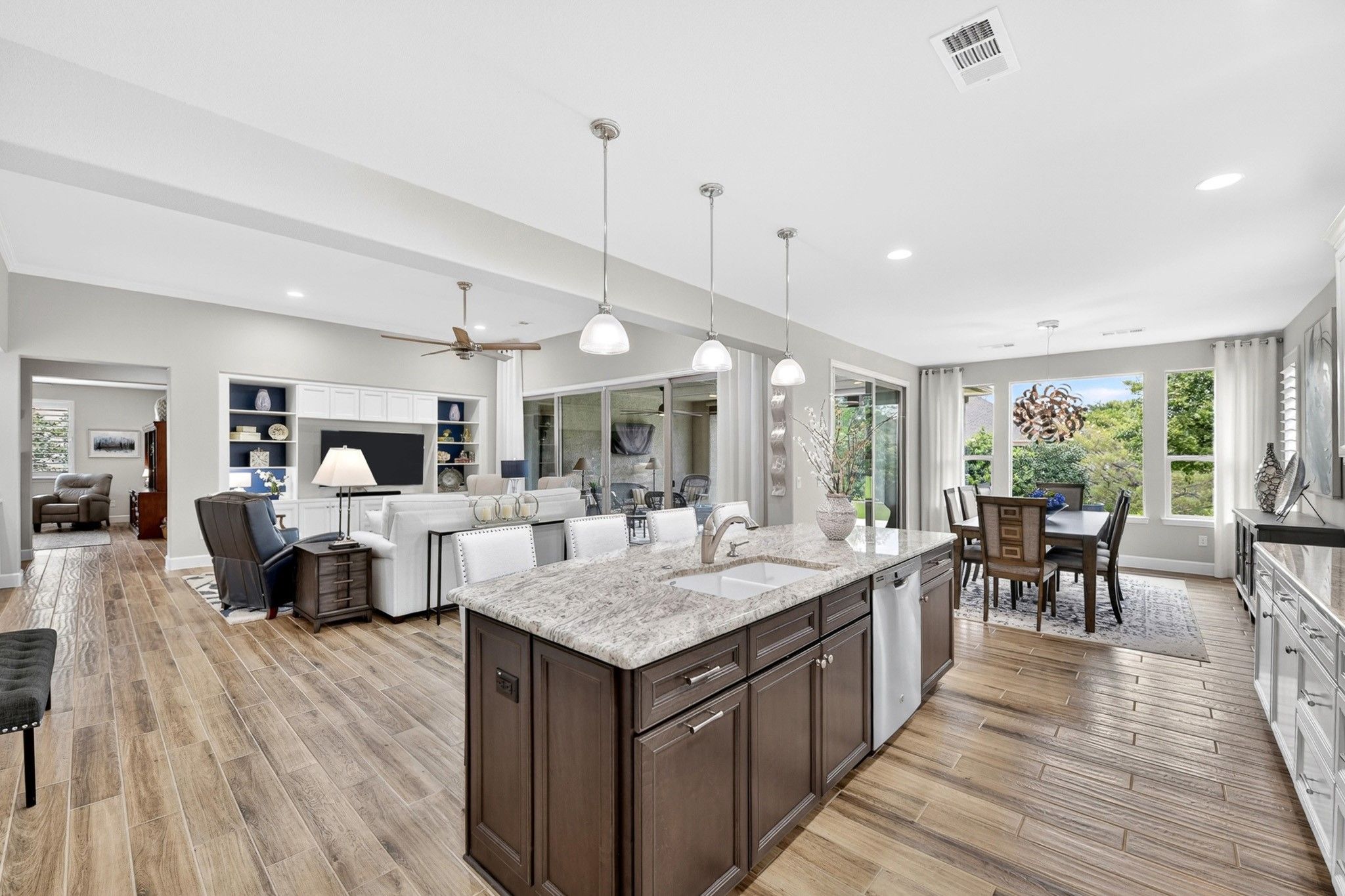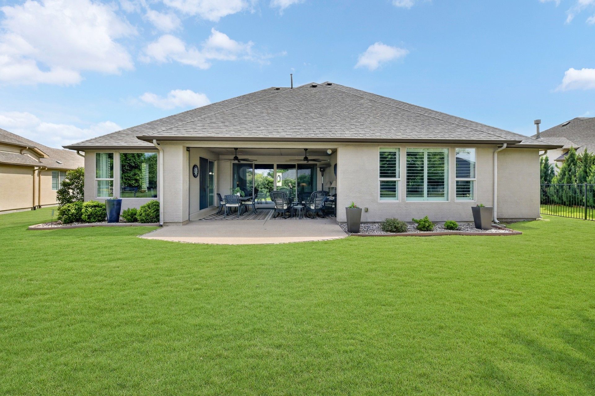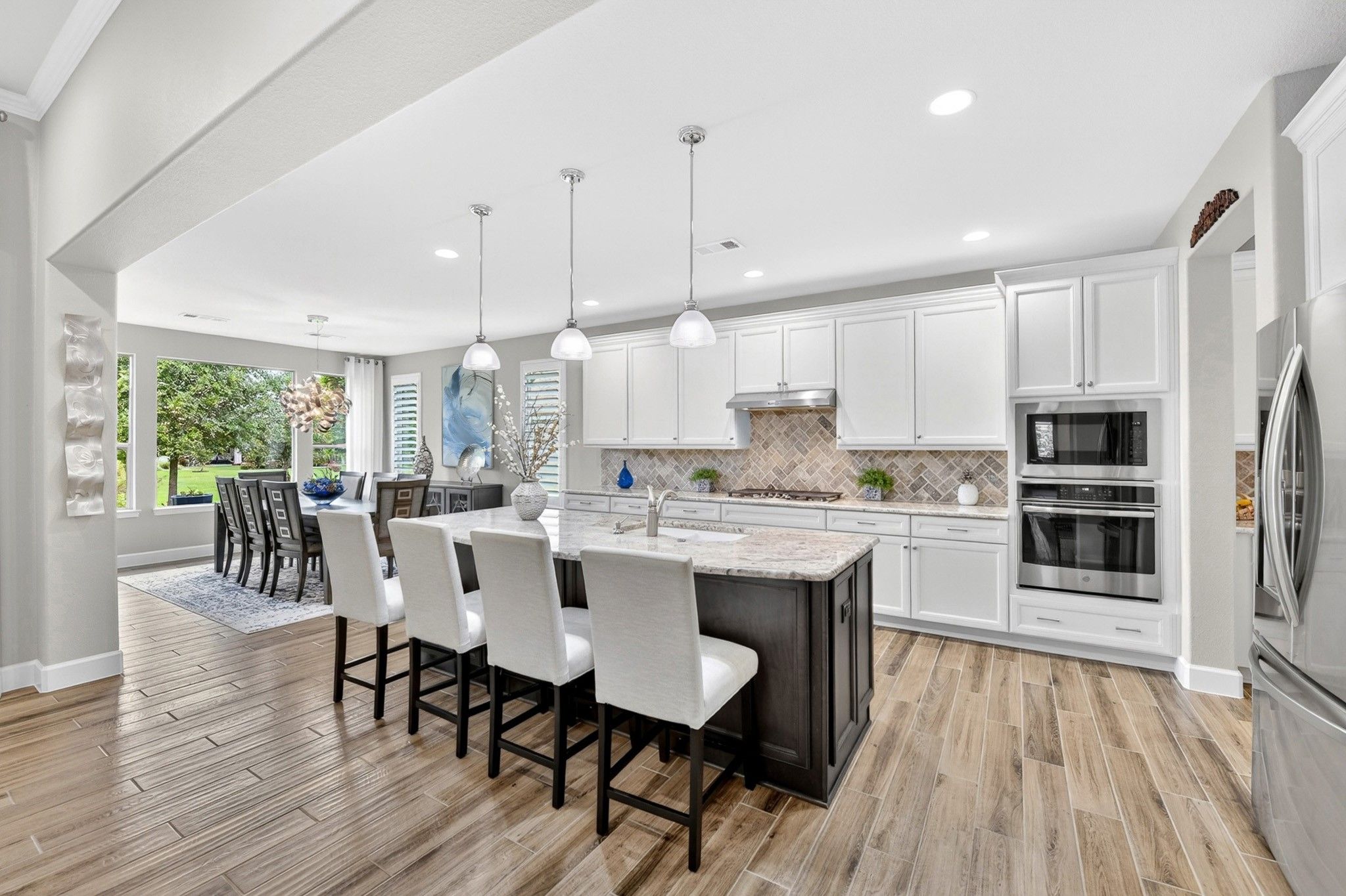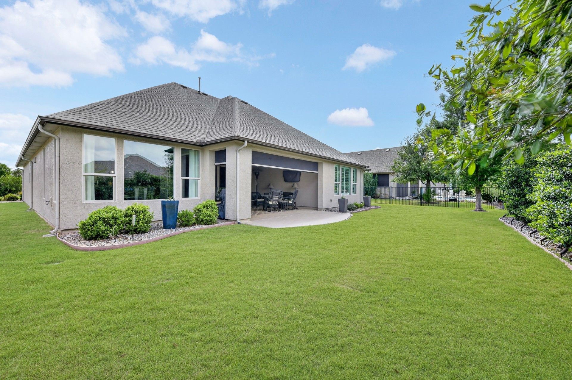 Get ready to fall in love with this stunning, award-winning Aubrey floor plan, perfectly positioned with desirable north-south exposure and packed with upscale upgrades at every turn. From the moment you step inside, the rich, wood-look porcelain tile flooring sets the tone for a home that is both elegant and inviting. The expansive open-concept great room—complete with a custom built-in entertainment center and dramatic center-opening sliding doors—seamlessly connects to a true gourmet kitchen. Here, you’ll find high-end custom cabinetry with pull-out drawers, soft-close maple dovetail construction, premium ovens, a chef’s gas cooktop, a generous wraparound island, under-cabinet lighting, upgraded granite, and a spacious walk-in pantry that makes both everyday living and entertaining a dream. The private primary suite is serene and features a cozy sitting area and a spa-inspired ensuite with dual vanities, abundant storage, and two generously sized walk-in closets and one with custom built-ins. Guests will feel right at home in their own bedroom with an ensuite bath and walk-in closet. Just off the great room, a large flex space offers endless possibilities—perfect for a home office, media room, craft space, or game room. A thoughtfully designed utility room offering a sink, extra cabinetry, and space for an additional refrigerator or freezer. The upgraded three-car garage is equally impressive, featuring an epoxy-finished floor, attic storage with lift, and a convenient side yard door. Step outside to your extended covered patio—complete with motorized screens—overlooking a peaceful greenbelt. Additional highlights include plantation shutters, elegant crown molding and baseboards, LED landscape lighting, a 12-zone irrigation system, and a Class 4 impact-resistant roof installed in July 2024. This move-in ready home offers the perfect blend of luxury, comfort, and functionality—plus the incredible lifestyle and amenities that make Robson Ranch so sought after.
