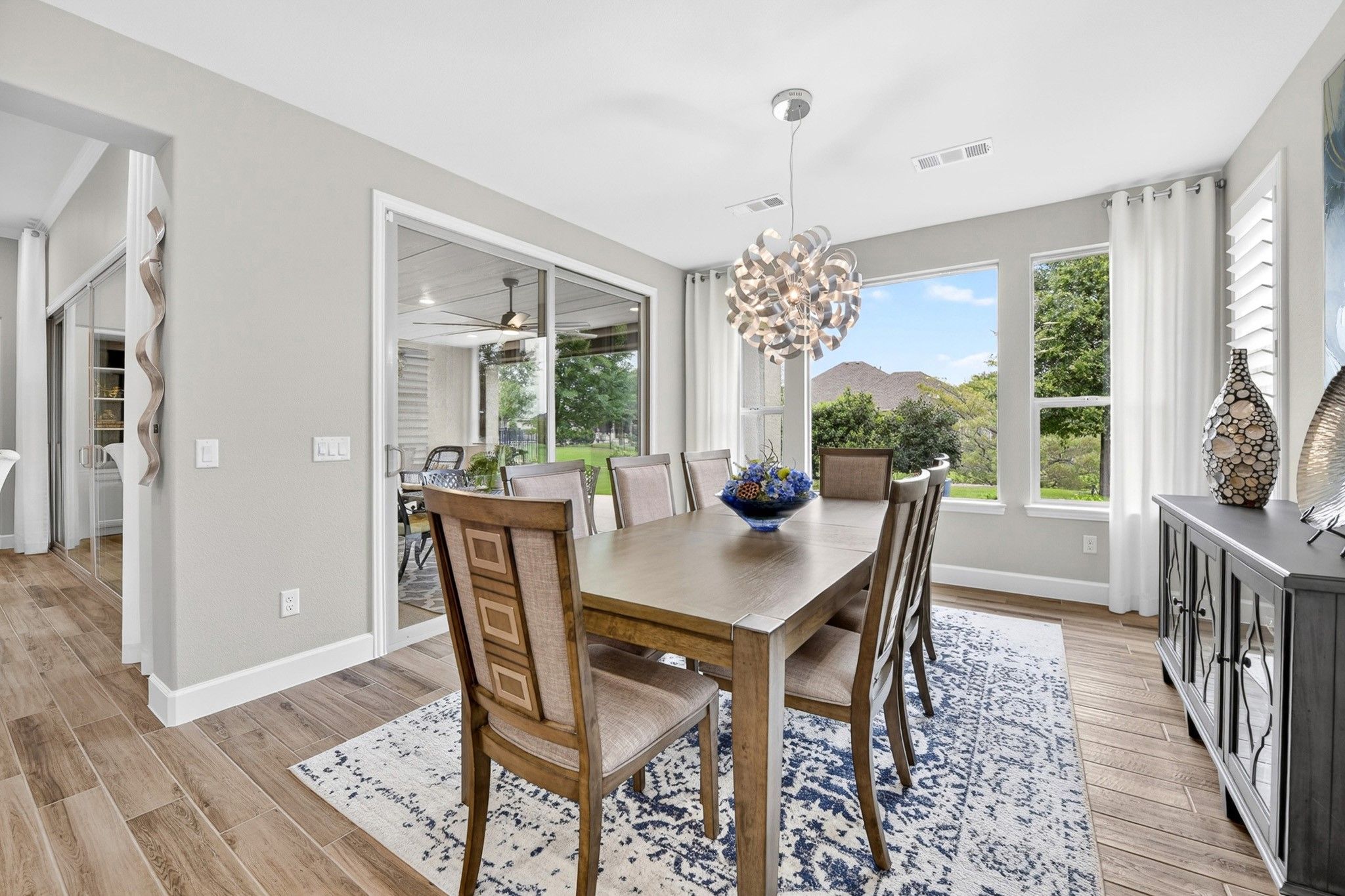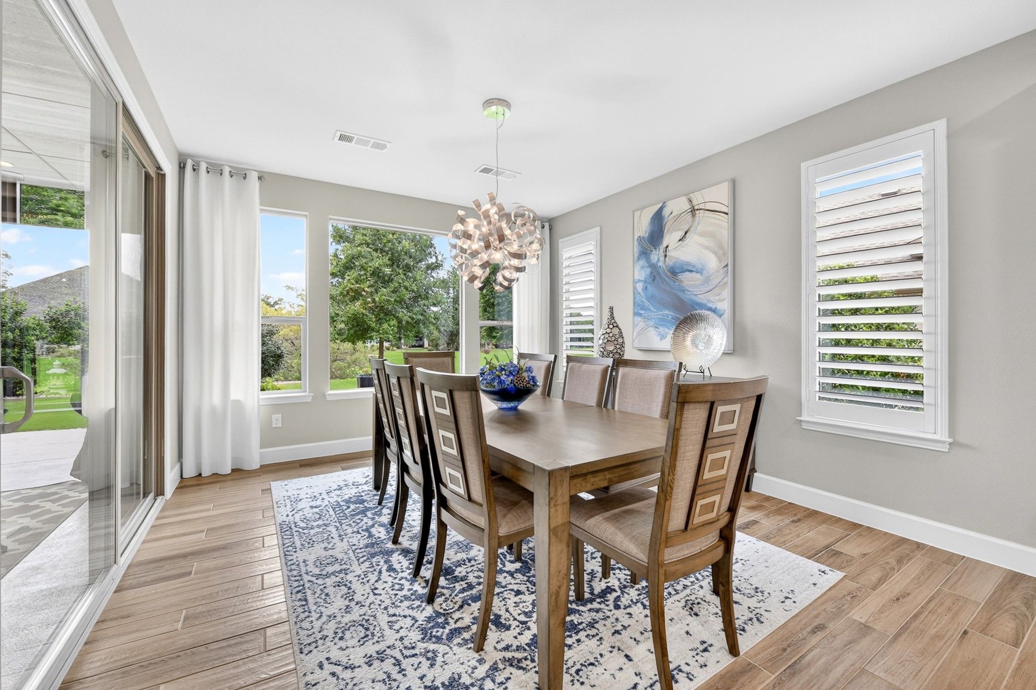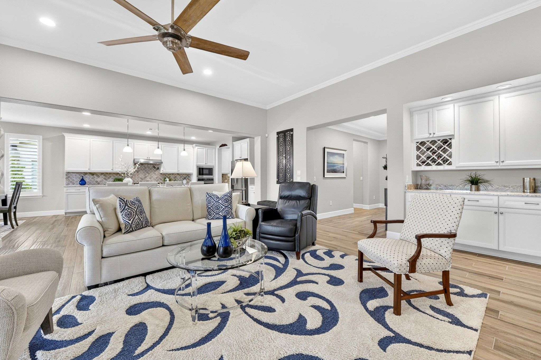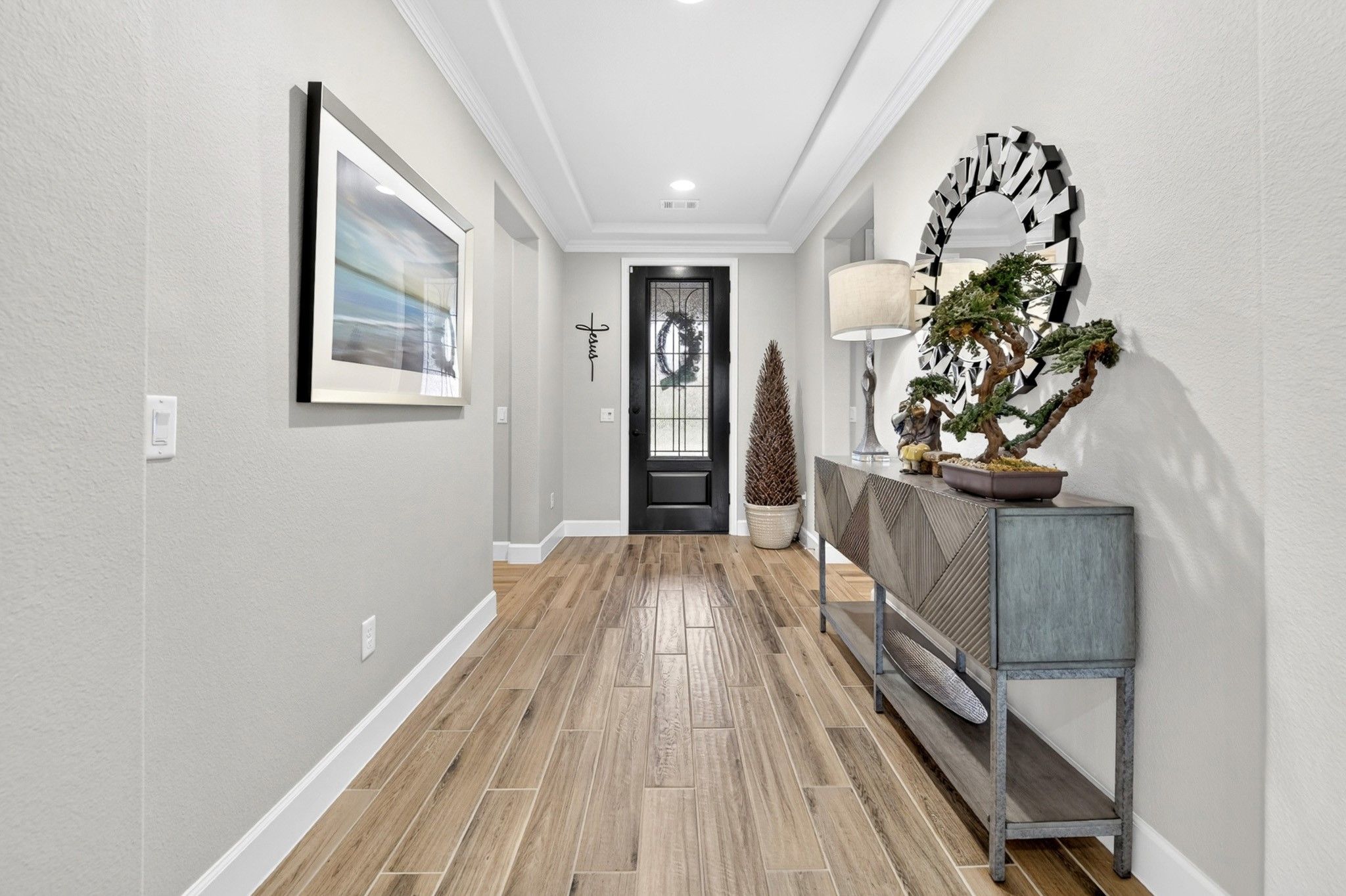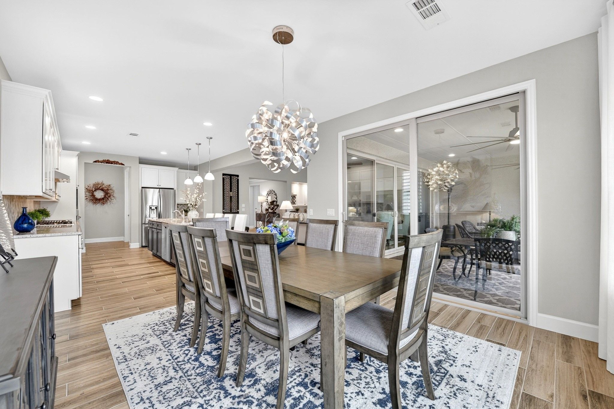 Get ready to fall in love with this stunning, award-winning Aubrey floor plan, perfectly positioned with desirable north-south exposure and packed with upscale upgrades at every turn. From the moment you step inside, the rich, wood-look porcelain tile flooring sets the tone for a home that is both elegant and inviting. The expansive open-concept great room—complete with a custom built-in entertainment center and dramatic center-opening sliding doors—seamlessly connects to a true gourmet kitchen. Here, you’ll find high-end custom cabinetry with pull-out drawers, soft-close maple dovetail construction, premium ovens, a chef’s gas cooktop, a generous wraparound island, under-cabinet lighting, upgraded granite, and a spacious walk-in pantry that makes both everyday living and entertaining a dream. The private primary suite is serene and features a cozy sitting area and a spa-inspired ensuite with dual vanities, abundant storage, and two generously sized walk-in closets and one with custom built-ins. Guests will feel right at home in their own bedroom with an ensuite bath and walk-in closet. Just off the great room, a large flex space offers endless possibilities—perfect for a home office, media room, craft space, or game room. A thoughtfully designed utility room offering a sink, extra cabinetry, and space for an additional refrigerator or freezer. The upgraded three-car garage is equally impressive, featuring an epoxy-finished floor, attic storage with lift, and a convenient side yard door. Step outside to your extended covered patio—complete with motorized screens—overlooking a peaceful greenbelt. Additional highlights include plantation shutters, elegant crown molding and baseboards, LED landscape lighting, a 12-zone irrigation system, and a Class 4 impact-resistant roof installed in July 2024. This move-in ready home offers the perfect blend of luxury, comfort, and functionality—plus the incredible lifestyle and amenities that make Robson Ranch so sought after.