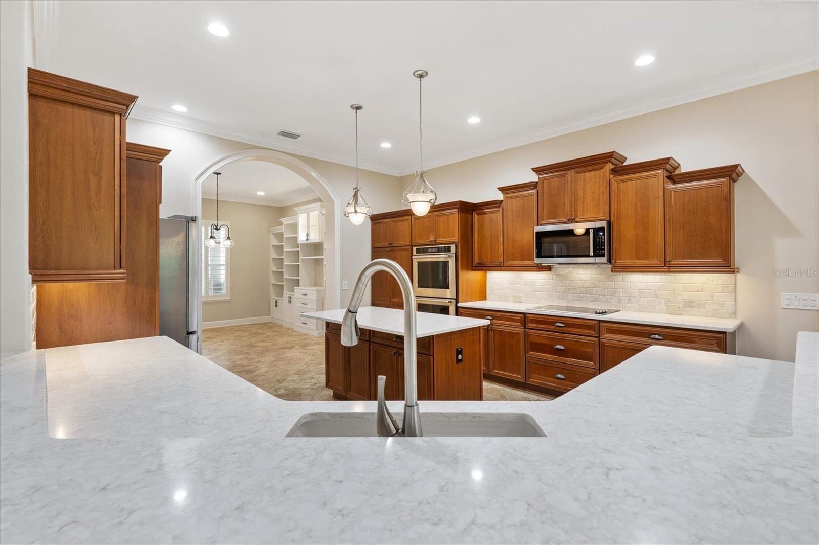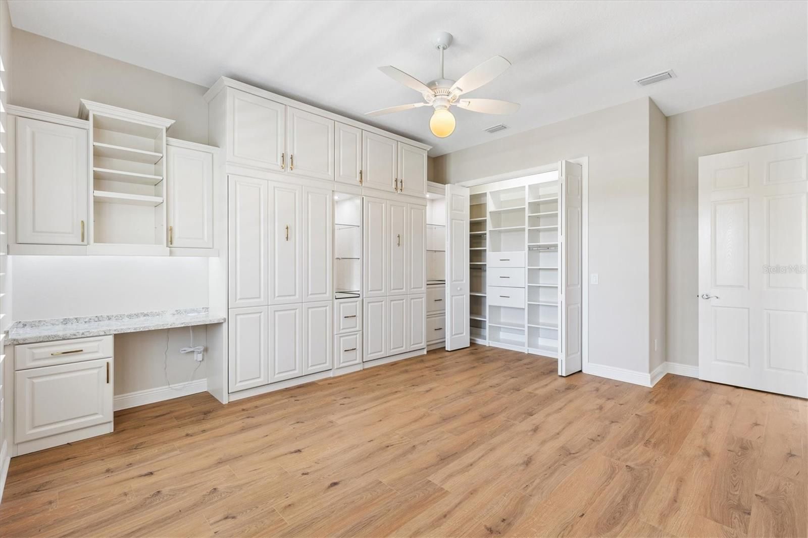 - Ceiling Fan(s), Crown Molding, Eat-in Kitchen, High Ceilings, Kitchen/Family Room Combo, Open Floorplan, Main Level Primary, Solid Surface Counters, Split Bedrooms, Stone Counters, Thermostat, Vaulted Ceiling(s), Walk-In Closet(s)