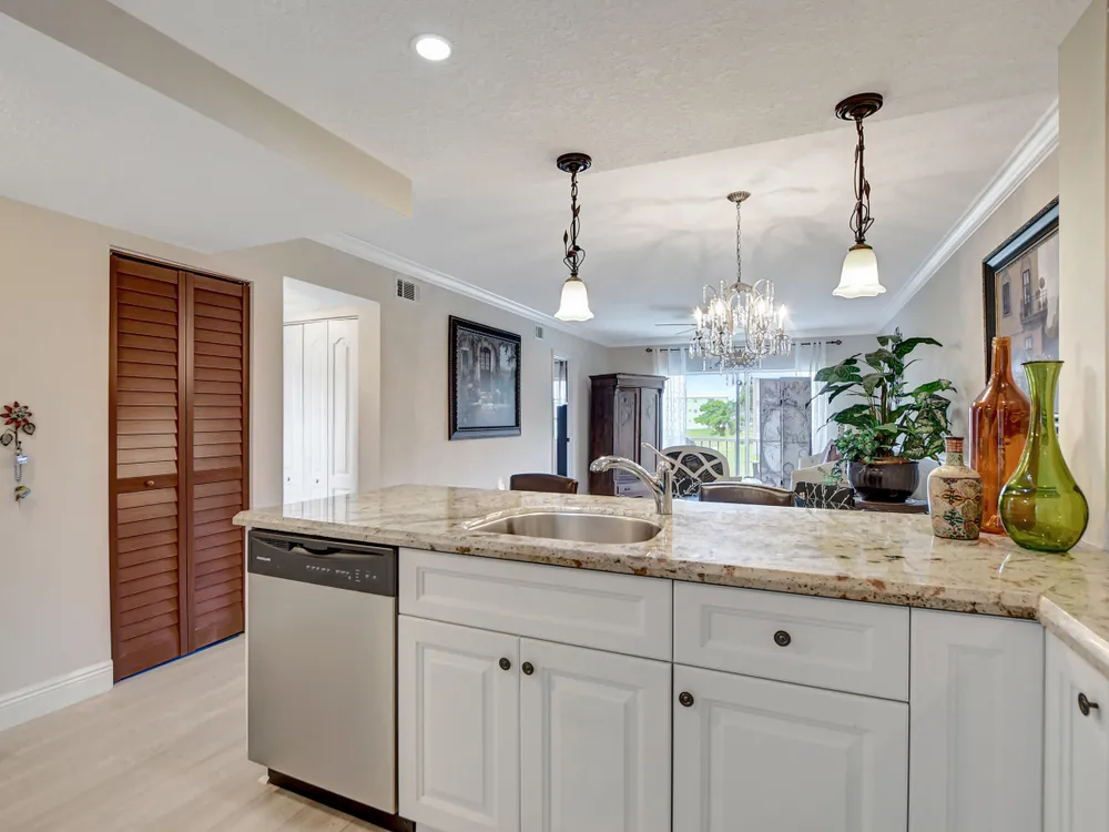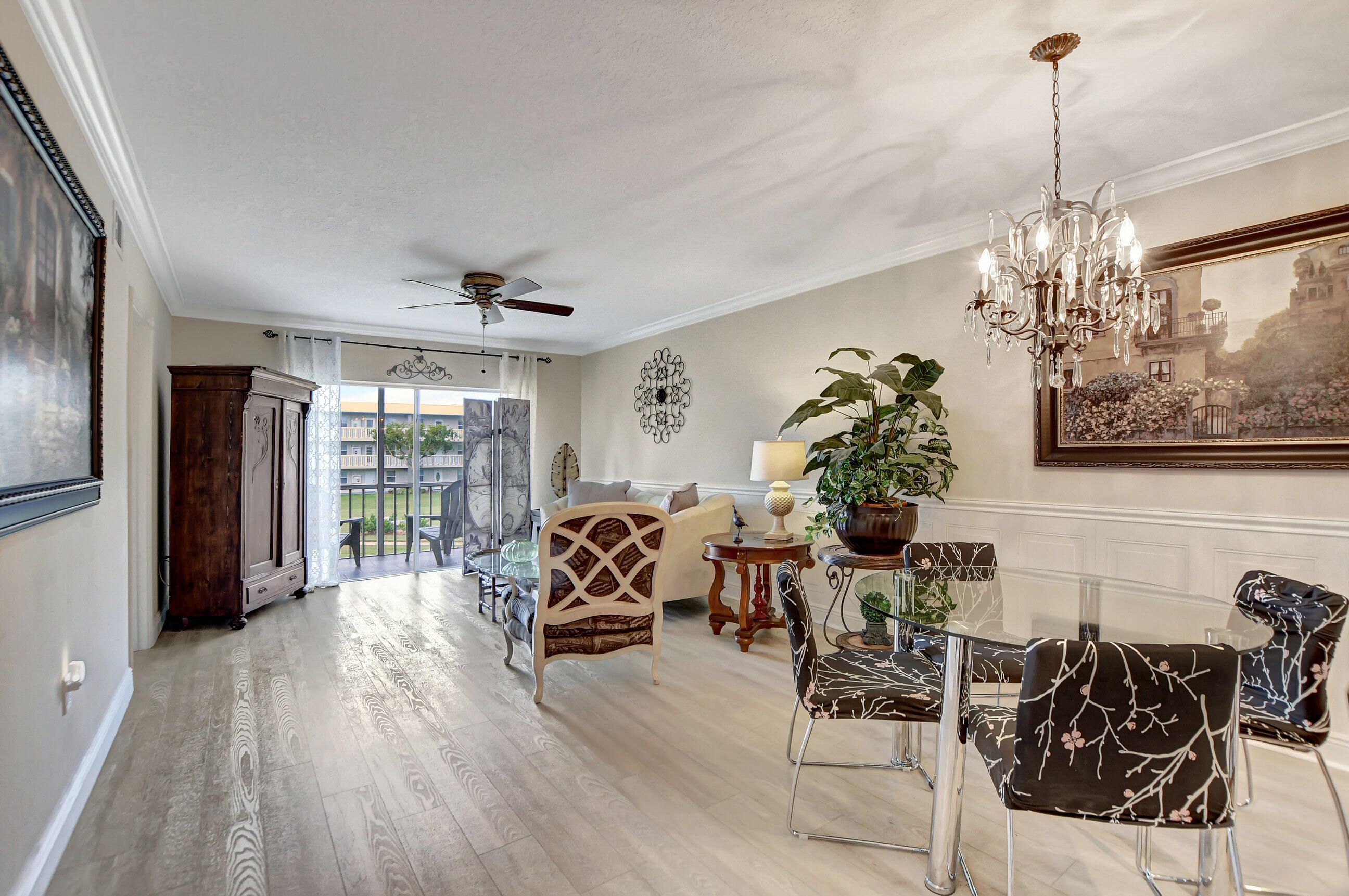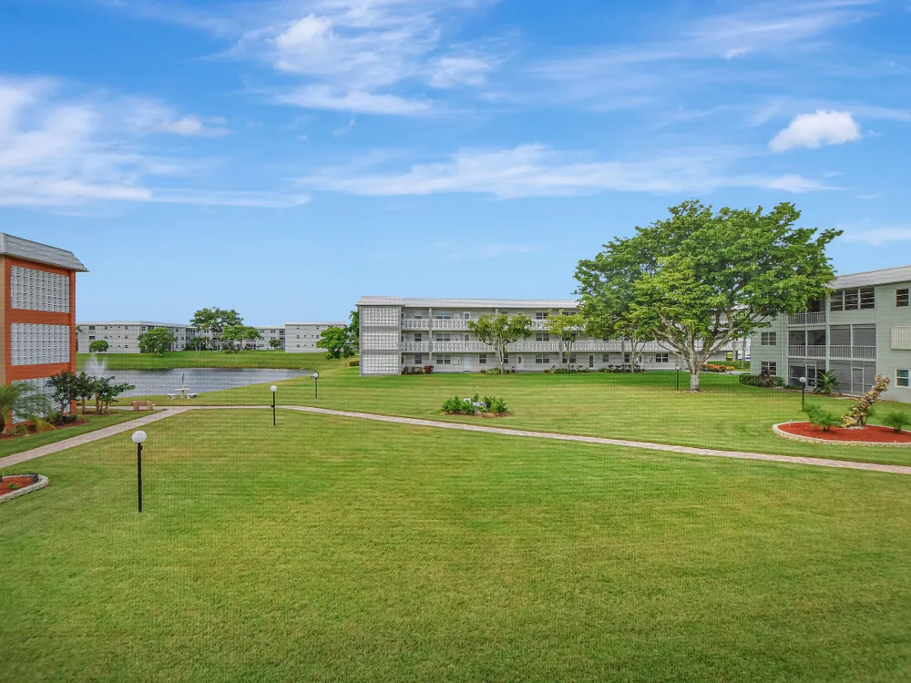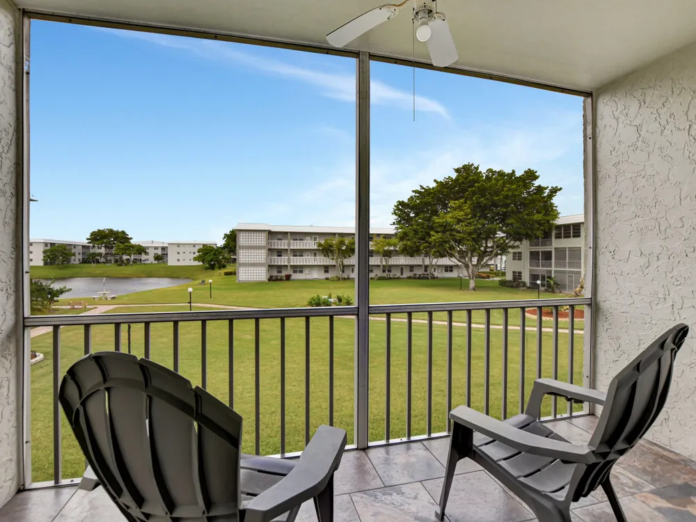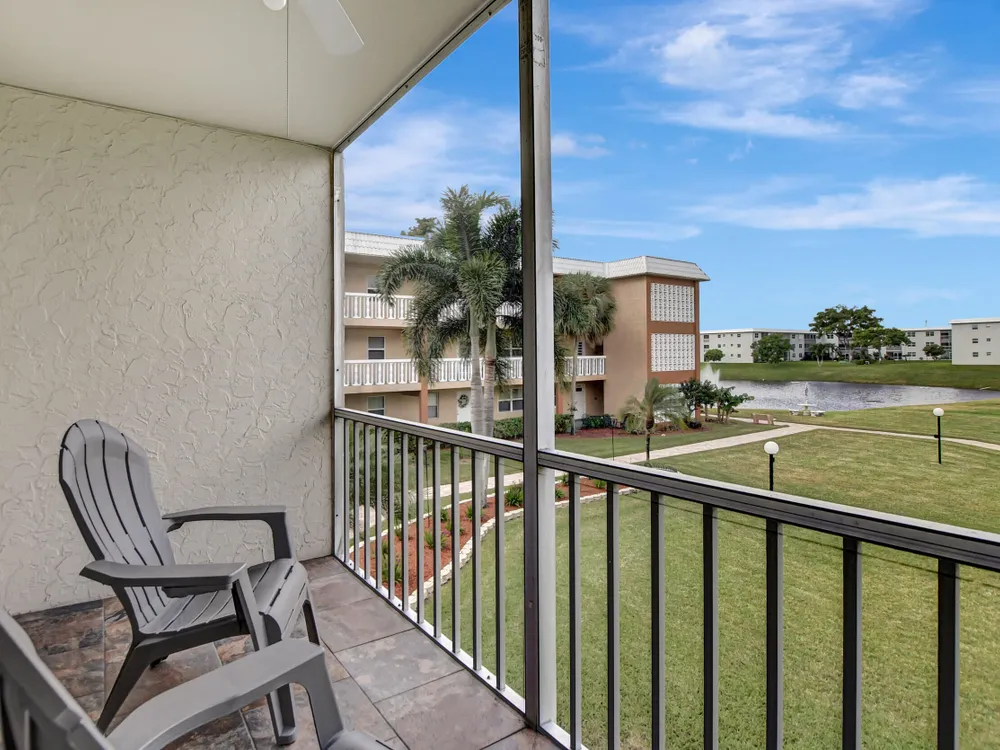Magnificently updated and maintained 2 bedroom, 2 bath corner unit overlooking the lake and garden beyond. State of the art saltwater pool. Pristine condition, gourmet kitchen with granite counters and stainless steel appliances. Kitchen open to the spacious great room with dining and living room areas. Screened patio where you can relax and enjoy the lake and garden beyond. Primary bedroom features a lavish bathroom with side pantries, shower and walk in closet. Wall of closets in beautifully appointed guest room. New AC March 2025, new floors Fall 2024, no carpet. Steps away from the community pool. Close to major roadways, shopping and 20 minutes to the beaches. Community is an active 55+ community. This exceptional unit is waiting for you! Florida living at its best!