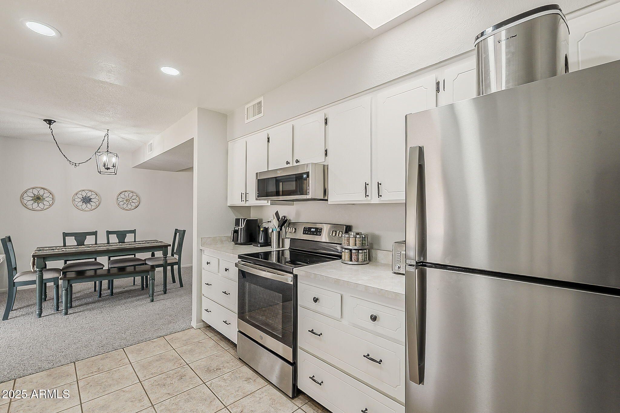 Immaculate Move-In Ready Condo/Twin Home! This beautifully maintained home offers 2 generously sized bedrooms, 2 spacious bathrooms, and a versatile 1.5-car garage—perfect for a vehicle and golf cart. Recent upgrades include a new A/C compressor (January, 2025), sleek stainless steel appliances, new carpeting, updated light fixtures, and low-maintenance desert landscaping in the front yard. Enjoy the open-concept great room and dining area, ideal for relaxing or entertaining. The tiled, screened-in back patio is perfect for enjoying peaceful evenings outdoors. Laundry is conveniently located in the garage. Personal property available under a separate bill of sale.