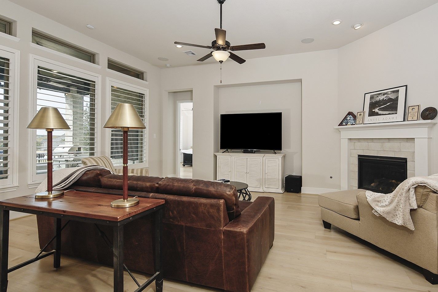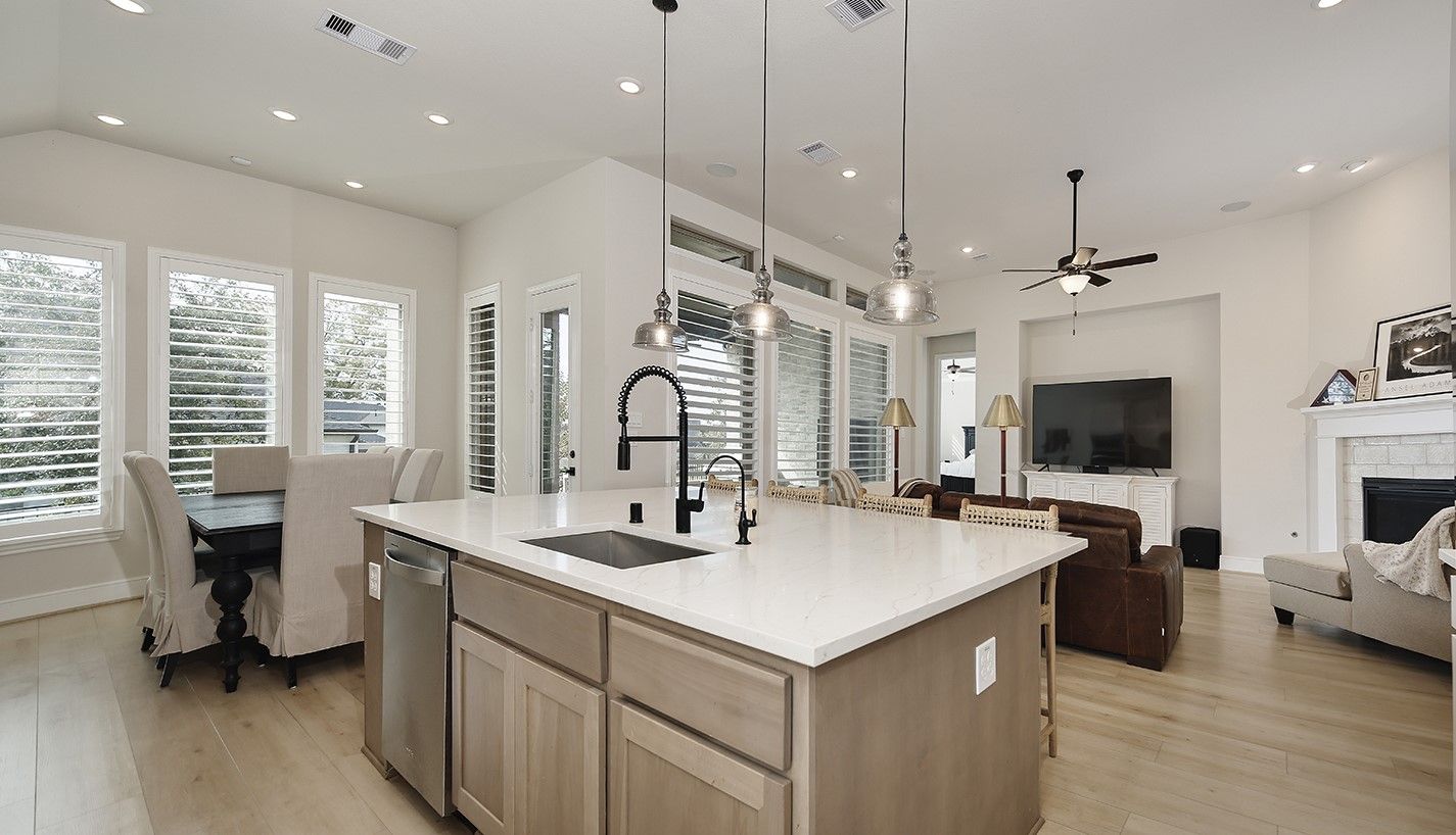 - Breakfast Bar, High Ceilings, Kitchen Island, Kitchen/Family Room Combo, Pantry, Quartz Countertops, Tub Shower, Walk-In Pantry, Wired for Sound, Window Treatments, Ceiling Fan(s), Programmable Thermostat