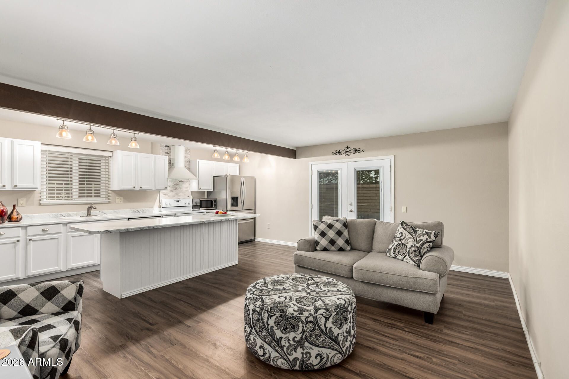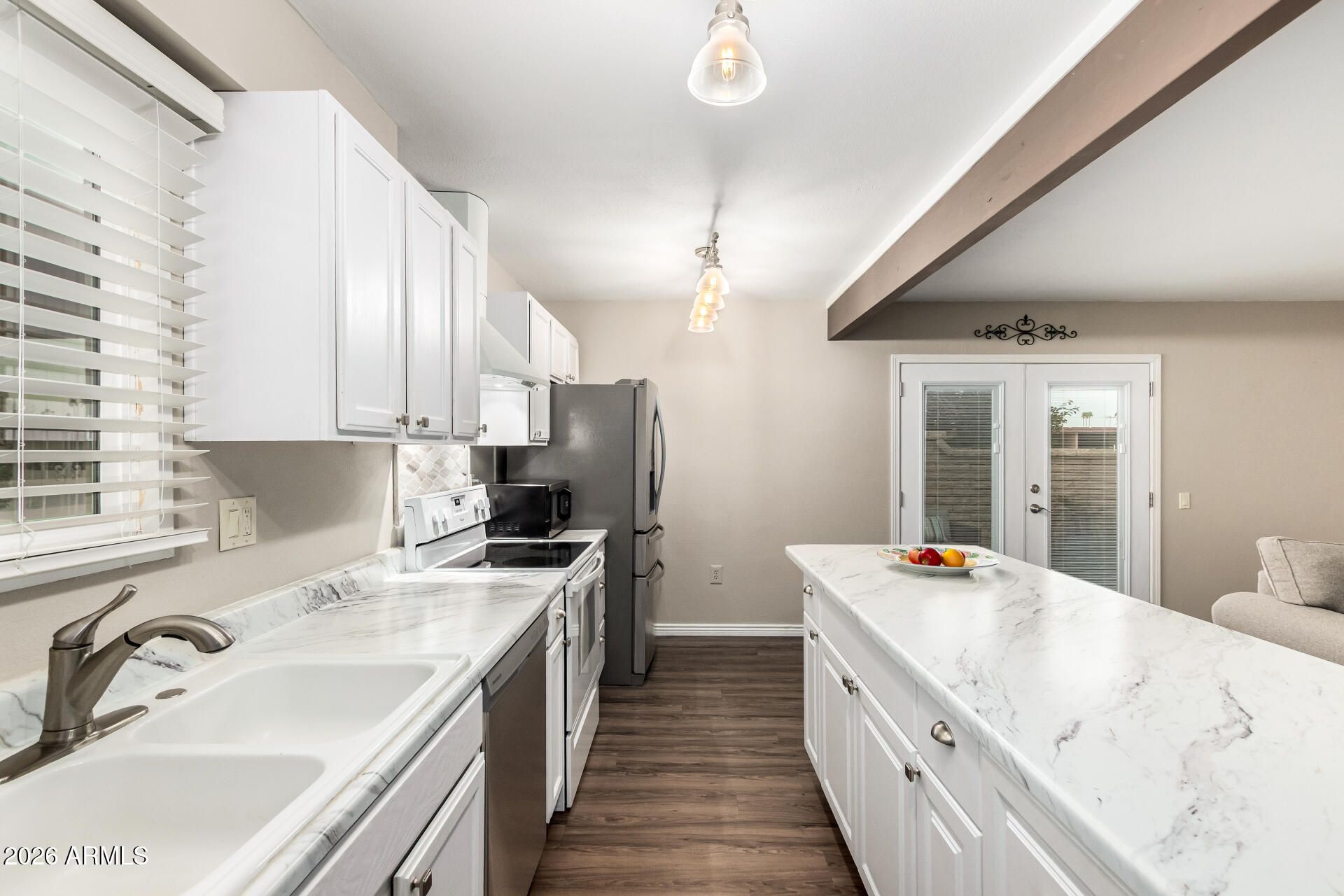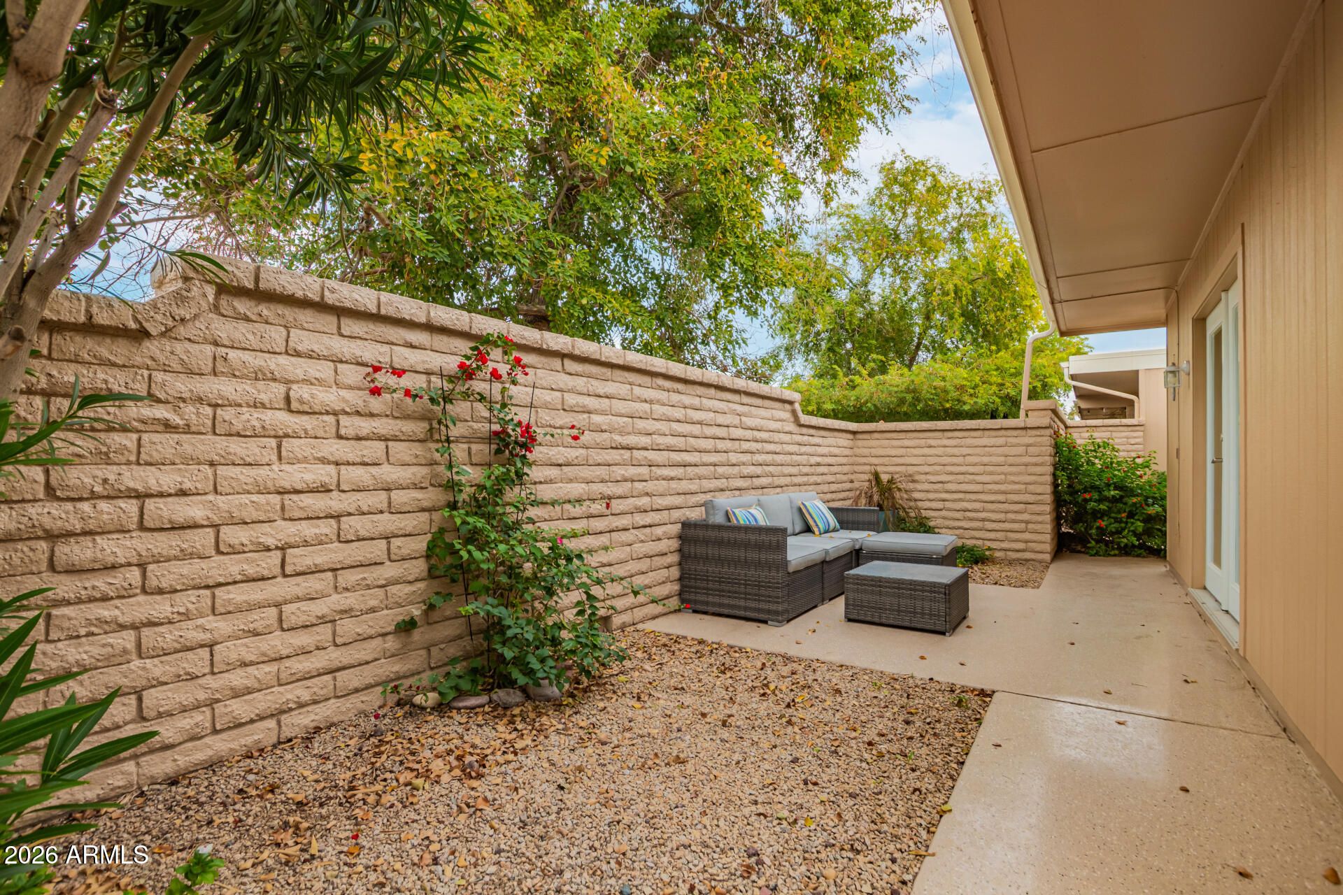 Very impressive! Stunning updated home with open concept living/kitchen. Huge kitchen island for entertaining. Stainless appliances, French doors to private patio off living room area. The Primary bedroom offers a dressing table area just off the walk in closet. Large primary bath with walk in shower too. Don't forget to look at the other private patio outside the French doors in the bedroom too! On the other end of the condo is a spacious guest room with walk in closet & another bath. Plenty of extra storage space in the laundry/ golf cart garage. This condo is very private & close to everything that Sun City has to offer.New roof & gutters & exterior paint.