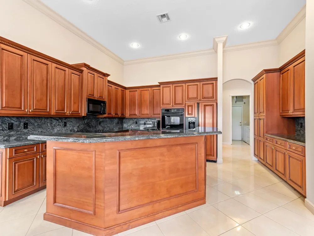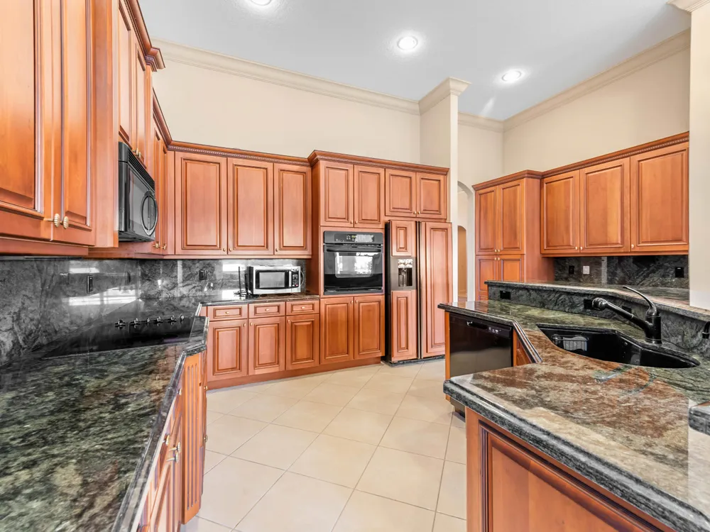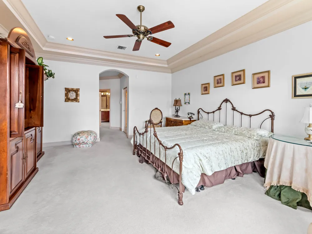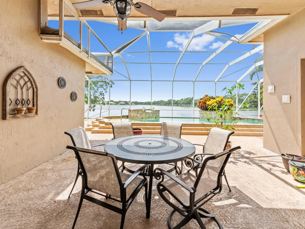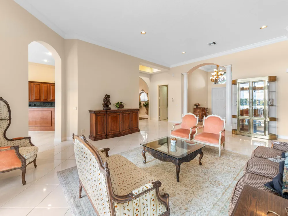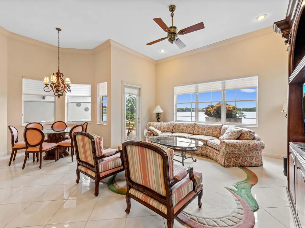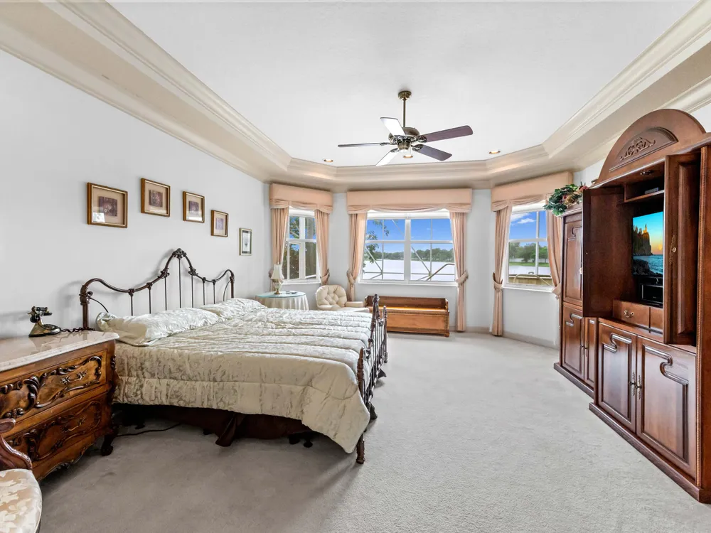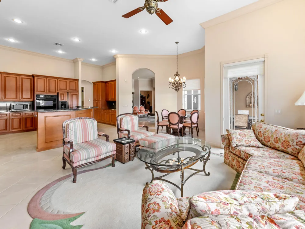 Discover your private oasis in the exclusive, resort-style community of Bellaggio. This stunning one-story lakefront home is perfectly situated on the best lot in the community, offering complete privacy on a quiet cul-de-sac and boasting panoramic, unbelievable lake views from almost every room.Offering 2,831 sq. ft. of living space, this residence features 4 bedrooms and 3 full bathrooms, providing plenty of room for both relaxation and entertaining. Step through impressive double entry doors into a welcoming foyer that sets the tone for the home's elegant design. The chef-inspired kitchen is both stylish and functional, boasting a cooktop, wall oven, microwave, refrigerator, granite countertops, a spacious island with bar seating, and abundant cabinetry.