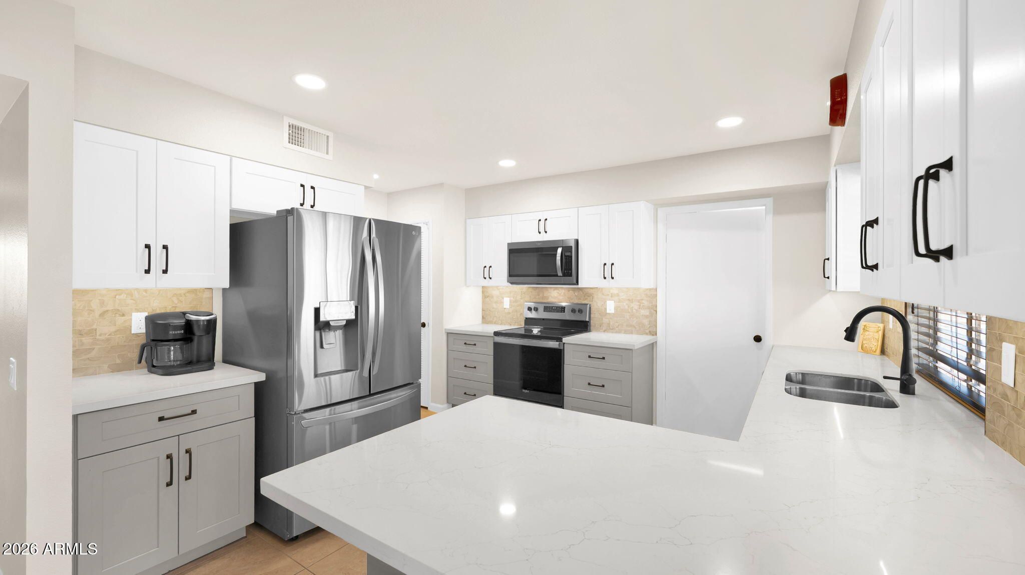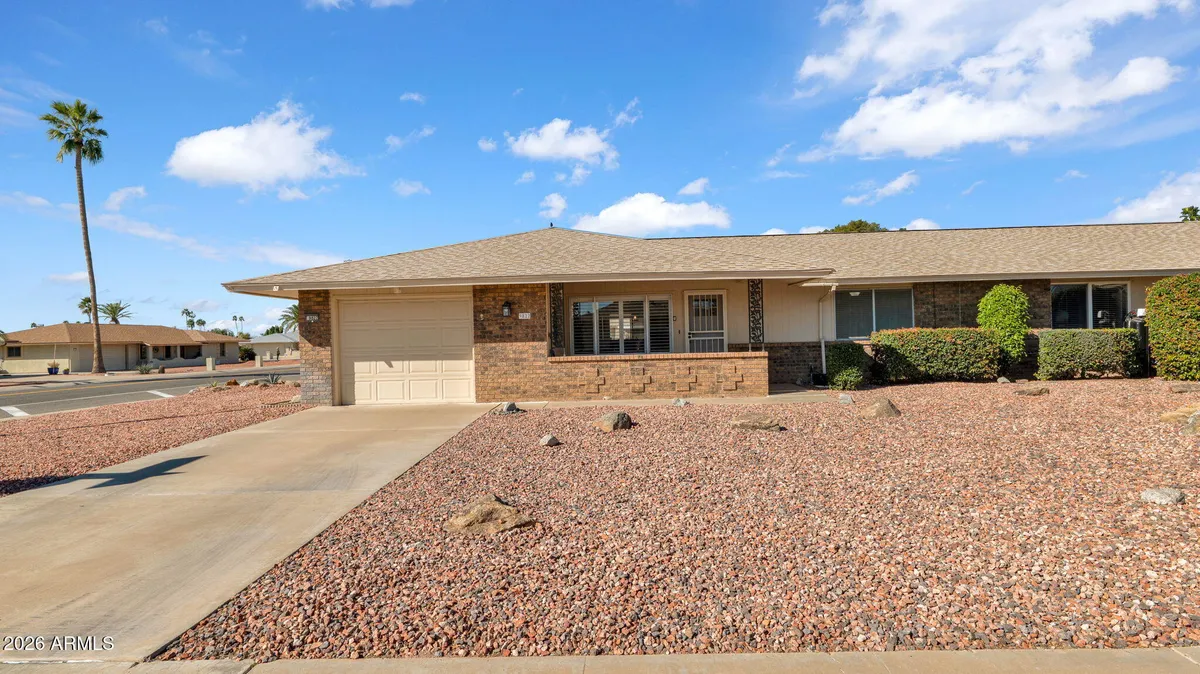 Beautifully updated duplex home in the heart of Sun City, AZ, 55+ community known for its active lifestyle and amenities. This move-in-ready home was only used for approximately 3 months after renovations, offering a like-new feel. Features include a fully remodeled kitchen with 2 toned soft close cabinetry, Quartz counters, new stainless steel appliances, hardware, & new recessed can lighting. The bathrooms remodeled with new cabinetry, Quartz counters, hardware, fixtures. New interior paint including ceilings, new interior doors and hardware, updated fixtures throughout. Improvements also include pigtailed wiring, new outlets & switches and 20'' deep blown-in insulation above the garage and laundry room for added efficiency. Stylish, low-maintenance, and truly turn key!
