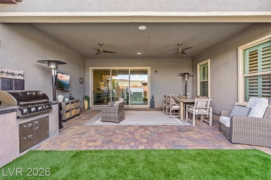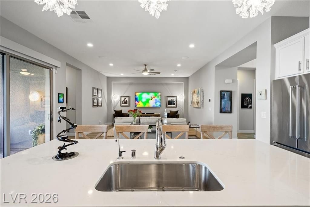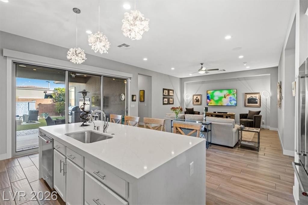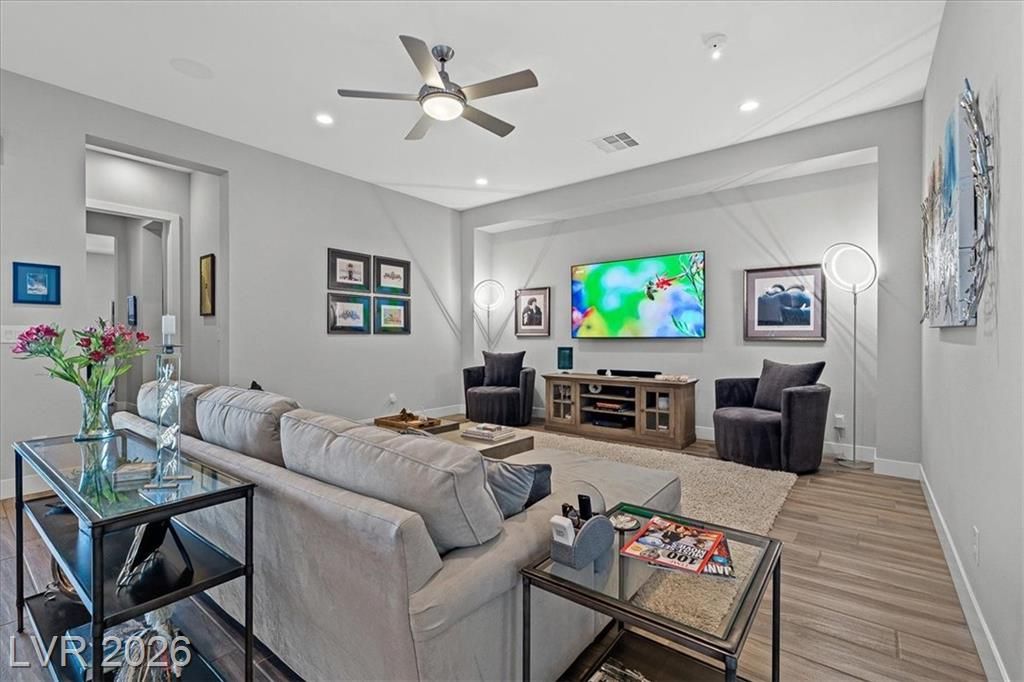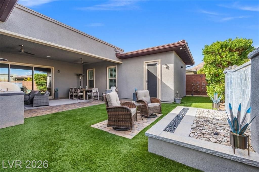Summerlin Stunner in Prestigious Guard-Gated Regency at Summerlin! Experience active-senior living at its finest in this upgraded, Newer 1 Story home perfectly positioned on Summerlin’s coveted West side. Residents enjoy exclusive, resort-style amenities designed for an elevated lifestyle. This captivating home offers model like perfection, versatile layout & showcases a highly sought-after floor plan with 2 primary suites. A picturesque mountain backdrop greets you as you enter enhanced by stylish modern finishes & thoughtful upgrades t/o 2,267sqft of living space ~ 3 bedrooms, 3 full baths, front den/office/dining room. At the heart of the home, an Elite Island Kitchen w/ High-End Appliances takes center stage while overlooking a spacious great room, perfect for relaxation. Natural light pours in through a 12’ multi-slide glass door creating a seamless transition to ideal indoor/outdoor living as you step outside to enjoy a tastefully designed outdoor retreat and west-valley ambiance
