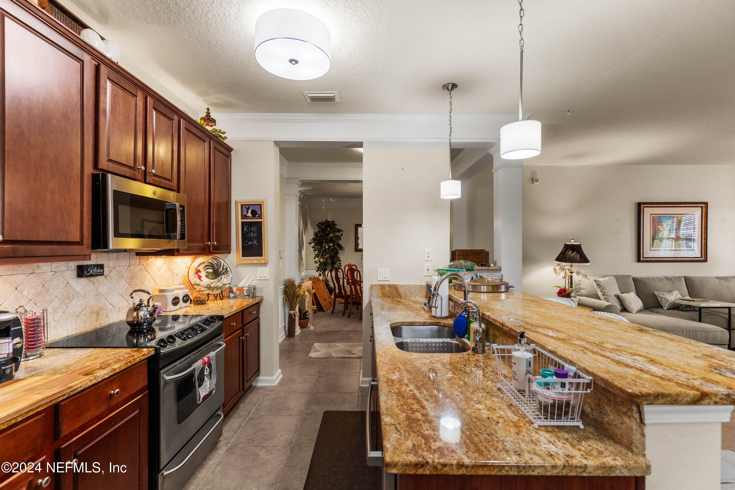 Beautiful CONCRETE BLOCK 3 bedroom 2 bath home with over 2000 sq ft condo at Upscale Sweetwater by Del Webb Active Adult Community. NO CDD!, Located on the 3rd Floor with lovely private entrance and elevators. 9 ft ceilings, 8ft interior doors, 42 in top of line cabinets, designer lighting, neutral colors, Wonderful Bar seating, breakfast dining, and formal dining room. Fabulous Open floor plan with great for entertaining living room and Screened Balcony for morning coffee. Spacious Owner's Suite with Dual Vanity, Garden Tub, large shower, big walk in closet. Impressive Sweetwater Community with lush trees, walking trails, Incredible Club house with indoor and outdoor pools, Spa, Tennis, Pickleball, Great Fitness Studio, Billiards Room, Arts & Crafts Room, Business Center, and tons of Planned Activities and More! Best Centrally Located to everything in Jax! Very secure gated community & Sandpiper condo has extra security, A perfect place to call Home Sweet Home!