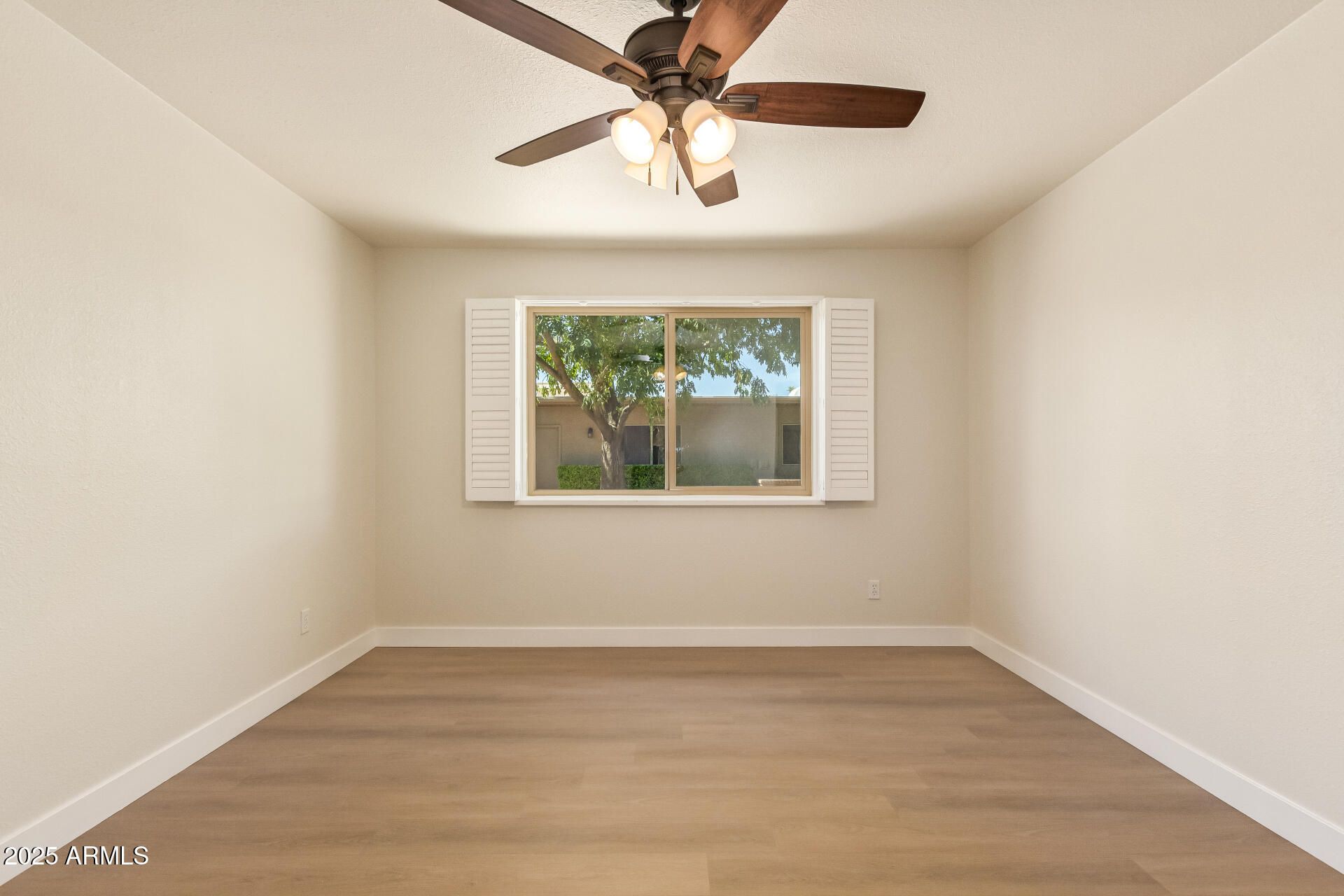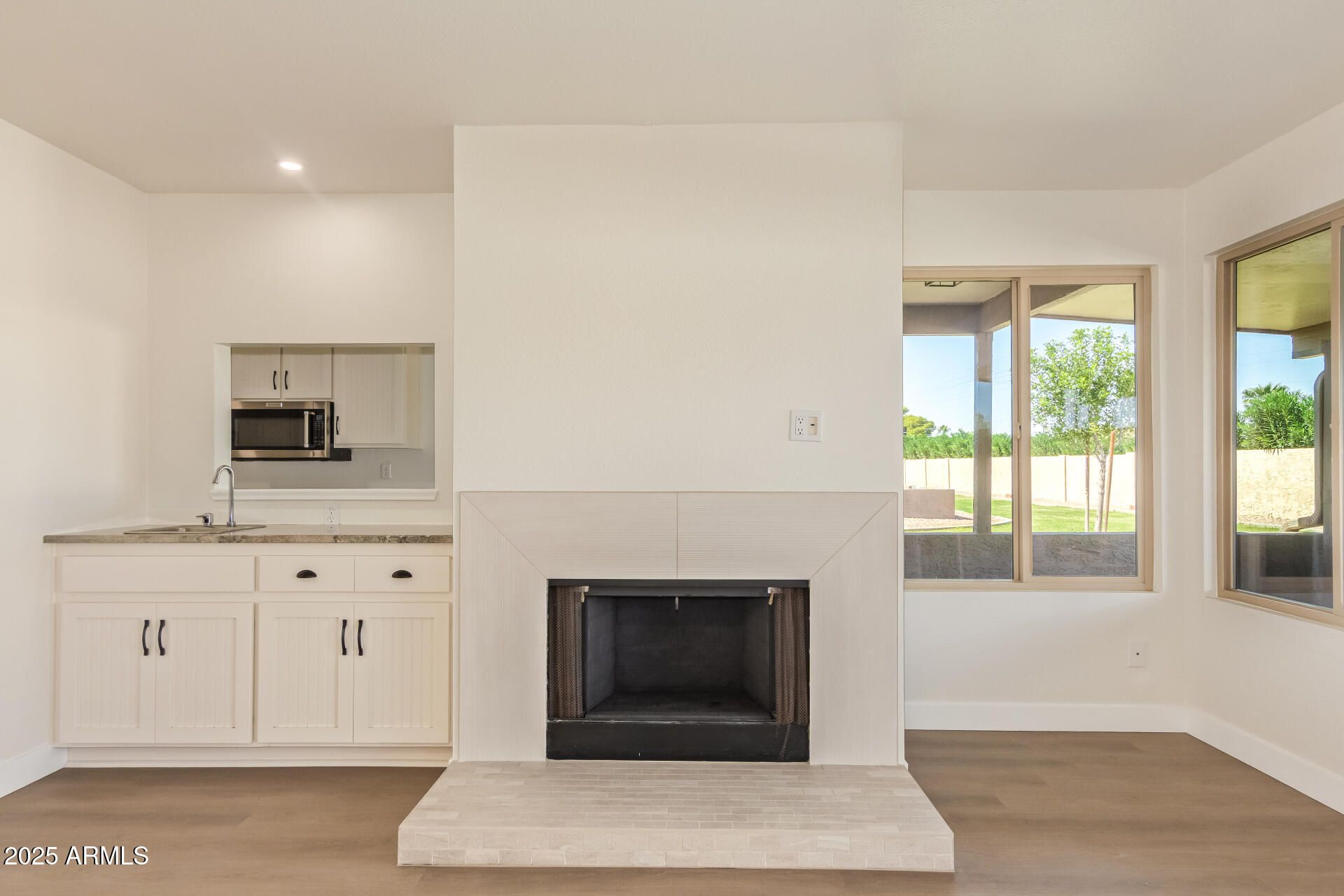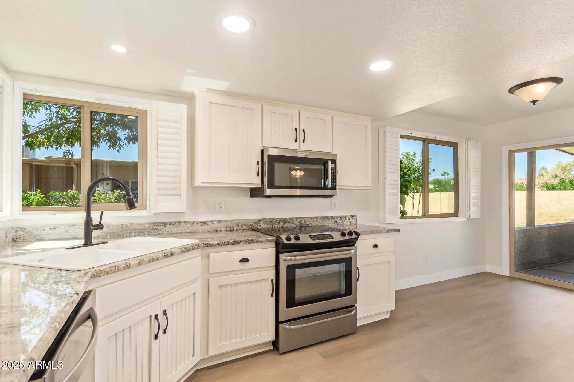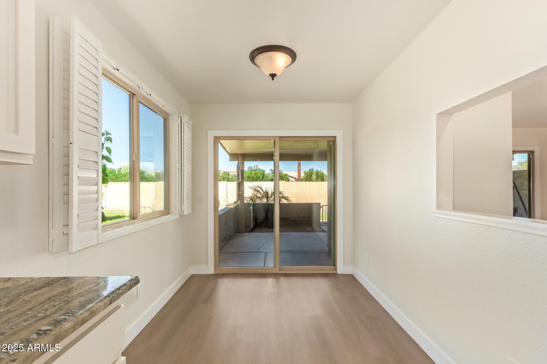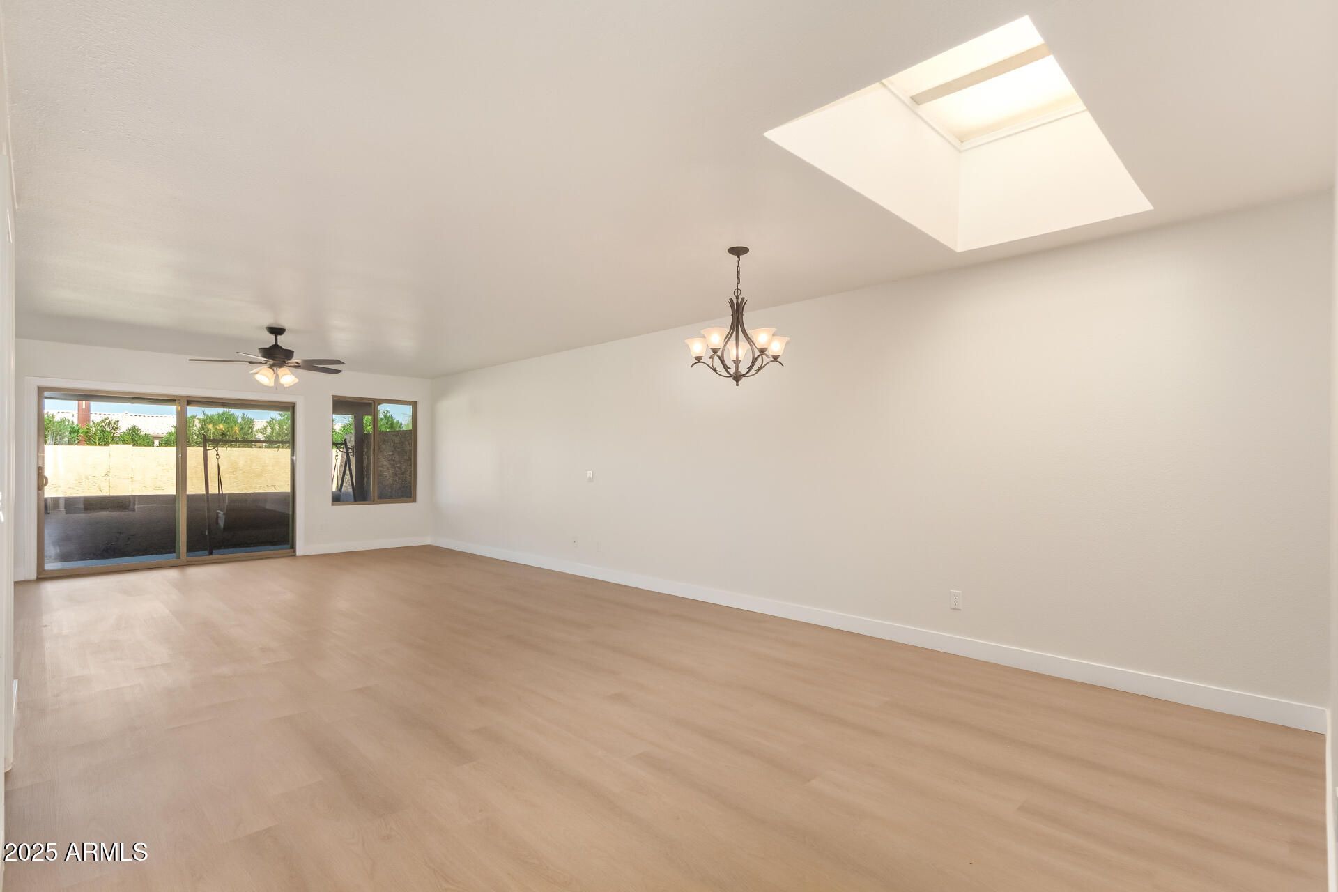 Charming Sun Lakes 55+ Townhome - Tastefully Updated & Move-In Ready! This end-unit townhome features 2-bedrooms, 2-bathrooms, and a 2-car garage with built-in cabinetry. Upgrades list available upon request. This residence is designed for comfort, style, and convenience. Resort-style community amenities include a clubhouse and social activities, swimming pools, a spa, and fitness centers, golf courses, tennis, and pickleball courts, walking paths, green spaces, and much more! Interior highlights include an inviting open floor plan with modern finishes, new laminate flooring throughout the entire home, updated recessed lighting, abundant natural light from the large windows, a skylight, and plantation shutters allow sunlight to fill the space, giving each room a cheerful, airy feel. Don't' forget about the spacious living room featuring a wood-burning fireplace, a wet bar, perfect for entertaining friends & family, and sliding glass doors that connect seamlessly to the backyard. The eat-in kitchen boasts SS appliances, granite countertops, lots of white cabinetry, recessed lighting, and a picture-perfect window with views of the gorgeous common areas. The large primary bedroom is equipped with a large closet, and a gorgeous ensuite bathroom with dual vanities, granite countertops, and a tiled shower from floor to ceiling with rolling glass doors (updated 2025). The remaining bedroom is ample size and shares the hallway bathroom. This bathroom was also remodeled in 2025. The laundry room is located inside. This fantastic townhome combines effortless elegance with the ease of low-maintenance living. Make this move in the Sun Lakes retreat your next home and embrace the vibrant, active lifestyle you deserve! Welcome home!