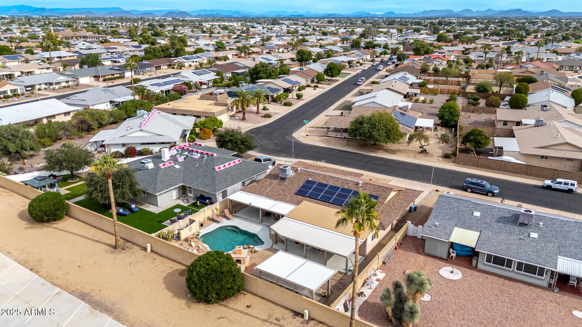 Beautifully updated single level home in Sun City 55+ community! This move-in ready 3 bed, 2 bath home features with tile & wood flooring throughout. Spacious eat in kitchen with peninsula island. Large 2-car garage + golf cart parking/workshop space. Oversized laundry room with extra storage. Enjoy a private backyard with no homes behind, backing to the church property. Relax in your sparkling pool with waterfall, plus covered patio and low maintenance landscaping. Perfect for Arizona outdoor living. Owned Solar keeps electric bills low! Close to golf courses, recreation centers, shopping, medical, restaurants & lifestyle amenities. This is the easy-living Arizona home you've been searching for!