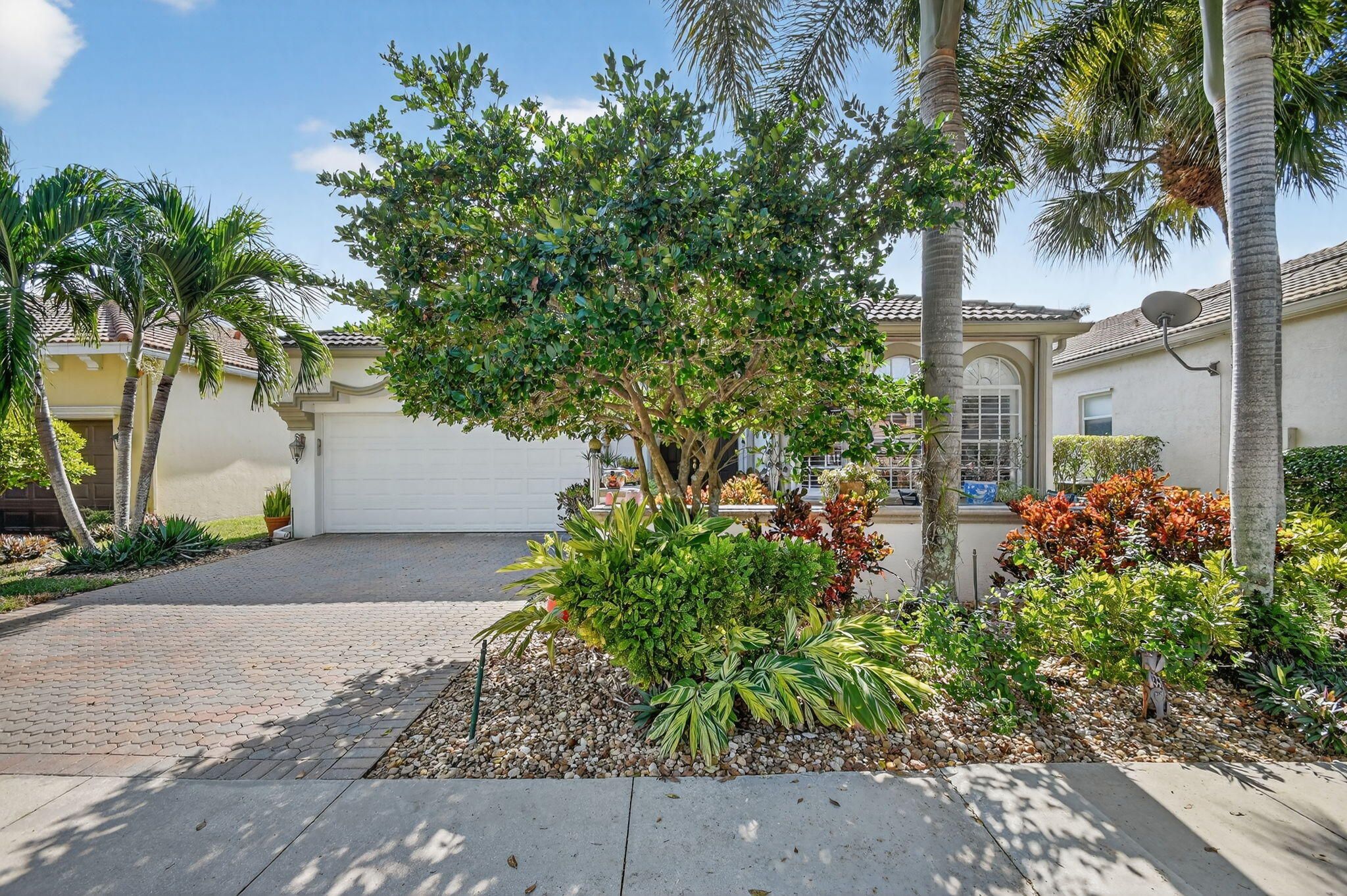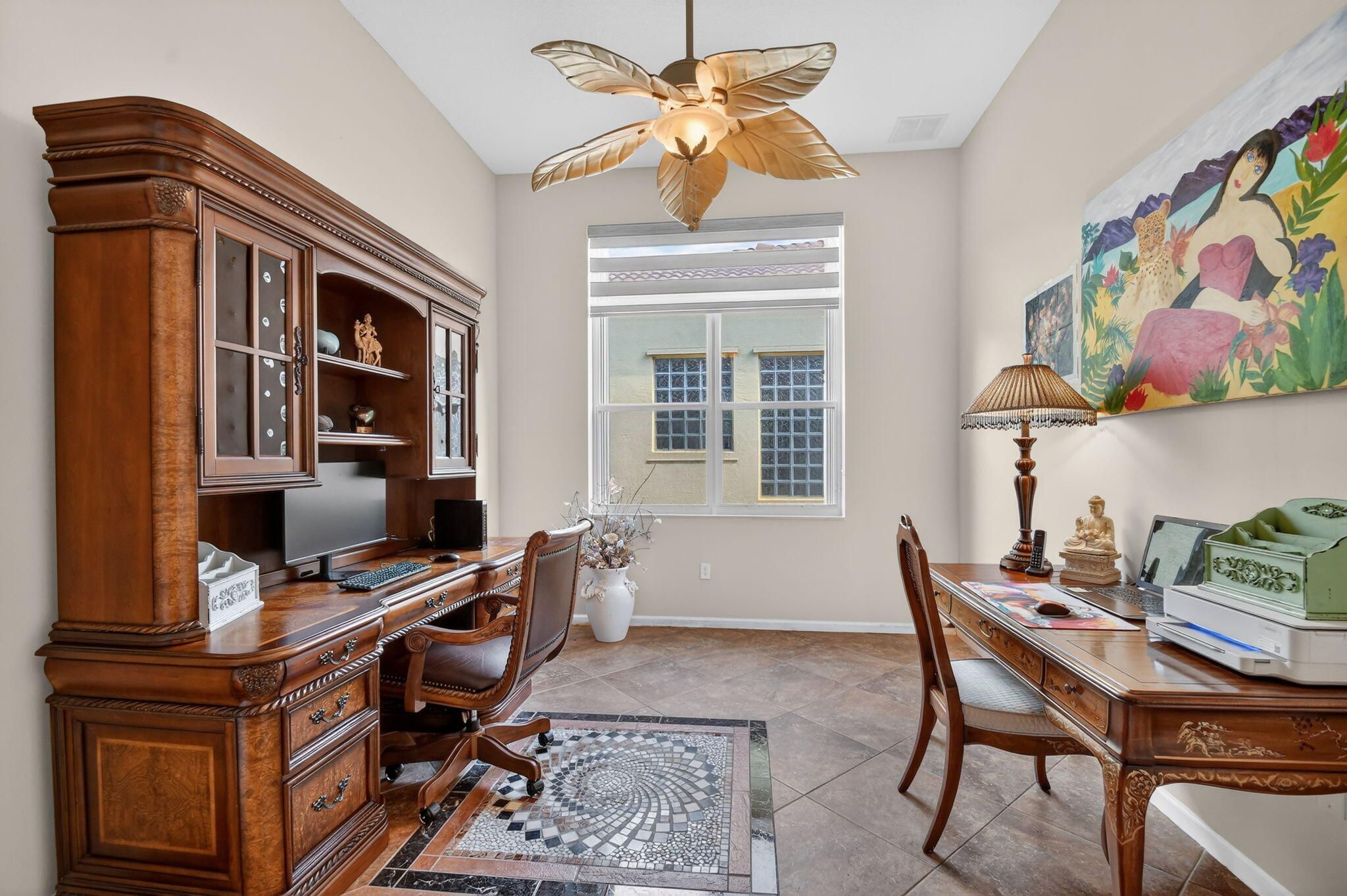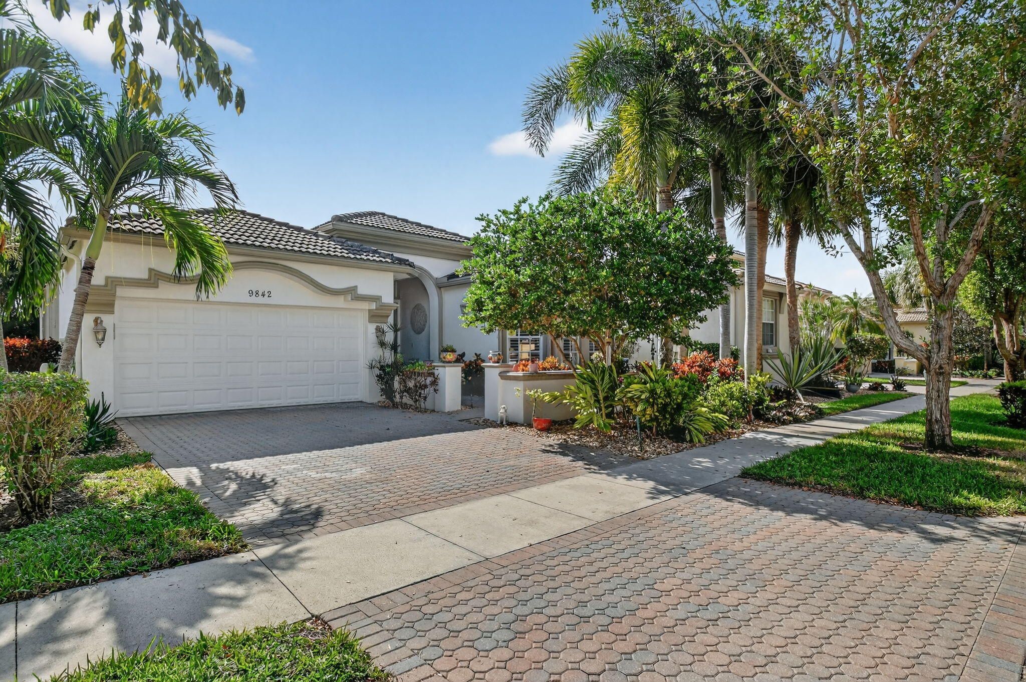 An elevated and tastefully designed home is now available in Buena Vida, Wellington's only single family 55 Plus resort style community. This beautifully appointed residence offers 2 bedrooms, 2.5 baths, a den or office, a screened covered patio, and a two car garage, all set on a private water and preserve lot. The spacious 2,365 square foot living area showcases curated, elegant finishes throughout. A welcoming foyer features 12 foot coffered ceilings and a decorative mosaic inlaid tile entry with geometric and circular motifs, which is echoed at the den or office entry. Ceramic flooring flows seamlessly throughout the home, enhancing its open and cohesive design. This model offers multiple areas for entertaining, including formal living and dining spaces, as well as an open - family room and kitchen layout. Artisan inspired tile accents add character and visual interest in the formal dining area, primary bath, second bath, and guest half bath. The chef's kitchen is designed for both function and style, featuring a spacious island, newer stainless steel appliances, granite countertops, tiled backsplash, wood cabinetry, a walk in pantry, and a sunny breakfast area. The primary suite offers a sophisticated and serene retreat with a sitting area, double closets with custom built ins, and a well appointed ensuite bath with soaking tub, double vanities, and a tiled glass enclosed shower. A versatile second bedroom with ensuite bath is located at the front of the home and can easily serve as a second primary suite. Plantation shutters and thoughtful design details create another peaceful private space. The covered and screened patio overlooks lush landscaping, providing a secluded setting ideal for quiet mornings or relaxing afternoons. Additional highlights include $20K in high end light fixtures and finishes throughout, stunning window treatments, a water filtration system added in 2022 ,5 ton air conditioning system installed in 2023, and accordion shutters for storm protection in 2016. Buena Vida offers resort style amenities including two pools and spa, poolside cabanas, a fitness center, steam room, card rooms, library, grand ballroom, and an outstanding sports complex with pickleball and tennis. The HOA includes landscape maintenance, lake water irrigation for your lot, power washing of driveways and walkways, Xfinity cable and internet up to 500 Mbps, a 24 hour manned gate, and an annual 500 dollar café dining allowance. The location is exceptional, just 15 minutes to Palm Beach International Airport, approximately 9 miles to the beaches, and about 20 minutes to the Polo Grounds and Winter Equestrian Festival. Buena Vida is ideally situated to enjoy South Florida living, from dining and boutique shopping to cultural attractions. Experience the good life at Buena Vida in Palm Beach County.