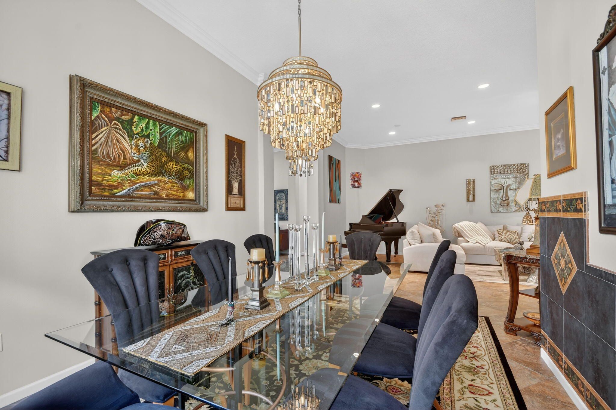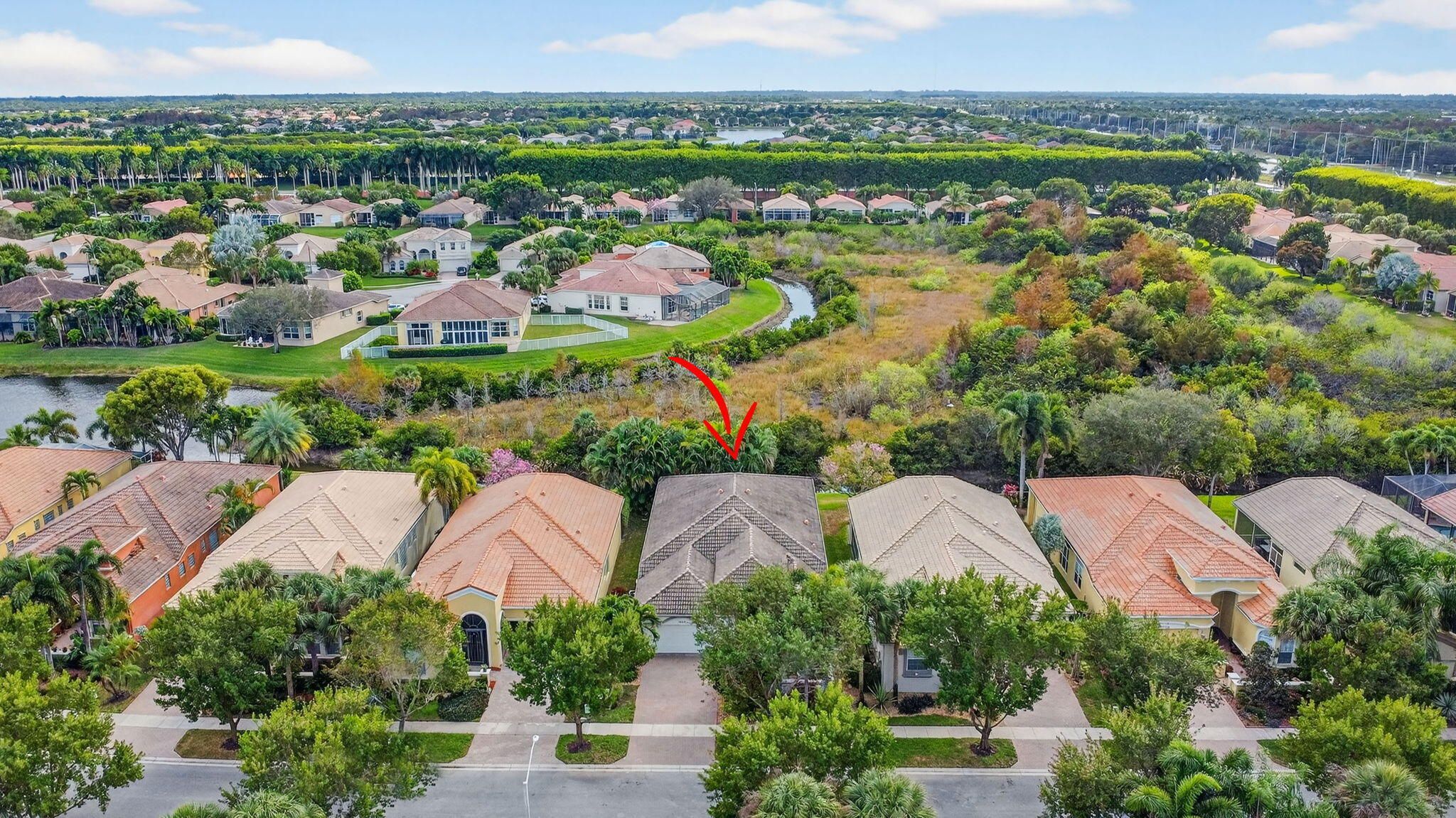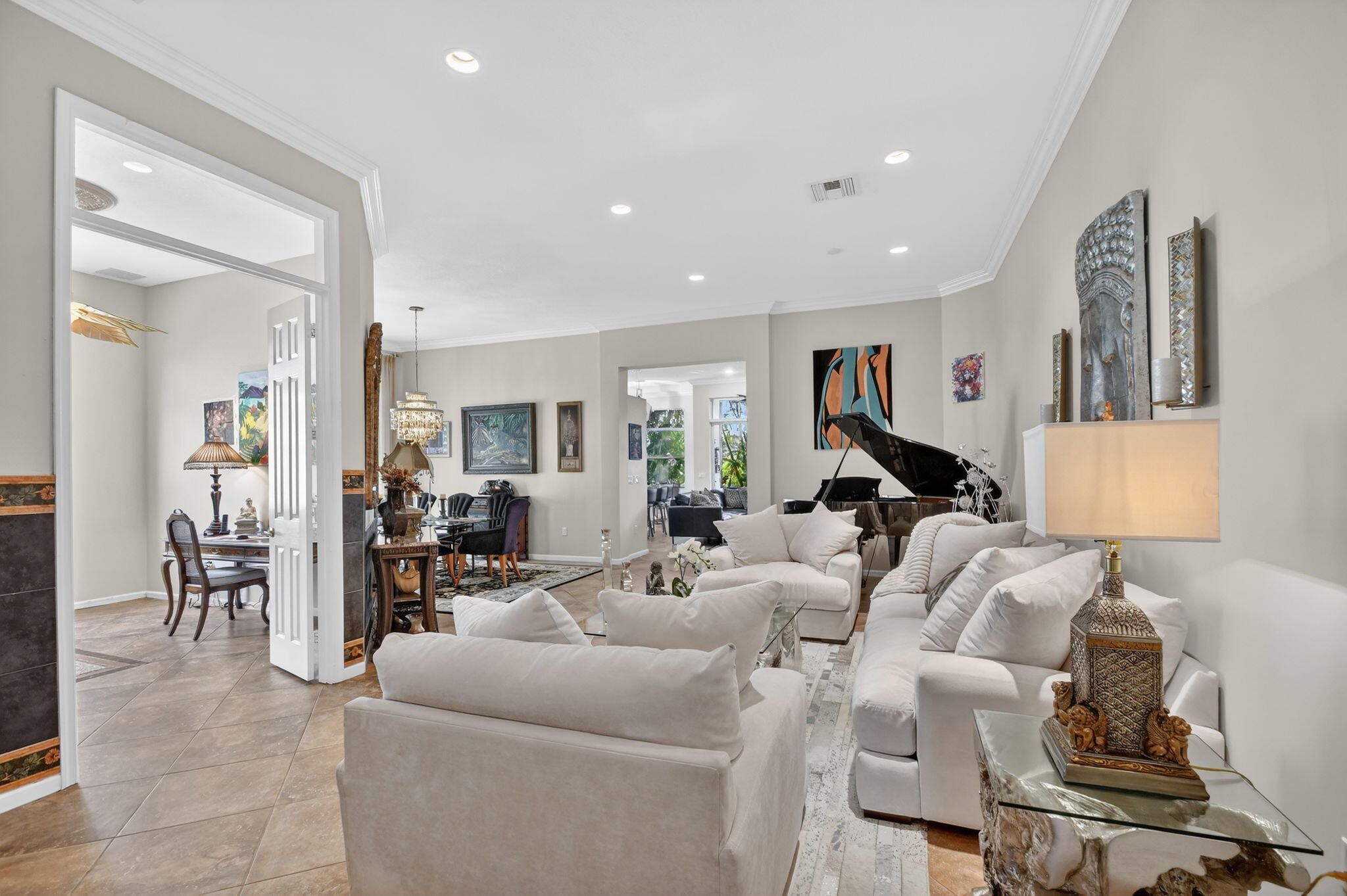 An elevated and tastefully designed home is now available in Buena Vida, Wellington's only single family 55 Plus resort style community. This beautifully appointed residence offers 2 bedrooms, 2.5 baths, a den or office, a screened covered patio, and a two car garage, all set on a private water and preserve lot. The spacious 2,365 square foot living area showcases curated, elegant finishes throughout. A welcoming foyer features 12 foot coffered ceilings and a decorative mosaic inlaid tile entry with geometric and circular motifs, which is echoed at the den or office entry. Ceramic flooring flows seamlessly throughout the home, enhancing its open and cohesive design. This model offers multiple areas for entertaining, including formal living and dining spaces, as well as an open - family room and kitchen layout. Artisan inspired tile accents add character and visual interest in the formal dining area, primary bath, second bath, and guest half bath. The chef's kitchen is designed for both function and style, featuring a spacious island, newer stainless steel appliances, granite countertops, tiled backsplash, wood cabinetry, a walk in pantry, and a sunny breakfast area. The primary suite offers a sophisticated and serene retreat with a sitting area, double closets with custom built ins, and a well appointed ensuite bath with soaking tub, double vanities, and a tiled glass enclosed shower. A versatile second bedroom with ensuite bath is located at the front of the home and can easily serve as a second primary suite. Plantation shutters and thoughtful design details create another peaceful private space. The covered and screened patio overlooks lush landscaping, providing a secluded setting ideal for quiet mornings or relaxing afternoons. Additional highlights include $20K in high end light fixtures and finishes throughout, stunning window treatments, a water filtration system added in 2022 ,5 ton air conditioning system installed in 2023, and accordion shutters for storm protection in 2016. Buena Vida offers resort style amenities including two pools and spa, poolside cabanas, a fitness center, steam room, card rooms, library, grand ballroom, and an outstanding sports complex with pickleball and tennis. The HOA includes landscape maintenance, lake water irrigation for your lot, power washing of driveways and walkways, Xfinity cable and internet up to 500 Mbps, a 24 hour manned gate, and an annual 500 dollar café dining allowance. The location is exceptional, just 15 minutes to Palm Beach International Airport, approximately 9 miles to the beaches, and about 20 minutes to the Polo Grounds and Winter Equestrian Festival. Buena Vida is ideally situated to enjoy South Florida living, from dining and boutique shopping to cultural attractions. Experience the good life at Buena Vida in Palm Beach County.