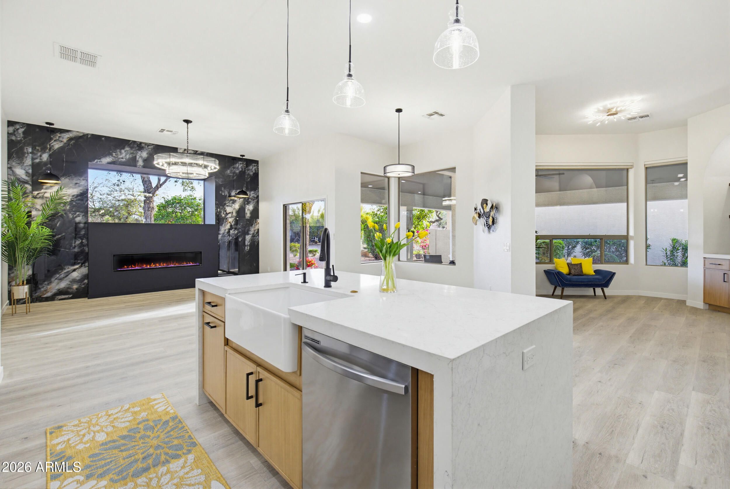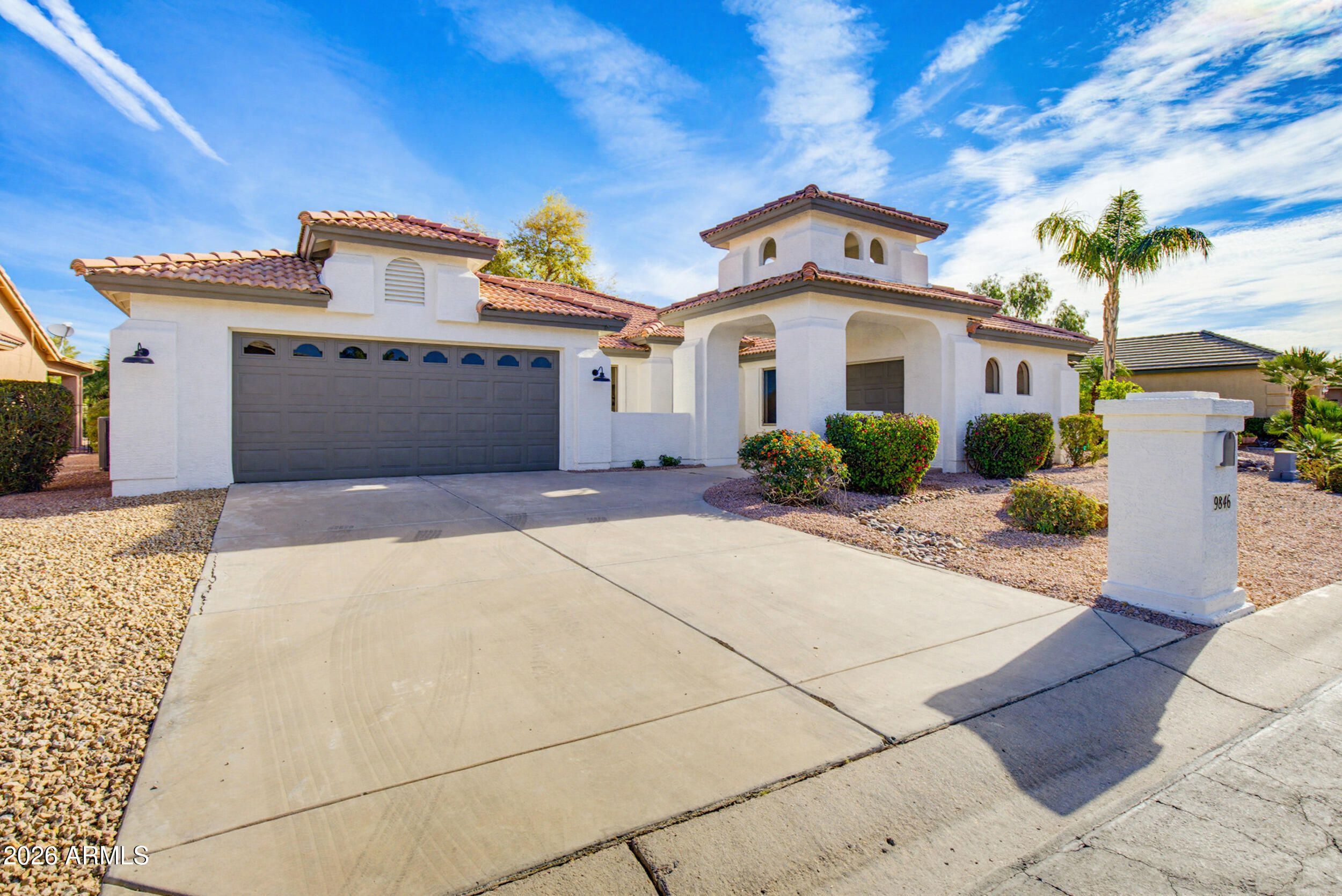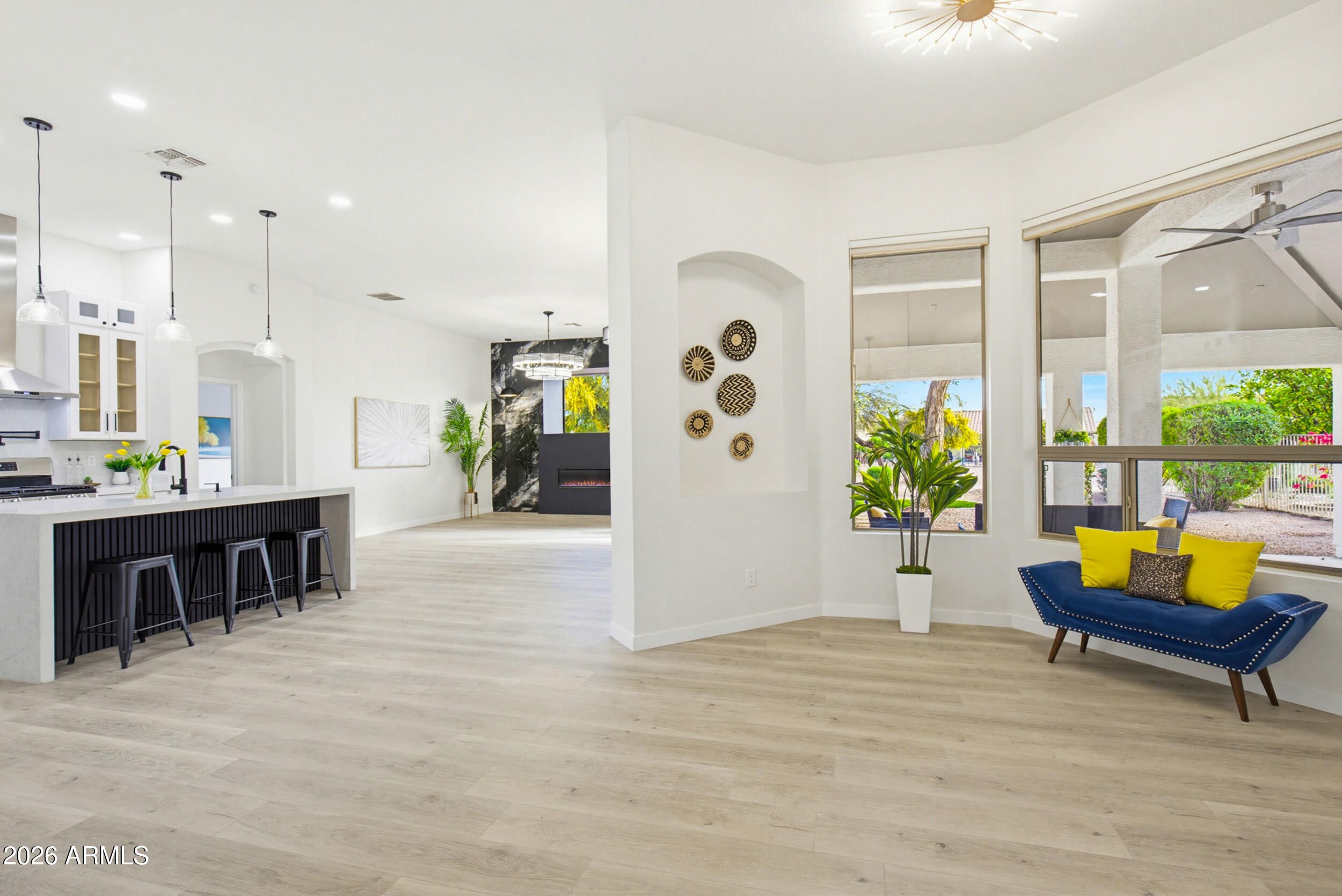Exquisitely remodeled home located in the prestigious community of Sun Lakes. Thoughtfully Redesigned with Timeless Finishes and Modern Comfort in Mind, This residence Offers a Split Plan with 3 Spacious Bedrooms,Sitting Area With Bar, Plus a Private Office-Ideal for Guess, Hobbies, or a Work-From-HomeSpace. Completing the Home is a Spacious two-Car Garage plus A dedicated Golf Car Garage. At The Heart of The Home, the Fully REDESIGNED Kitchen Features Custom Cabinetry, Stunning Quartz Countertops, a Dramatic Quartz Waterfall Island Anchors the Space. ALL NEW PLEX PLUMBING Throughout and New Roof Underlayment, 2022 A/C Adds Long-Term Value and Peace of Mind. Residents Enjoy Golf,Resort Pools, Fitness Centers,Tennis and Pickleball Courts,On-Side Dinning, and a Vibrant Social Calendar.