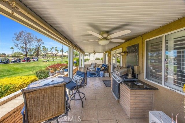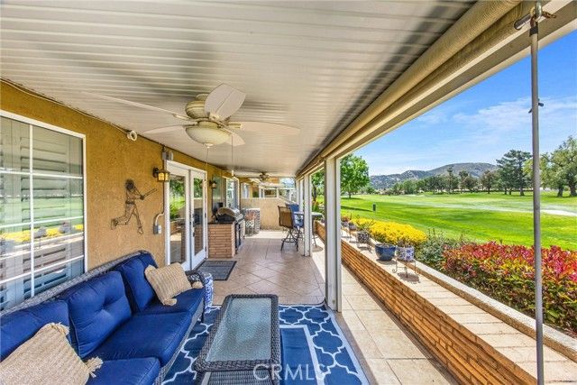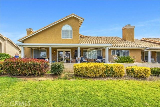 Welcome to one of the best locations in Sun Lakes Country Club, where resort-style 55+ living meets comfort, space, and incredible views. This highly sought-after golf community offers an unmatched lifestyle with two 18-hole golf courses, three clubhouses, restaurants, pools (including a large indoor pool), fitness centers, tennis, pickleball, bocce ball, and a full calendar of social clubs and activities—from dancing and cards to art, travel, and more. With HOA dues that include cable and internet, and convenient access to nearby shopping in Cabazon Outlets and Palm Springs, plus casinos, dining, and medical facilities, it truly feels like living in your own private resort. This particular home stands out from the rest. At approximately 1,356 square feet, it is significantly larger than most 2-bedroom units in the community, thanks to a spacious loft of over 300 square feet—perfect for a home office, guest space, or additional living area. The open layout features vaulted ceilings that create an airy feel and flow beautifully up to the loft above. As an end unit with only one shared wall, you’ll enjoy added privacy, along with a full 2-car garage and custom shutters throughout. Positioned just off the tee box, this home offers a prime golf course location—giving you front-row views of golfers teeing off and the surrounding fairway, all while minimizing the chances of stray golf balls. The backdrop of mountain views makes your outdoor space the perfect place to relax, unwind, and enjoy the scenery. Nicely upgraded and thoughtfully designed, this is a rare opportunity to own one of the larger, better-located condos in the community—priced to sell and ready for its next owner to enjoy everything Sun Lakes has to offer.