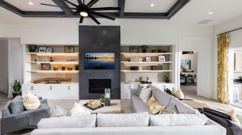 Pack your bags—this stunning Isabella Model is move-in ready and loaded with high-end designer upgrades. Offered furnished for a nominal additional cost, this home is truly turnkey. A grand foyer with a coffered ceiling and wood-look porcelain tile flooring sets the tone, flowing throughout the open-concept layout. The great room features a custom built-in wall unit and gas fireplace, while the gourmet kitchen offers stacked cabinetry, ample workspace, and a custom walk-in pantry—perfect for entertaining. Guest bedrooms share a dual-access bath with separate vanities for added comfort and privacy. The expanded primary suite is a private retreat with double-door entry, dual custom closets, and a spa-like bath with soaking tub, walk-in shower, and private water closet. Enjoy outdoor living on the extended covered lanai with a built-in bar, kegerator, and pre-plumbing for a future kitchen. The backyard oasis boasts a resort-style lap pool, spa, and fire pit—ideal for relaxing or entertaining.