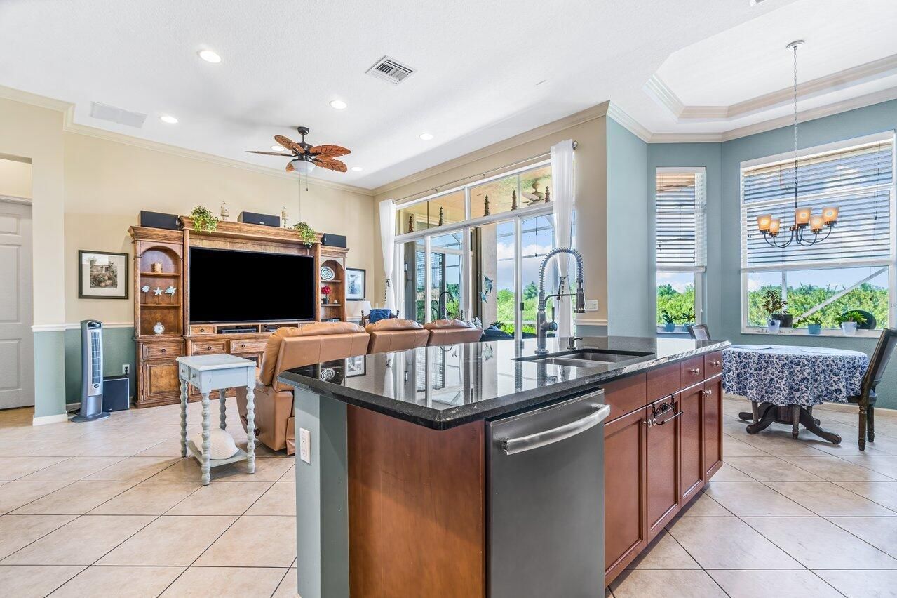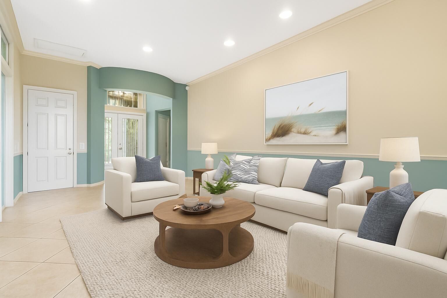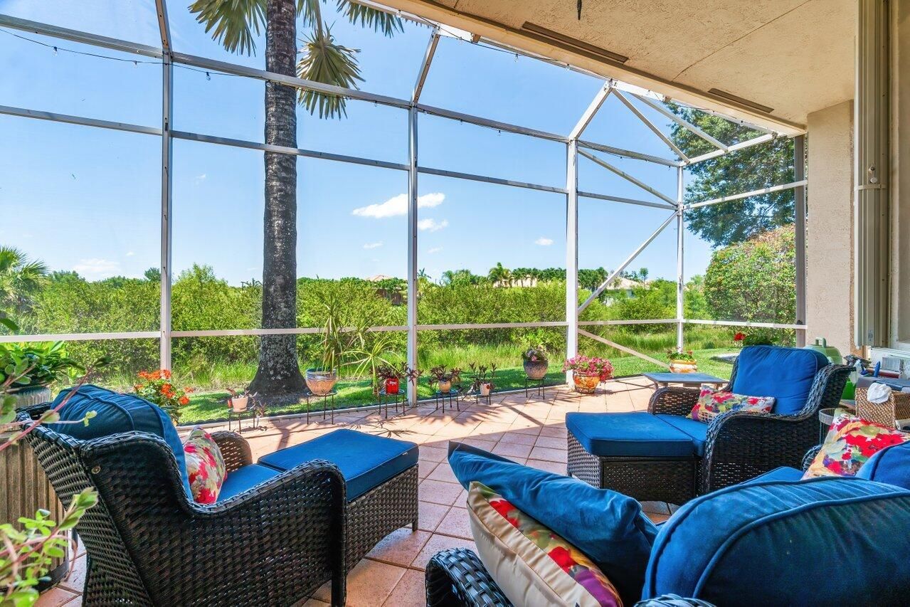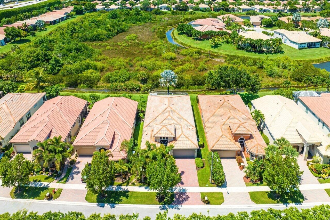Beautiful home for sale in Wellington's premier active adult 55+ community, Buena Vida! Situated on a private waterfront lot overlooking a peaceful preserve this one-story home features 2 bedrooms + den, 2.5 bathrooms, a 2 car garage, and over 3,000 square feet of indoor and outdoor living. Recent upgrades include a NEW AC (Oct 2023), NEW accordion hurricane shutters (2022), NEW refrigerator (2023), NEW water heater (2022), and NEW Shaw luxury vinyl flooring throughout the bedrooms and den. As you step through the double doors you'll be greeted by a circular foyer that leads to the well-appointed formal living room and dining room. Designed with entertainment in mind, the formal areas flow seamlessly into the family room and kitchen. The family room offers sliding glass doors that transport you to a private backyard sanctuary. Here you'll be able to enjoy Florida living all year long as you sit back and relax on your extended covered and screened patio. Back inside, the gourmet kitchen offers 42'' wooden cabinetry, granite countertops, tile backsplash, a walk-in pantry, and stainless steel appliances. The kitchen also overlooks the breakfast area and family room. This split floorplan includes a secluded master suite featuring two spacious walk-in closets, sliding glass doors opening to the backyard retreat, and an updated en-suite bathroom complete with dual sinks, a roman tub, a separate shower, and a linen closet. Toward the front of the home off the foyer, you'll find the guest bedroom with its own private bathroom, a half bathroom, and laundry room, which features additional storage, and a wash basin. Adjacent to the formal living room is the den, which provides versatility with its beautiful built-in shelving, ideal for an office or potentially a third bedroom. Additional highlights include custom moldings, volume ceilings, and tile throughout the living areas. The home also features custom pull-down steel stairs for easy attic access, and a 10-year warranty for the accordion shutters. Buena Vida is a meticulously maintained active adult community, conveniently located on the northeast corner of Forest Hill Blvd and 441 in Wellington, Florida. Within the gates, a bustling social scene awaits, with an array of events and activities curated throughout the year by the on-site social director and property management team. From lively gatherings to enriching classes and clubs, something exciting is always happening within the community. You will also find incredible amenities within Buena Vida, enhancing the South Florida living experience! Residents have access to resort-style pools, including a lap pool for fitness enthusiasts, Har-Tru tennis courts and pickleball courts for active recreation, and a state-of-the-art fitness center equipped with the latest exercise machines. There is also a library, multiple card rooms, a billiards room, and a ballroom for special events. Additionally, there's an on-site cafe that serves breakfast and lunch seven days a week. Buena Vida's HOA dues cover essential services such as lawn care, high-speed internet, cable, credit to the cafe, access to all amenities, and 24-hour guard-gated security, ensuring peace of mind and convenience. With shopping, dining, and entertainment just minutes away, Wellington Regional Hospital, Palm Beach International Airport, and the Florida Turnpike are within easy reach. Buena Vida provides the perfect blend of luxury, convenience, and accessibility. Whether you're seeking full-time residence or a part-time getaway, this well-appointed home has it all.