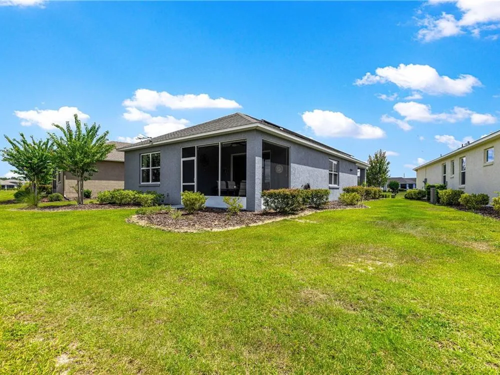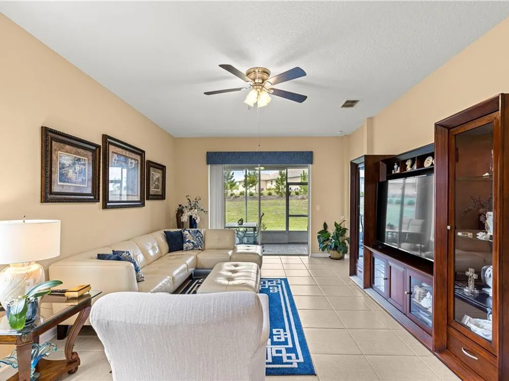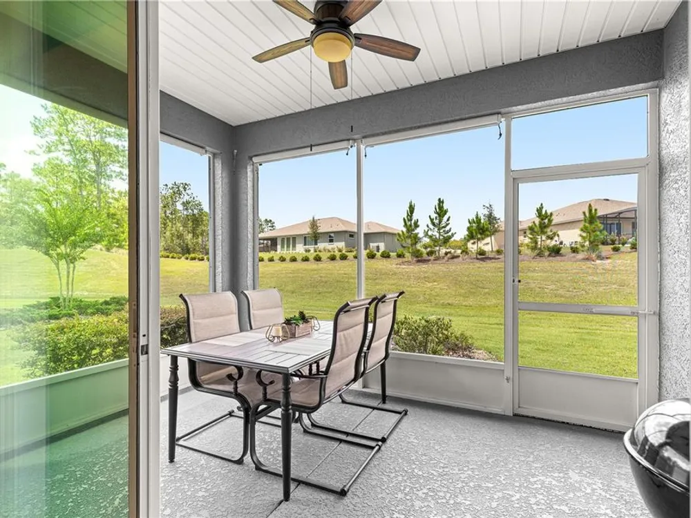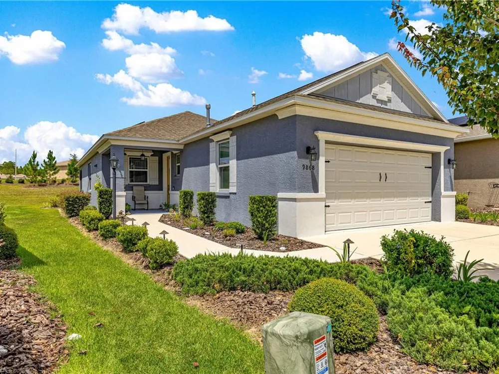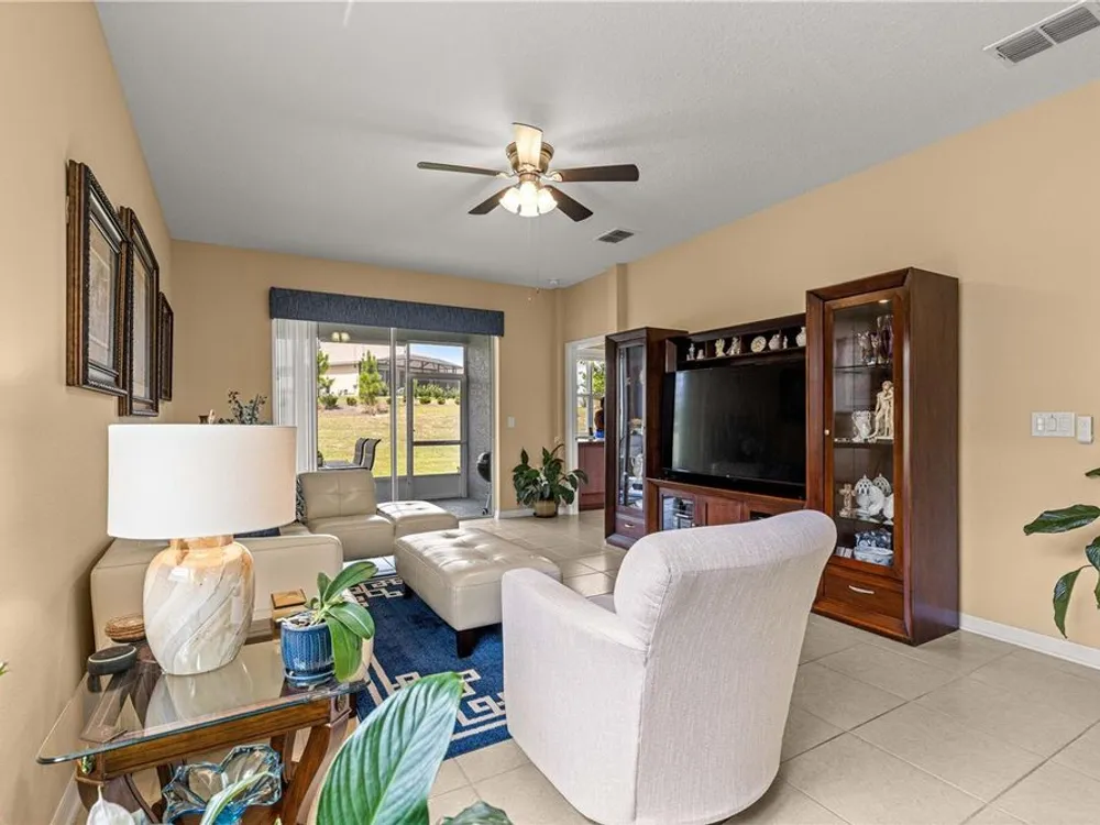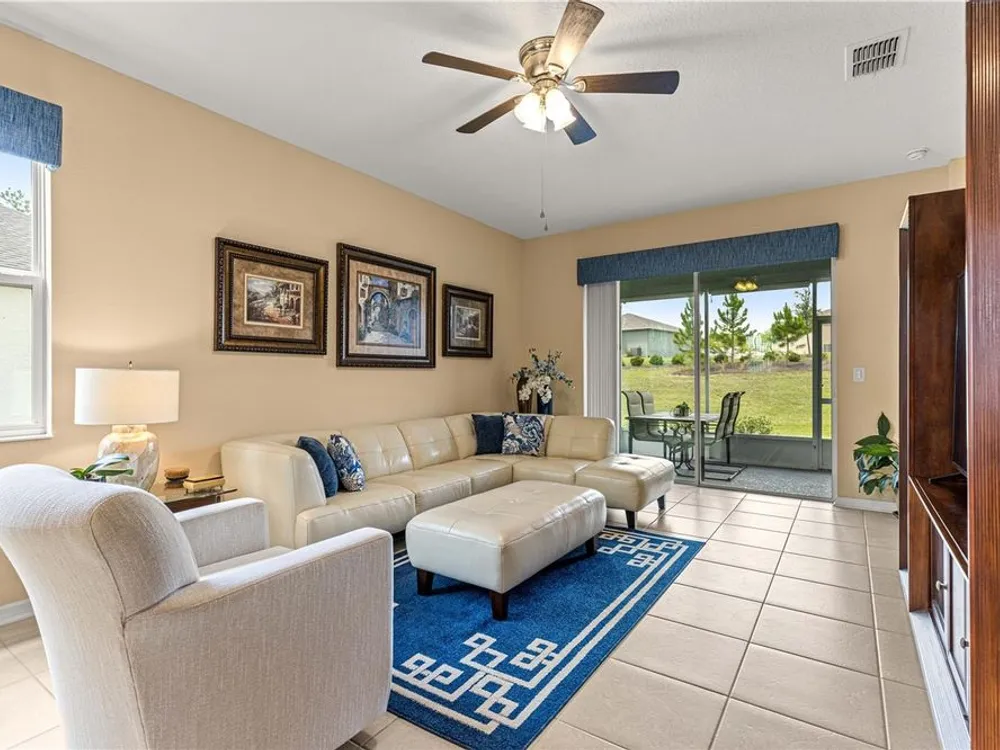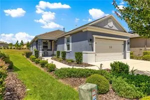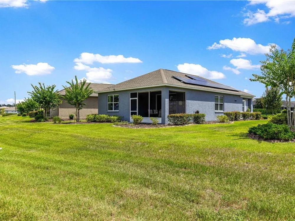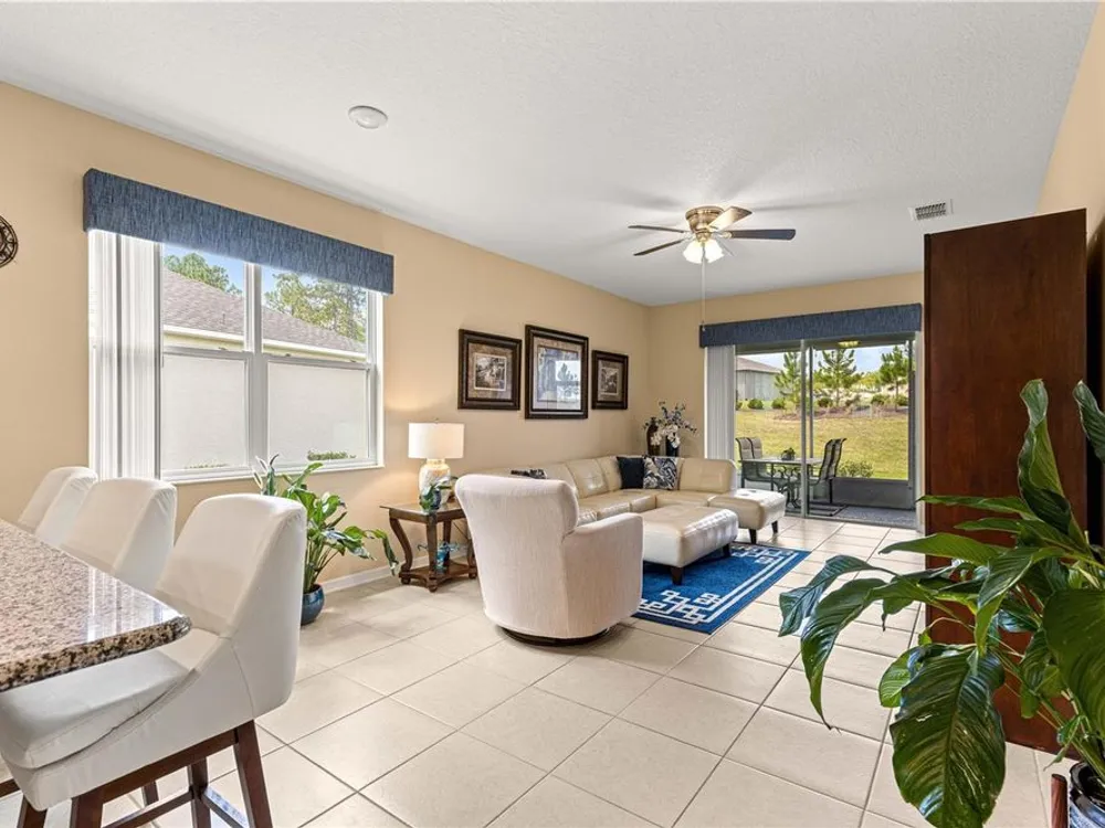SOLAR EQUIPPED SMART HOME! Spacious Tamar Model Single Family Home with 2 Bedrooms, 2 Baths, Flex Room, & 2-Car Garage on a PRIVACY LOT WITH GREEN SPACE in the Crescent Ridge 3 Neighborhood of On Top of the World, Premiere 55+ Gated Golf Community in SW Ocala FL. Thanks to the builder installed 14 panel SOLAR system the average monthly electric bill is less than $35. Solar Panels are 100% paid for and fully transferrable! Natural gas provides cooking, heating, dryer, & water heater energy! As you approach notice the extended driveway, the cute front porch, and the GREEN SPACE in front! The RING doorbell conveys with the home. Step into the foyer and immediately notice the Flex Room with closet and window, being used as formal dining room with custom chair rail. The entire interior of the home was custom painted in two tone neutral beige colors. Dedicated laundry room with washer, NEW gas dryer, and storage are steps from the entrance to the 2-car garage. Down the short entrance foyer/hall step into the GOURMET Kitchen w/beautiful granite counters and tile backsplash, custom pantry with extra storage on the door, upgraded appliances including NEW microwave, a window over the sink, and counter peninsula w/seating. The oversized Great Room is perfect for entertaining! Split bedroom plan with guest bedroom (currently used as a Den) to right of kitchen provides a true guest suite with adjoining guest/hall bath with tub & tile surround, quartz vanity top, and comfort height toilet. The spacious primary bedroom is in the back of the home for privacy with ceiling fan and large window. The massive walk-in closet has been upgraded with double hanging rods. The en suite bath has a LARGE step/roll in upgraded tiled shower with seat and glass enclosure, double vanity w/quartz top, comfort height toilet, and linen closet. Step through the slider to the screened lanai w/ceiling fan and enjoy the GREEN SPACE in back – perfect location for your morning coffee. The 2-car garage includes a whole house water filtration system, a rough-in for laundry sink and LOTS of storage! The monthly HOA fee includes DCM Basic Internet, roof repair, exterior painting every seven years, exterior maintenance and insurance, landscaping, trash & recycling, 24/7 monitored gates and all the amenities that OTOW has to offer; three pools (2 outside & 1 inside & another under construction), two state of the art fitness centers, pickleball, billiards, archery range, corn hole, bocce ball, tennis, shuffleboard, horse shoes, remote control flying field and race cars, 175+ clubs, woodworking shop (extra fee), library, and much, much more! A golf cart community with access to three shopping centers. Centrally located 20 minutes from the World Equestrian Center, easy drive to 4 cruise ports and/or airports, and within a close proximity to entertainment complexes in Orlando.