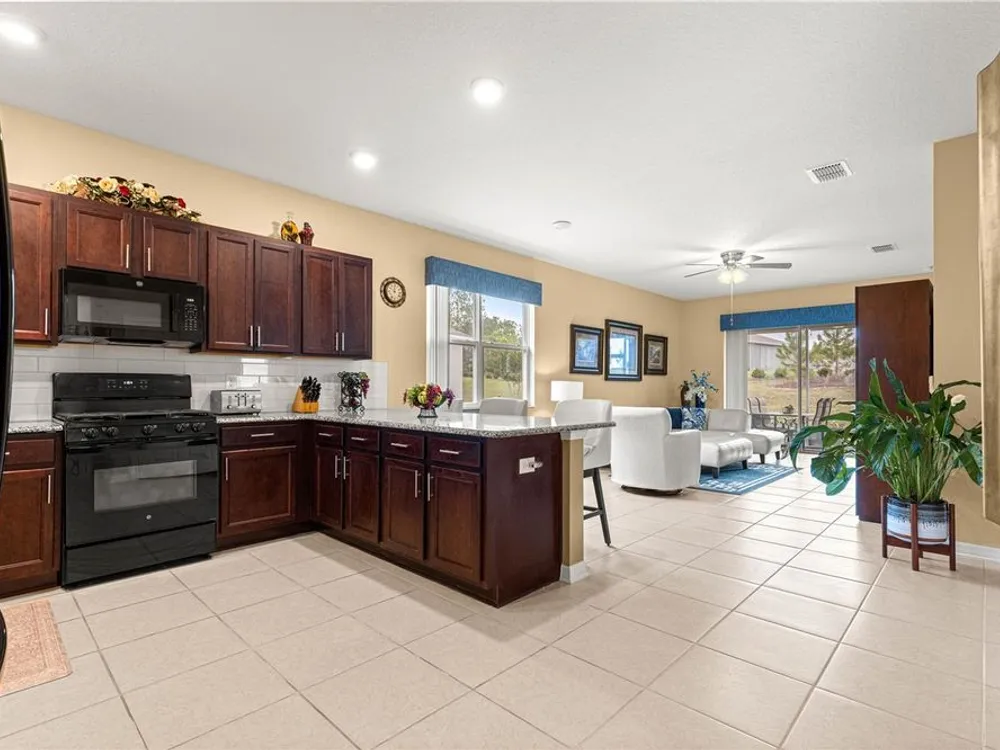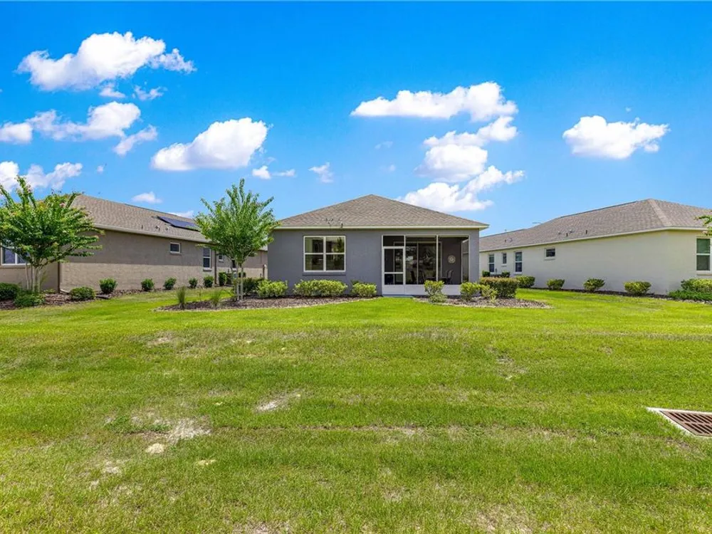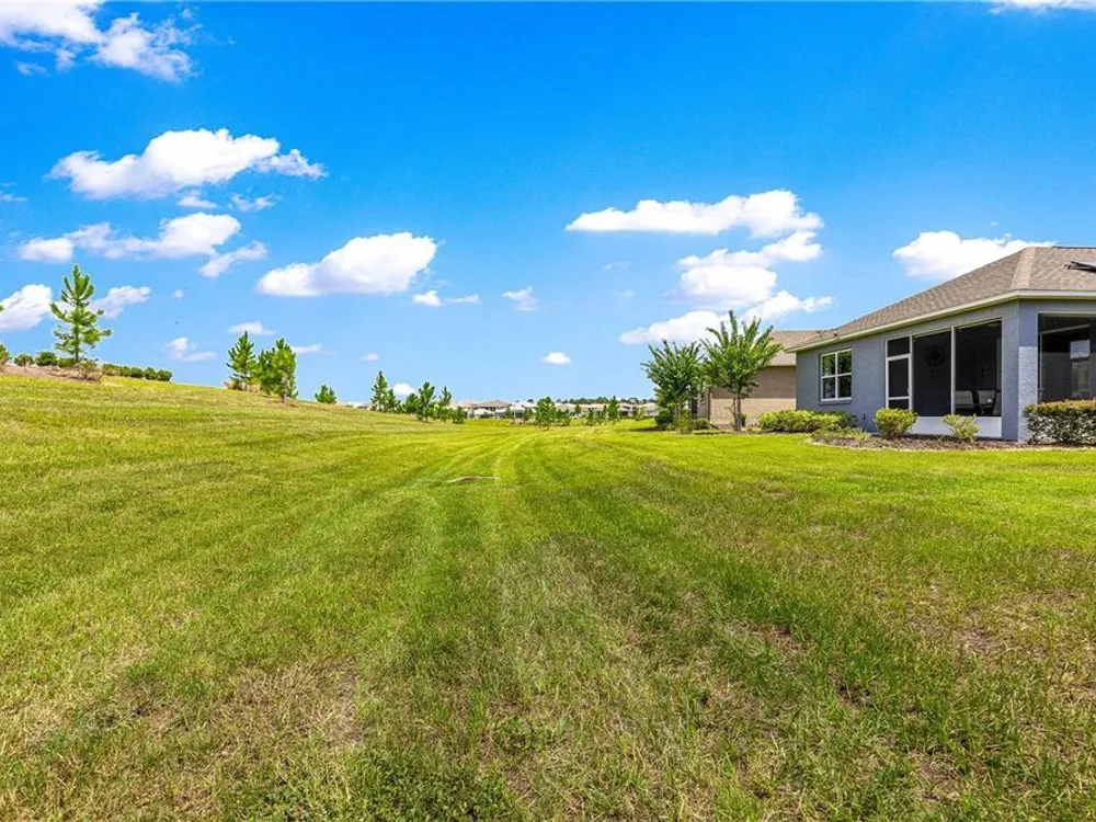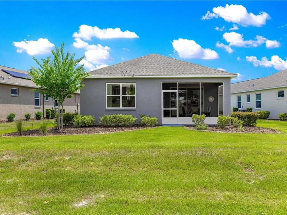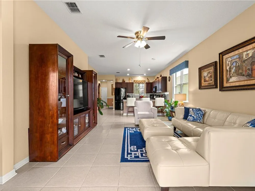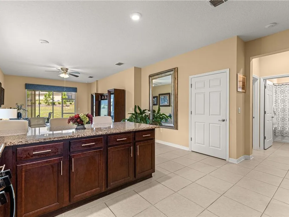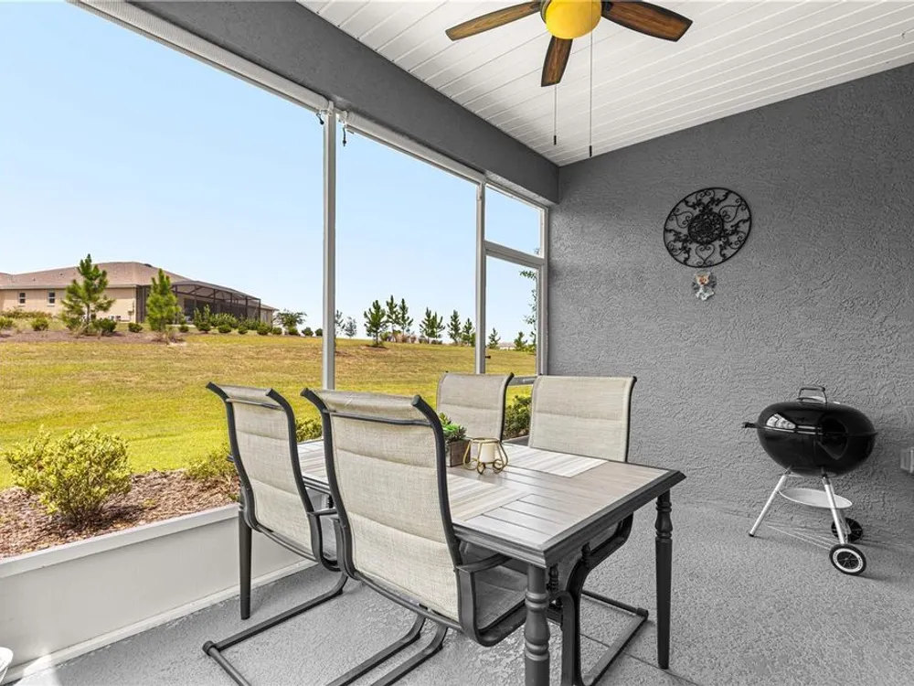 SOLAR EQUIPPED SMART HOME! Spacious Tamar Model Single Family Home with 2 Bedrooms, 2 Baths, Flex Room, & 2-Car Garage on a PRIVACY LOT WITH GREEN SPACE in the Crescent Ridge 3 Neighborhood of On Top of the World, Premiere 55+ Gated Golf Community in SW Ocala FL. Thanks to the builder installed 14 panel SOLAR system the average monthly electric bill is less than $35. Solar Panels are 100% paid for and fully transferrable! Natural gas provides cooking, heating, dryer, & water heater energy! As you approach notice the extended driveway, the cute front porch, and the GREEN SPACE in front! The RING doorbell conveys with the home. Step into the foyer and immediately notice the Flex Room with closet and window, being used as formal dining room with custom chair rail. The entire interior of the home was custom painted in two tone neutral beige colors. Dedicated laundry room with washer, NEW gas dryer, and storage are steps from the entrance to the 2-car garage. Down the short entrance foyer/hall step into the GOURMET Kitchen w/beautiful granite counters and tile backsplash, custom pantry with extra storage on the door, upgraded appliances including NEW microwave, a window over the sink, and counter peninsula w/seating. The oversized Great Room is perfect for entertaining! Split bedroom plan with guest bedroom (currently used as a Den) to right of kitchen provides a true guest suite with adjoining guest/hall bath with tub & tile surround, quartz vanity top, and comfort height toilet. The spacious primary bedroom is in the back of the home for privacy with ceiling fan and large window. The massive walk-in closet has been upgraded with double hanging rods. The en suite bath has a LARGE step/roll in upgraded tiled shower with seat and glass enclosure, double vanity w/quartz top, comfort height toilet, and linen closet. Step through the slider to the screened lanai w/ceiling fan and enjoy the GREEN SPACE in back – perfect location for your morning coffee. The 2-car garage includes a whole house water filtration system, a rough-in for laundry sink and LOTS of storage! The monthly HOA fee includes DCM Basic Internet, roof repair, exterior painting every seven years, exterior maintenance and insurance, landscaping, trash & recycling, 24/7 monitored gates and all the amenities that OTOW has to offer; three pools (2 outside & 1 inside & another under construction), two state of the art fitness centers, pickleball, billiards, archery range, corn hole, bocce ball, tennis, shuffleboard, horse shoes, remote control flying field and race cars, 175+ clubs, woodworking shop (extra fee), library, and much, much more! A golf cart community with access to three shopping centers. Centrally located 20 minutes from the World Equestrian Center, easy drive to 4 cruise ports and/or airports, and within a close proximity to entertainment complexes in Orlando.