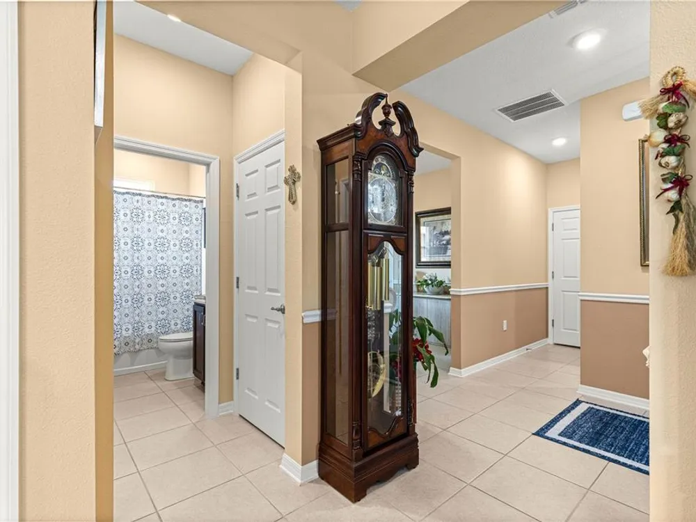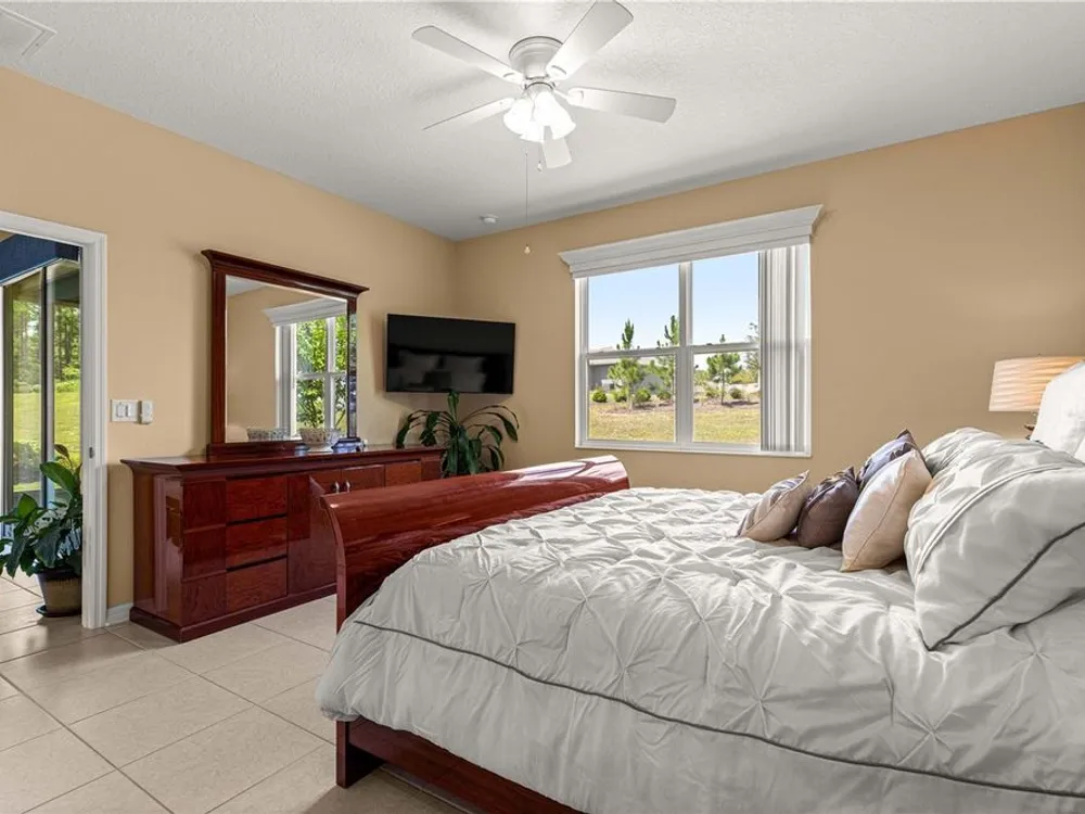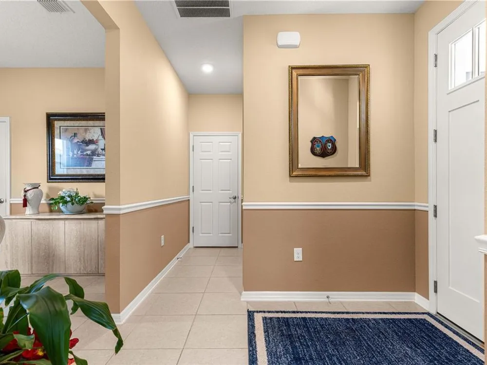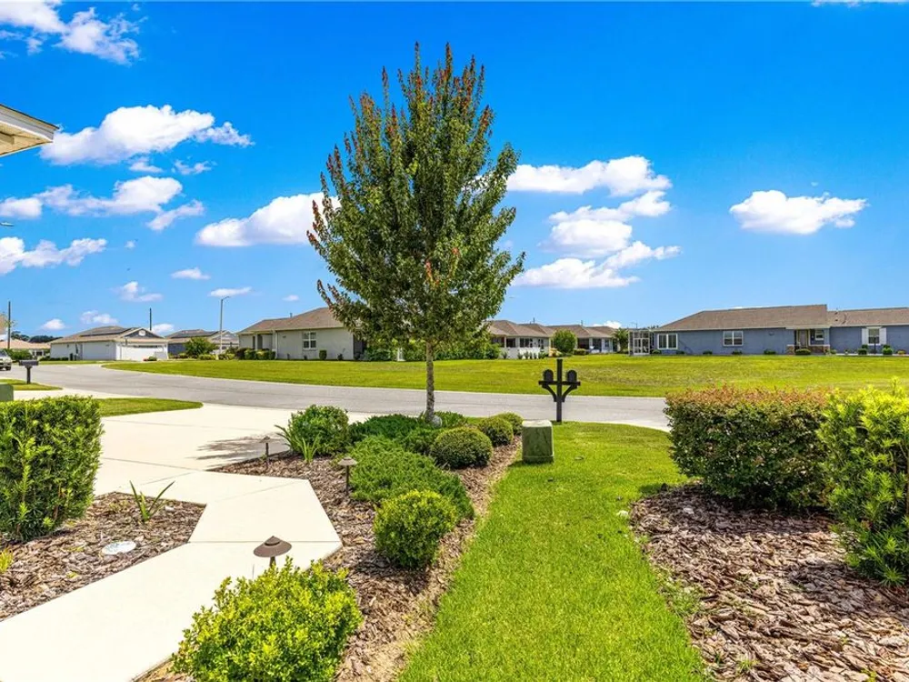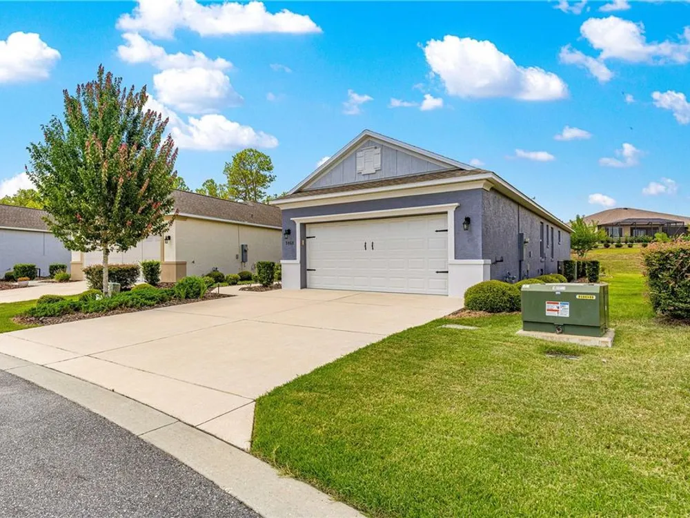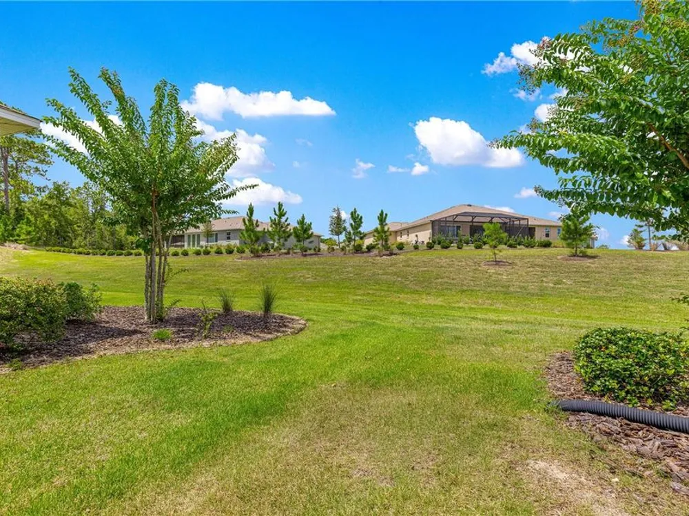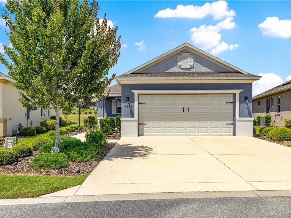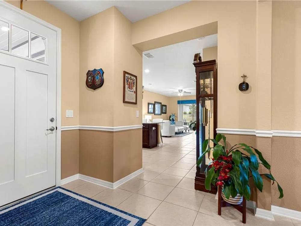 SOLAR EQUIPPED SMART HOME! Spacious Tamar Model Single Family Home with 2 Bedrooms, 2 Baths, Flex Room, & 2-Car Garage on a PRIVACY LOT WITH GREEN SPACE in the Crescent Ridge 3 Neighborhood of On Top of the World, Premiere 55+ Gated Golf Community in SW Ocala FL. Thanks to the builder installed 14 panel SOLAR system the average monthly electric bill is less than $35. Solar Panels are 100% paid for and fully transferrable! Natural gas provides cooking, heating, dryer, & water heater energy! As you approach notice the extended driveway, the cute front porch, and the GREEN SPACE in front! The RING doorbell conveys with the home. Step into the foyer and immediately notice the Flex Room with closet and window, being used as formal dining room with custom chair rail. The entire interior of the home was custom painted in two tone neutral beige colors. Dedicated laundry room with washer, NEW gas dryer, and storage are steps from the entrance to the 2-car garage. Down the short entrance foyer/hall step into the GOURMET Kitchen w/beautiful granite counters and tile backsplash, custom pantry with extra storage on the door, upgraded appliances including NEW microwave, a window over the sink, and counter peninsula w/seating. The oversized Great Room is perfect for entertaining! Split bedroom plan with guest bedroom (currently used as a Den) to right of kitchen provides a true guest suite with adjoining guest/hall bath with tub & tile surround, quartz vanity top, and comfort height toilet. The spacious primary bedroom is in the back of the home for privacy with ceiling fan and large window. The massive walk-in closet has been upgraded with double hanging rods. The en suite bath has a LARGE step/roll in upgraded tiled shower with seat and glass enclosure, double vanity w/quartz top, comfort height toilet, and linen closet. Step through the slider to the screened lanai w/ceiling fan and enjoy the GREEN SPACE in back – perfect location for your morning coffee. The 2-car garage includes a whole house water filtration system, a rough-in for laundry sink and LOTS of storage! The monthly HOA fee includes DCM Basic Internet, roof repair, exterior painting every seven years, exterior maintenance and insurance, landscaping, trash & recycling, 24/7 monitored gates and all the amenities that OTOW has to offer; three pools (2 outside & 1 inside & another under construction), two state of the art fitness centers, pickleball, billiards, archery range, corn hole, bocce ball, tennis, shuffleboard, horse shoes, remote control flying field and race cars, 175+ clubs, woodworking shop (extra fee), library, and much, much more! A golf cart community with access to three shopping centers. Centrally located 20 minutes from the World Equestrian Center, easy drive to 4 cruise ports and/or airports, and within a close proximity to entertainment complexes in Orlando.