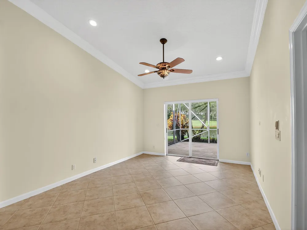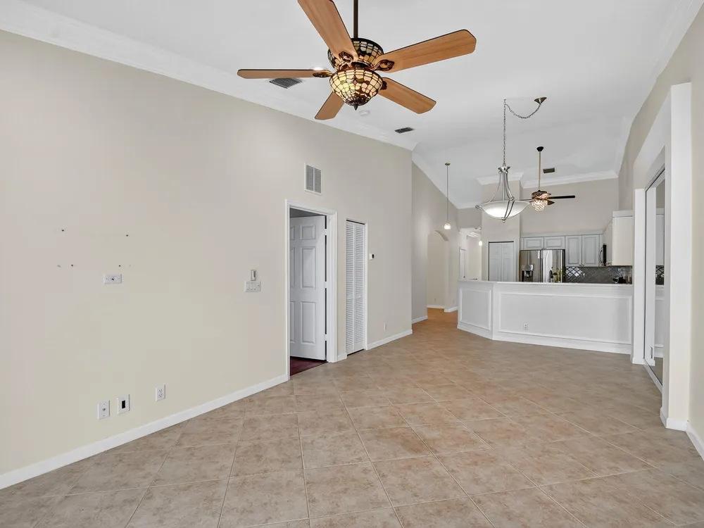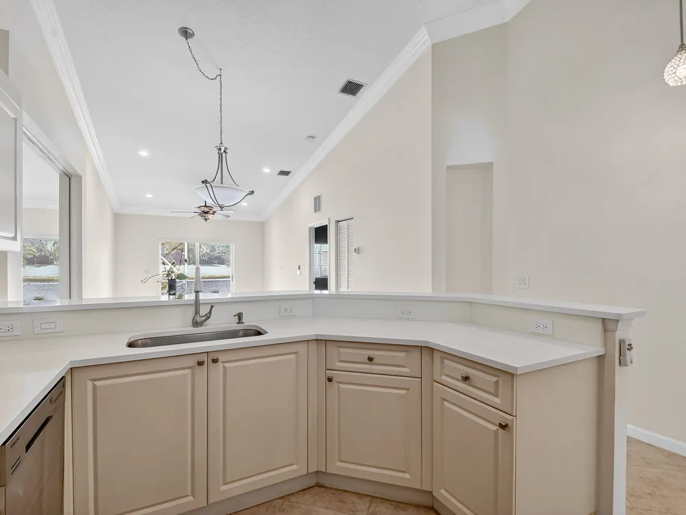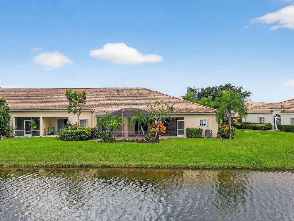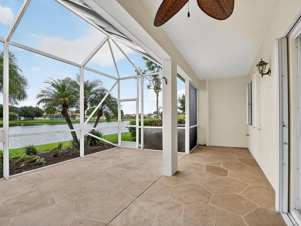 Stunning Lakefront 2/2 Villa with Flexible Den/Office SpaceWelcome to this beautifully maintained 2-bedroom villa with a versatile den that can serve as an office, formal dining room, or bonus space to fit your lifestyle. From the moment you walk in, you'll notice the attention to detail and quality upgrades throughout.Enjoy peaceful lake views from your screened-in patio--perfect for barbecues, entertaining, or simply unwinding at the end of the day. Inside, the home features crown molding, fresh interior paint, designer window treatments, upgraded ceiling fans, and custom mirrors. Tile flooring is laid on the diagonal in the main living areas, with laminate in the bedrooms for a warm, inviting feel.The kitchen is a chef's delight with quartz countertops, stainless steel
