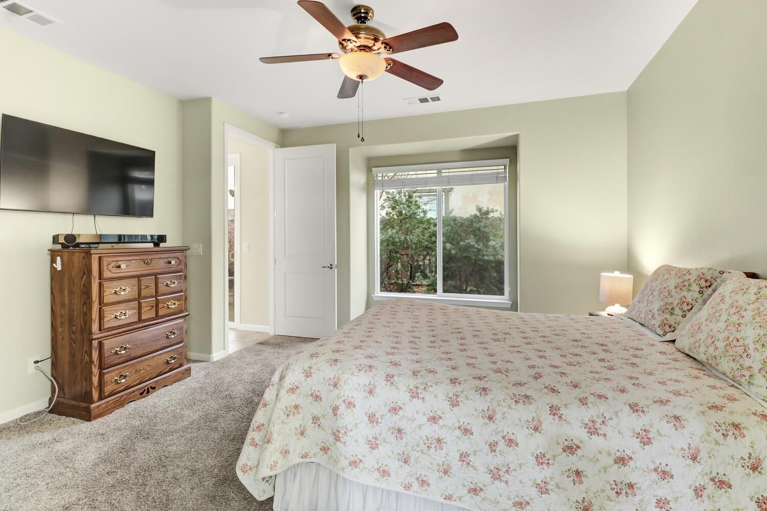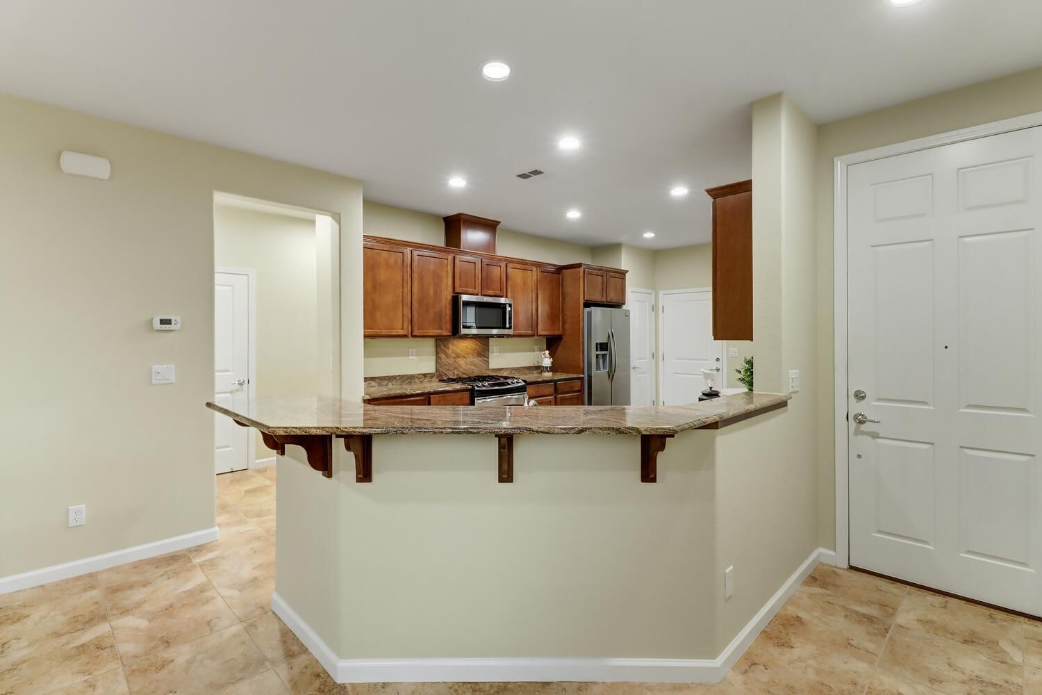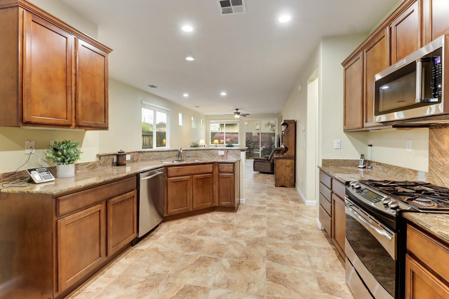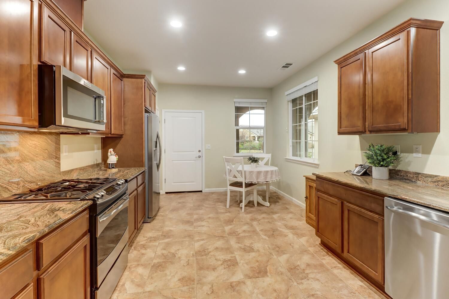Spend your mornings chatting with neighbors along scenic community walkways, your afternoons taking a dip in the community pool, and your evenings settling into the calm of your own backyard retreat. Welcome to Del Webb Glenbrooke, one of Elk Grove's most beloved 55+ communities, where an active social calendar and resort-style amenities make every day feel like something to look forward to. This Randall model offers 1,371 square feet of single-story living with two bedrooms and two full bathrooms, all meticulously cared for and move-in ready. The kitchen is well-equipped with granite countertops, stainless steel GE Profile appliances, and a sunny breakfast nook perfect for leisurely mornings. A breakfast bar and kitchen-family room combo make the space as functional as it is inviting. Refreshed carpet in both bedrooms gives the home a clean, welcoming feel, while tile flooring flows through the main living areas. New LED lighting throughout complements the generous natural light that fills each room. Outside, a private backyard with patio and thoughtfully kept landscaping makes outdoor living a pleasure without the added upkeep. This is a home that has been genuinely loved, set inside a community that makes it easy to live well every single day.