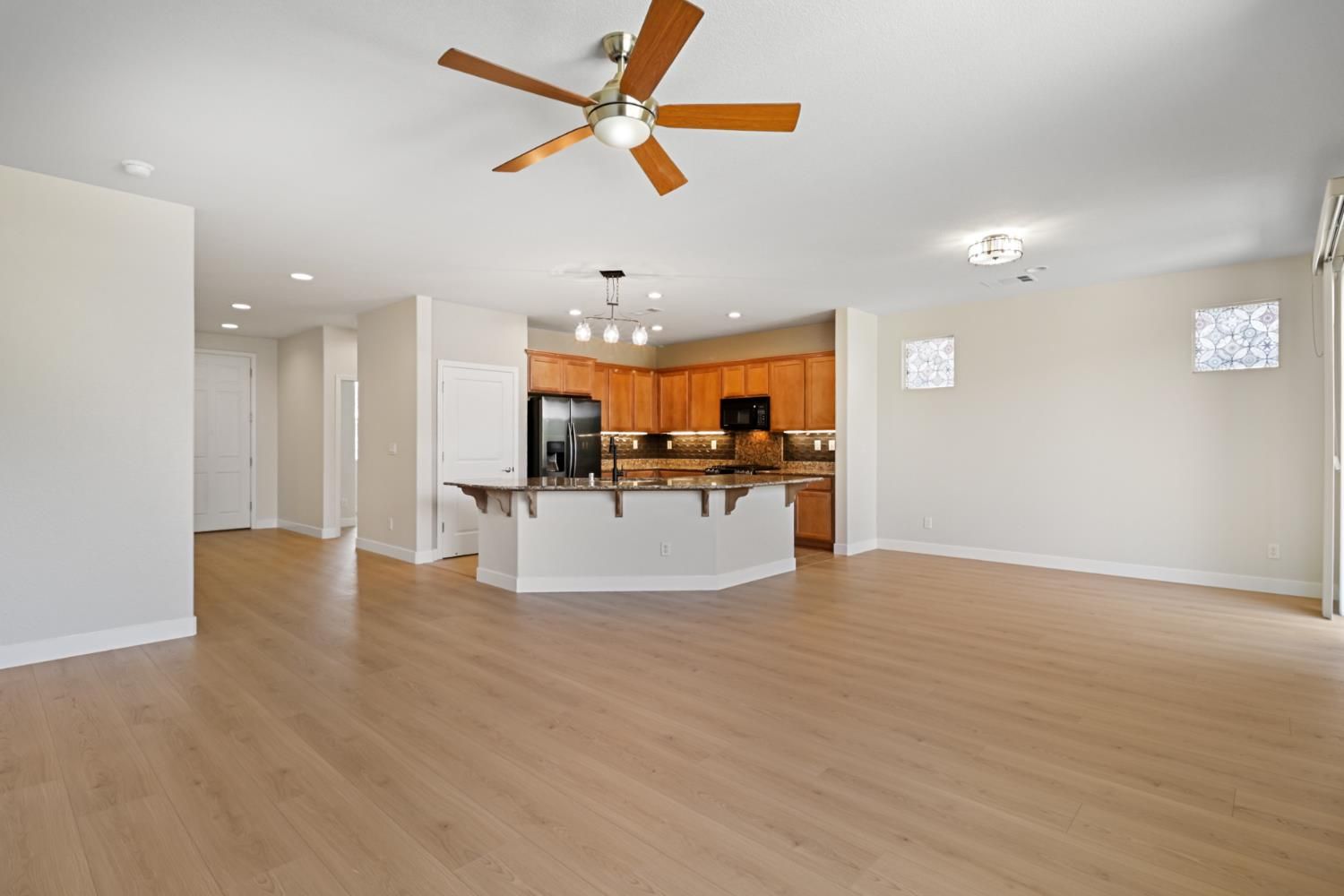 Best-priced 3-bedroom Maggie model in Glenbrooke by Del Webb, Elk Grove's premier 55+ community! This move-in ready home features new laminate wood flooring in the entry, dining, great room, and all bedrooms, new baseboards, fresh interior paint, and select new light fixtures. The open kitchen offers granite countertops, tile backsplash and floors, a large island with sink and bar seating, pantry, and black/black-stainless appliances. Kitchen opens to the dining area and great room with ceiling fanideal for everyday living and entertaining. Spacious primary suite includes ceiling fan, large walk-in closet with solar tube, and ensuite bath with dual sinks and a walk-in shower. Two additional bedrooms are located at the front of the home. Guest bath includes a shower over tub. Inside laundry room features cabinets, sink, and solar tube. Low-maintenance, drought-tolerant backyard with patio, raised brick planter, mature landscaping, roses, trees, and shrubs.