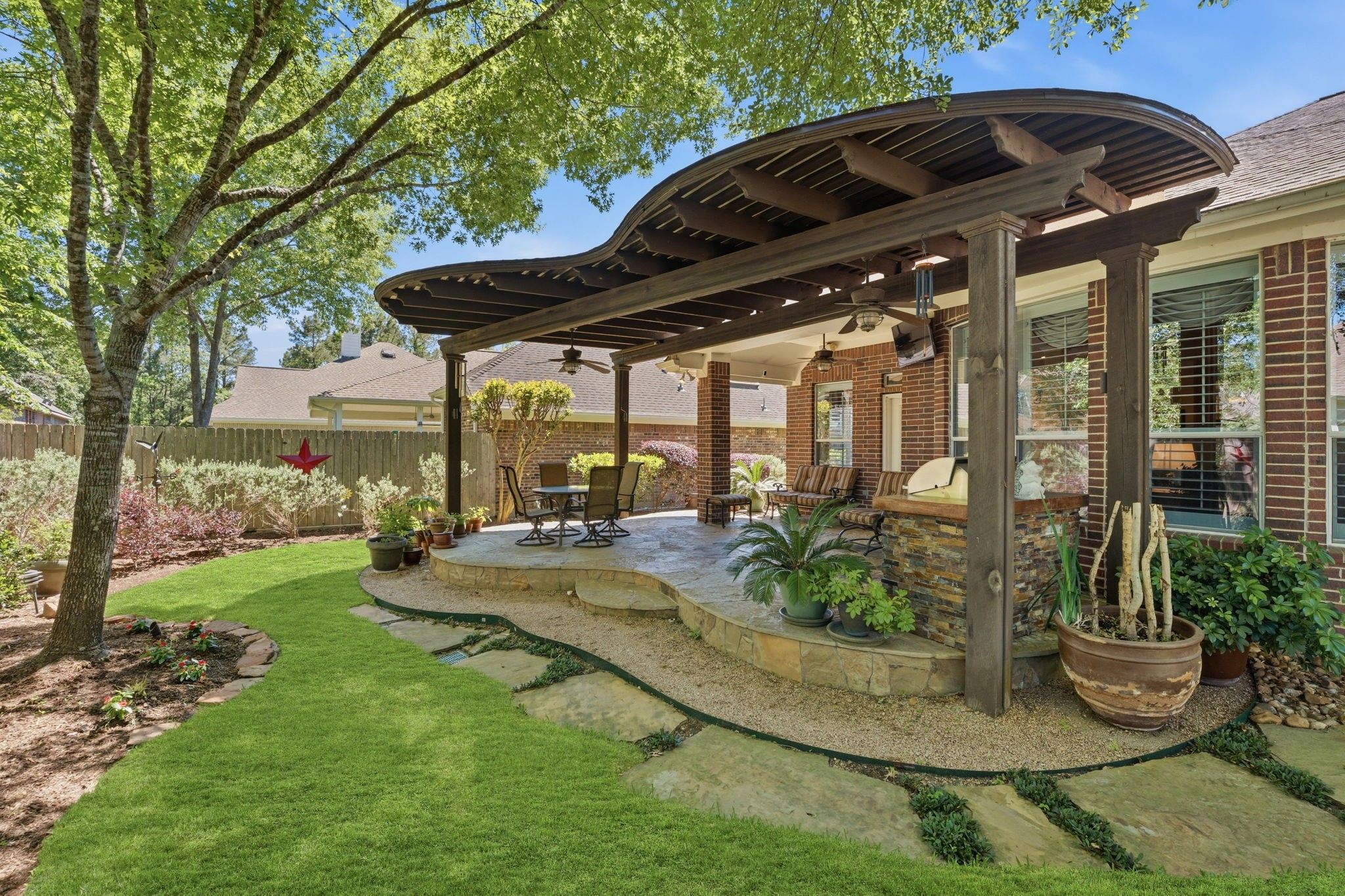 Welcome to 99 Bagpipe Way, nestled within the gated 55+ enclave of Windsor Lakes in The Woodlands—where refined, low-maintenance living meets a vibrant, social lifestyle. This thoughtfully updated home offers a beautifully remodeled kitchen, seamless living spaces, and an oversized primary suite designed for comfort and ease. Outdoor living shines with a private flagstone patio and outdoor kitchen, perfect for quiet mornings or effortless entertaining. Enjoy a true lock-and-leave lifestyle with HOA-covered exterior maintenance, front lawn care, and access to a private clubhouse, fitness center, and curated social activities. An exceptional opportunity to enjoy elevated living in one of The Woodlands’ most sought-after active adult communities.