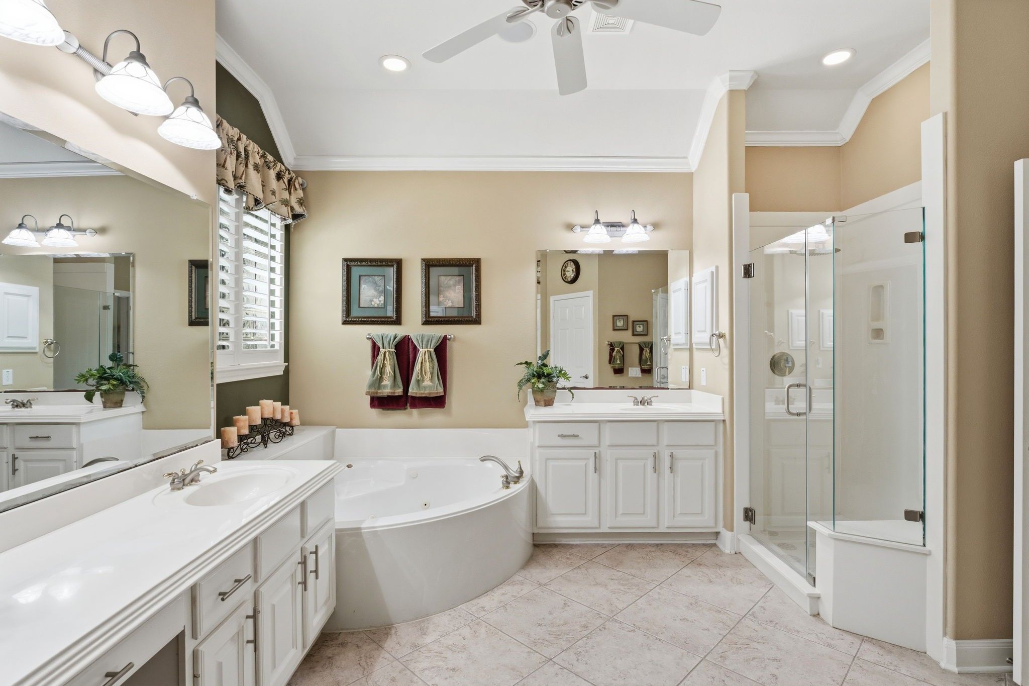 - Breakfast Bar, Crown Molding, Double Vanity, Granite Counters, High Ceilings, Kitchen Island, Kitchen/Family Room Combo, Bath in Primary Bedroom, Pantry, Soaking Tub, Separate Shower, Ceiling Fan(s), Kitchen/Dining Combo, Programmable Thermostat