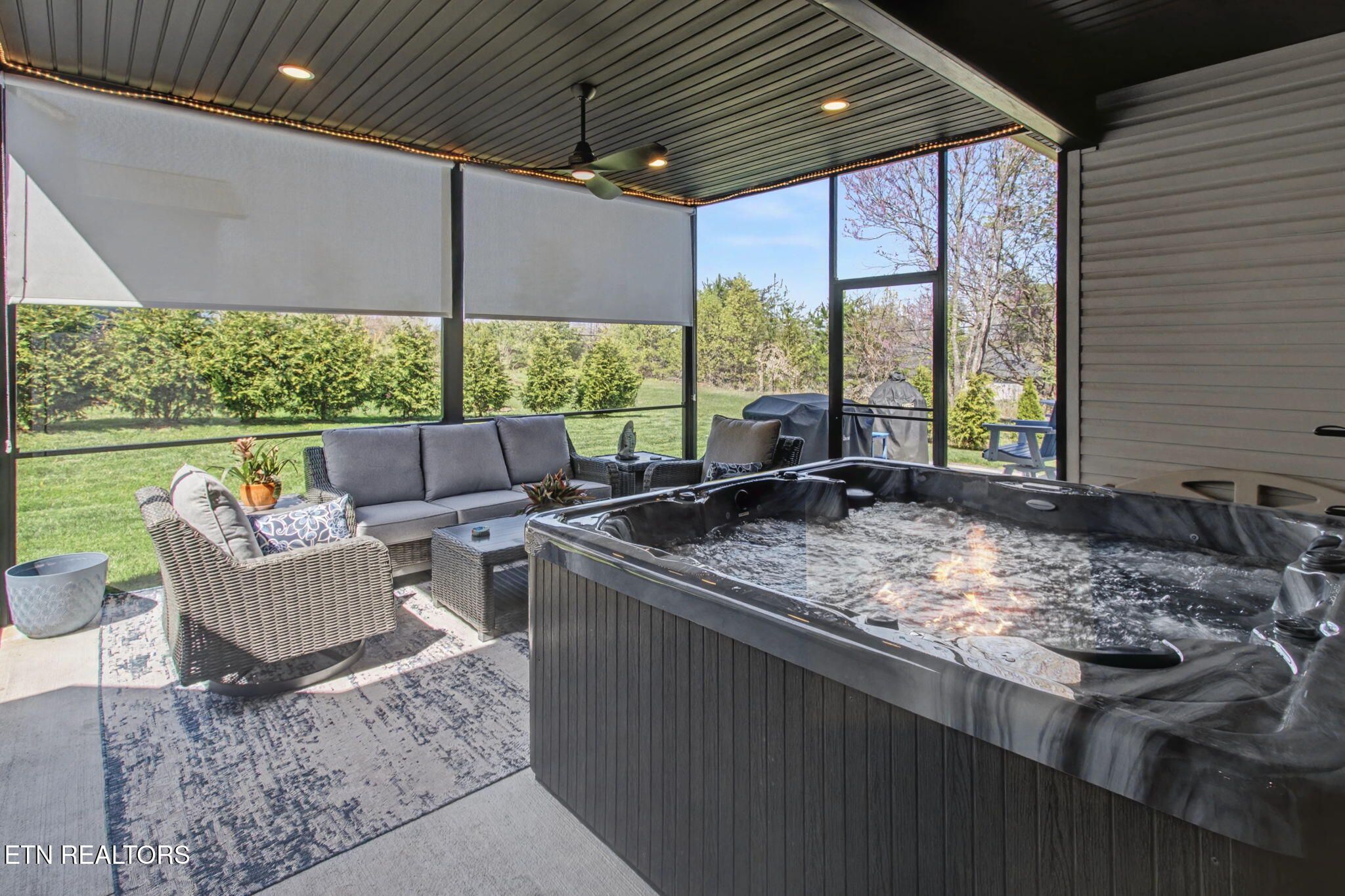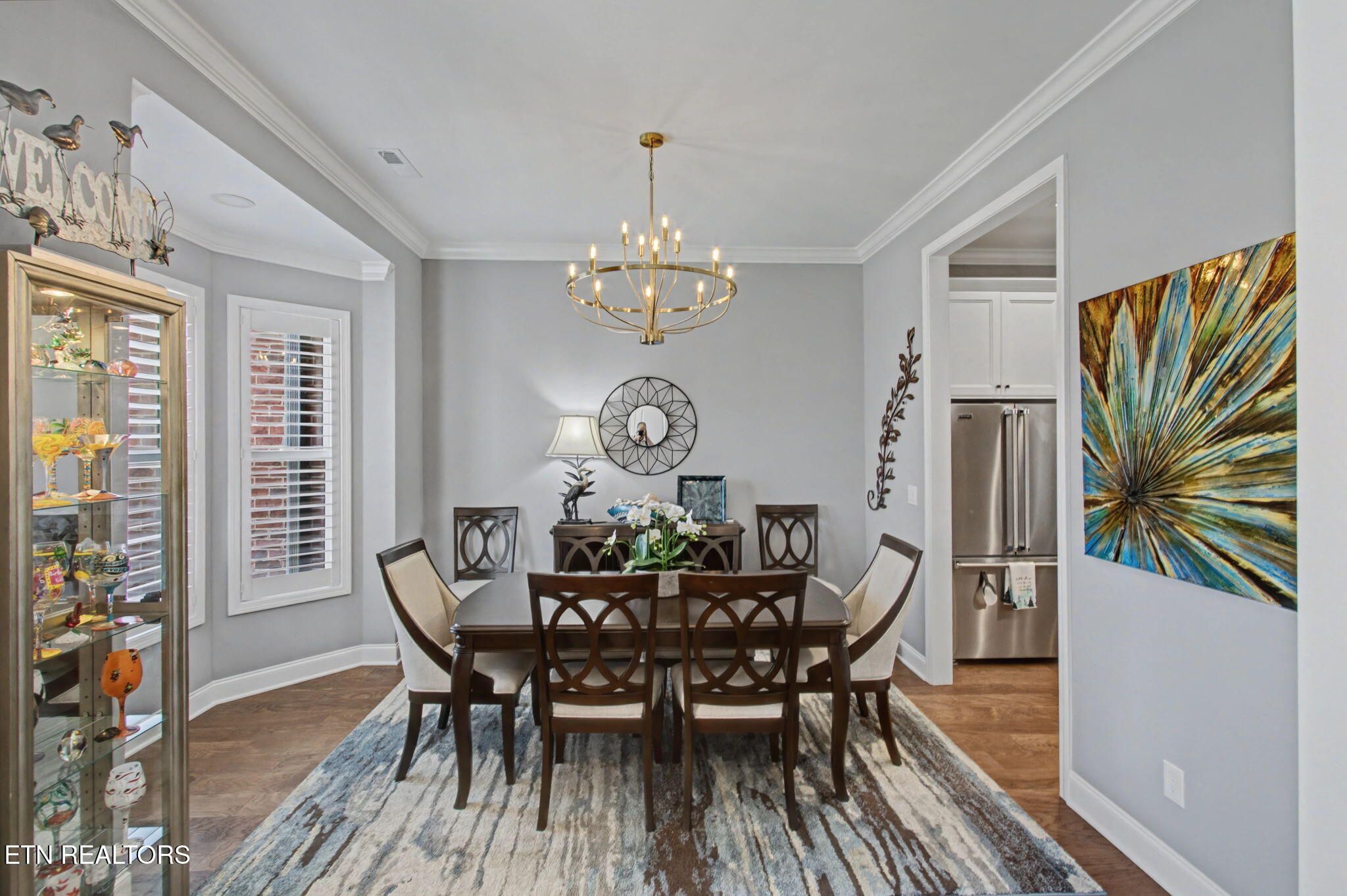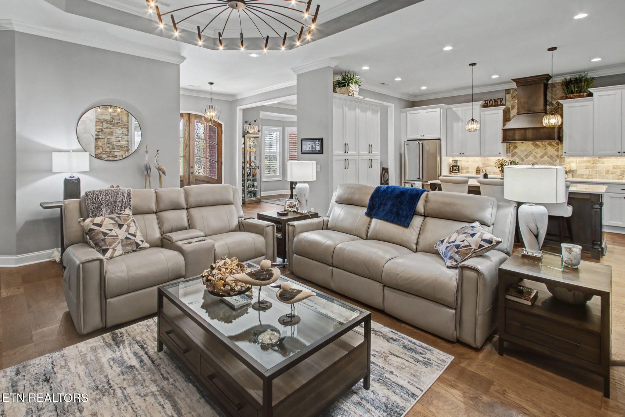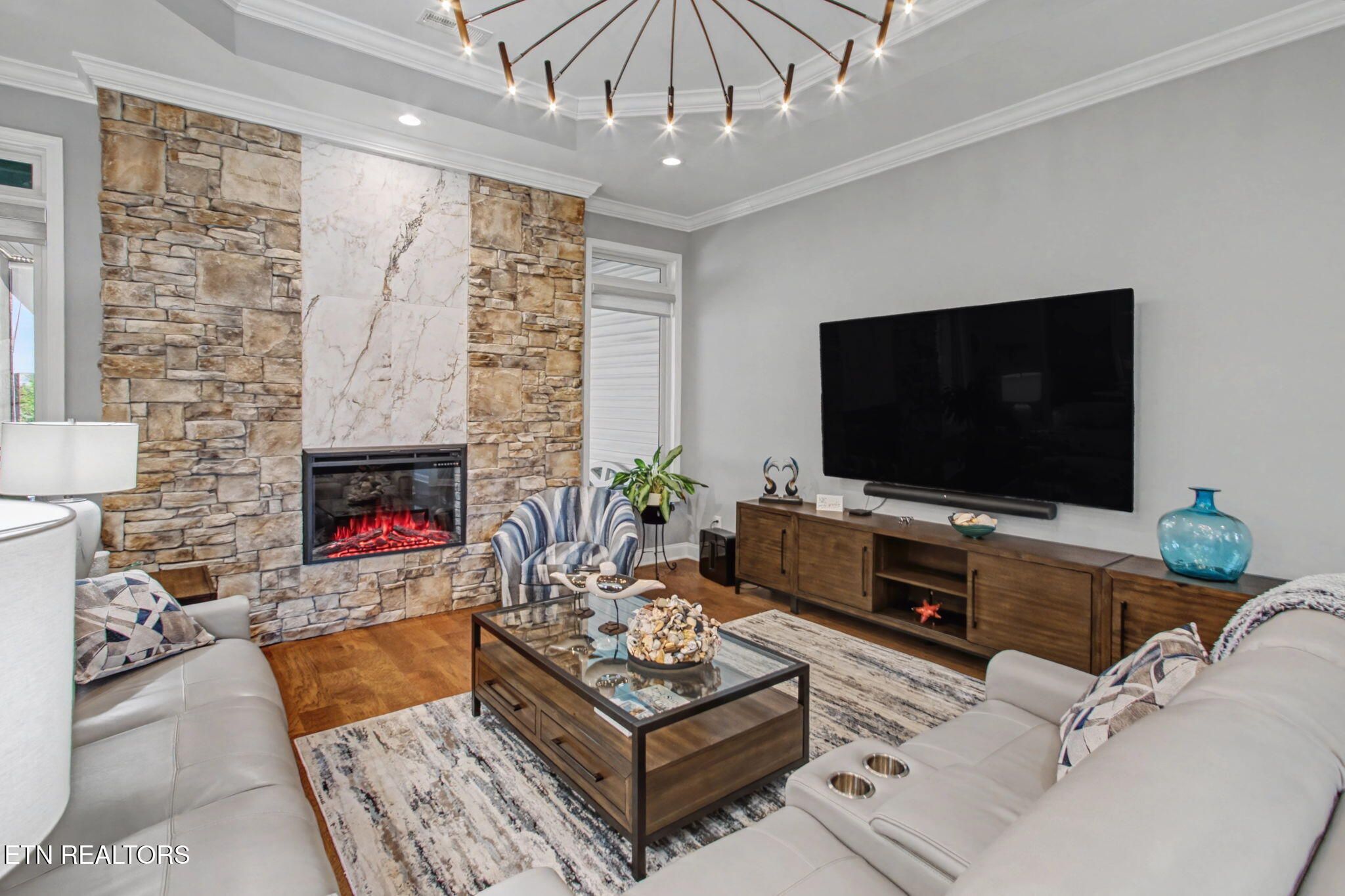 Welcome to better-than-new luxury living at 99 Walosi Way! This immaculate 3-bedroom, 3.5-bath home offers 3,383 sq ft of Elegant, move-in-ready space, built with premium finishes and thoughtful updates throughout. Step through impressive 8-foot double wooden doors and soaring 10-foot ceilings into the foyer. Crown molding throughout the entire home, setting the tone for refined living with Hardwood Flooring Throughout. The formal dining room impresses with an 11-foot cased opening, elegant chandelier, and plantation shutters. The expansive great room is the heart of the home, featuring a cozy electric fireplace with stackstone surround and tile insert, trey ceiling soaring to 12 feet, modern chandelier, and oversized windows framing the views. The chef's kitchen is a showstopper: gleaming white quartz countertops, custom solid-wood cabinetry, top-tier Viking appliances including a 5-burner gas range, tile backsplash with under-cabinet lighting, under-counter microwave, chrome fixtures, massive island perfect for entertaining, a wall of storage cabinets, and a walk-in custom pantry. The eat-in area boasts plantation shutters and seamless flow to the rest of the home. The primary suite is a true retreat: trey ceilings, abundant natural light via plantation shutters, modern chandelier, hardwood flooring, and a spa-like en-suite bath with tile floors, oversized soaking tub, massive walk-in tiled shower. dual quartz vanities, private water closet, and two expansive custom walk-in closets. Two generous guest bedrooms offer plantation shutters, large closets with custom shelving, and share a beautifully remodeled guest bath featuring dual vanities and a floor-to-ceiling tiled walk-in shower with a pocket door. A dedicated office provides serene golf course views and ample custom shelving for storage or organization. Upstairs, an extra-large bonus/game room awaits with a dry bar, full bath with tub/shower combo, seasonal water views, plentiful storage. Outside, enjoy resort-style living: a brand-new driveway, lovely screened porch with roller blinds (ideal for bug-free relaxation), hot tub that conveys, paver patio perfect for grilling, and a level lot with 9-zone irrigation system. Anderson windows throughout the home. Best of all? Prime location directly across from the renowned Toqua Golf Course--one of Tellico Village's premier championship courses with stunning Tellico Lake and Smoky Mountain views. Enjoy seasonal lake glimpses from your own backyard, plus walking distance to the Toqua Clubhouse for dining, events, and community amenities. This home combines modern elegance, high-end upgrades, and an unbeatable golf/lake lifestyle--truly better than new and ready for its next fortunate owners. Don't miss this rare opportunity in one of East Tennessee's most sought-after communities!