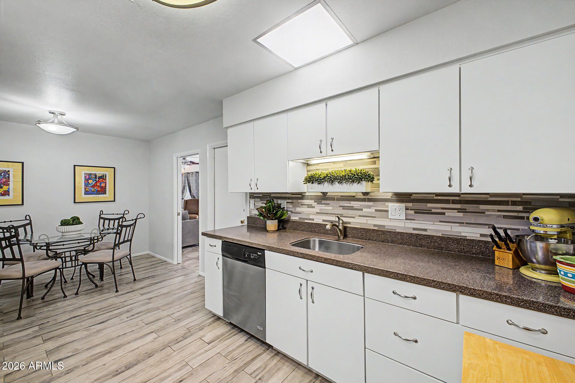 Welcome to this fully furnished end-unit 3-bedroom 2-bath on a coveted corner lot in Sun City! Brick accents and low-maintenance desert landscaping with mature trees welcome you. Inside, enjoy a serene living room with a soothing palette, vertical blinds, and durable tile flooring. The eat-in kitchen boasts skylights, granite counters, flat-panel cabinets, a mosaic tile backsplash, and high-end stainless steel appliances--all furniture and high-end SS appliances are included! Relax in the bright sunroom, perfect for Arizona weather year-round. The main bedroom offers a private bath and walk-in closet. Unwind on the back patio with pristine artificial turf. Plus, a rare indoor laundry room with custom built-in cabinets, 2-year-old HVAC system, dual pane windows and more!