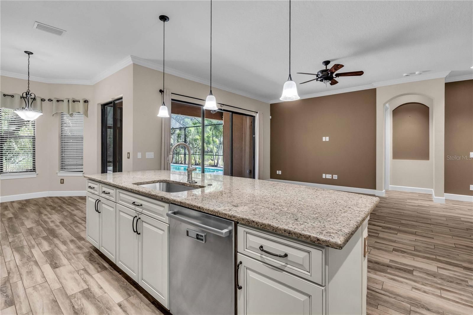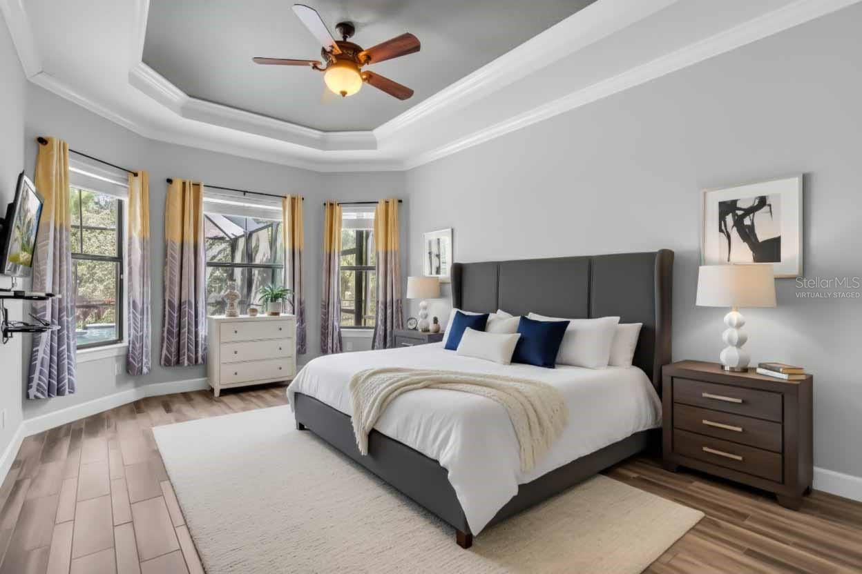 Welcome to this stunning Trevi floor plan pool home, located in Artisan Lakes Esplanade. This beautifully maintained, move-in ready residence offers 2,824 square feet of thoughtfully designed living space with an open concept layout that seamlessly blends comfort and style. The spacious main living area flows effortlessly into a perfectly crafted outdoor retreat, featuring a newer luxury pool enclosed in a screened lanai—an ideal space for relaxing or entertaining. One of the standout features of this home is the rare and highly sought-after extended 3-car garage, offering an additional four feet of depth for added storage, workspace, or oversized vehicles. The home includes 3 bedrooms, 3.5 bathrooms, a den, and a large bonus room upstairs, offering plenty of flexibility for modern living. The primary suite and a second bedroom are conveniently located on the main floor, providing both privacy and accessibility, while the third bedroom, full bathroom, and bonus living area are tucked away upstairs—perfect for guests, extended family, or an in-law suite setup. The third bedroom also features its own en-suite bath setup and extra privacy, making it ideal for multi-generational living or a private workspace. Inside, elegant architectural touches such as tray ceilings, crown molding, and arched openings add charm and sophistication, while the upgraded kitchen cabinetry enhances both style and function. Speaker wiring has been roughed-in for both the main living area and lanai, offering options for future audio upgrades. The home has been recently painted inside and out, and the HVAC system was replaced in 2021 with a high-efficiency unit for long-term comfort. The backyard is a true retreat, featuring low-maintenance artificial turf, concrete edging, and a unique fenced area—perfect for pets or a play space—all set against the peaceful backdrop of a private conservation area. The home features a luxurious saltwater, heated pool with a travertine deck, offering year-round enjoyment and a touch of timeless elegance. There’s also additional conservation across the street, enhancing the tranquil setting. From the picturesque courtyard entry to the mature landscaping that surrounds the property, every detail has been thoughtfully designed to create a welcoming and luxurious living experience. This original-owner home combines exceptional design, rare features, and an unbeatable location. Esplanade at Artisan Lakes offers resort-style amenities and is ideally situated near I-75, I-275, and US-41, providing quick access to shopping, dining, entertainment, and the beautiful Gulf Coast beaches.