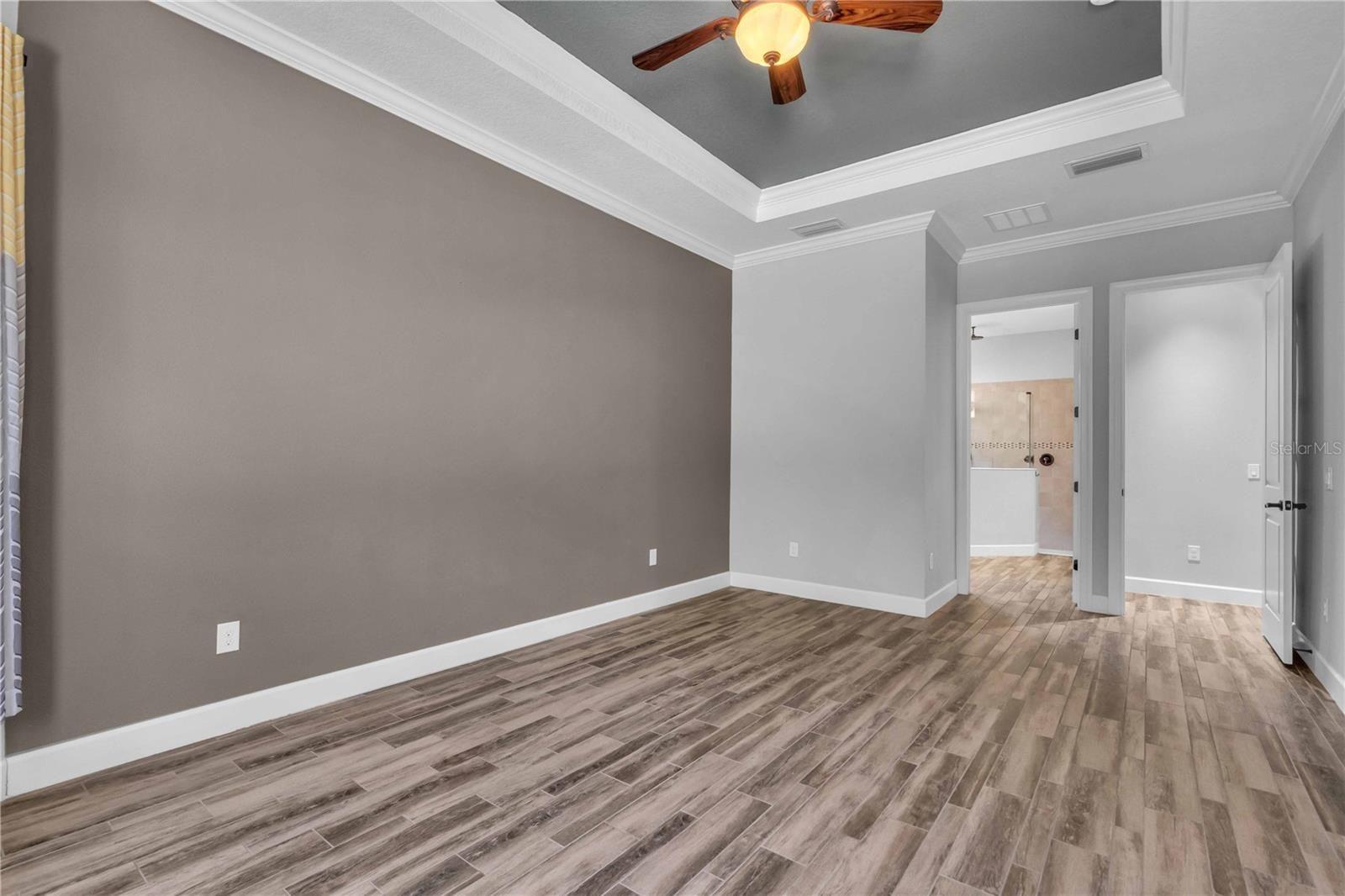 - Ceiling Fan(s), Crown Molding, Eat-in Kitchen, High Ceilings, In-Wall Pest Control, Kitchen/Family Room Combo, Open Floorplan, Main Level Primary, Tray Ceiling(s), Walk-In Closet(s), Window Treatments