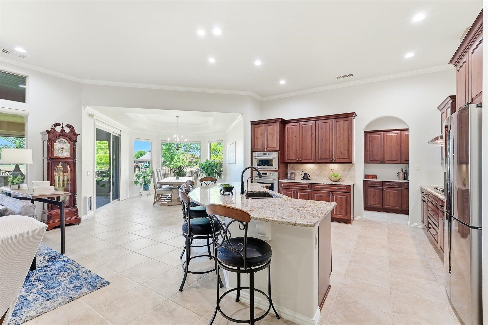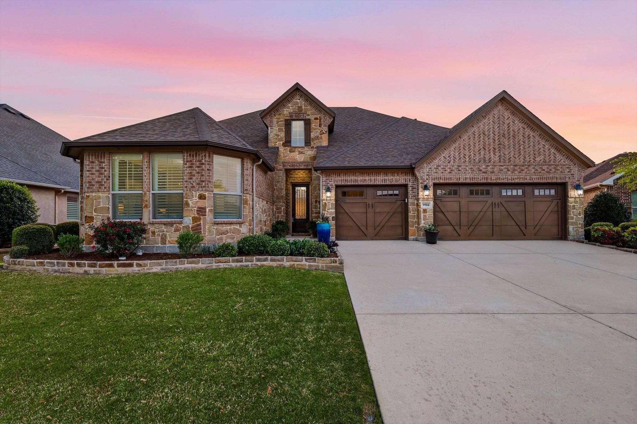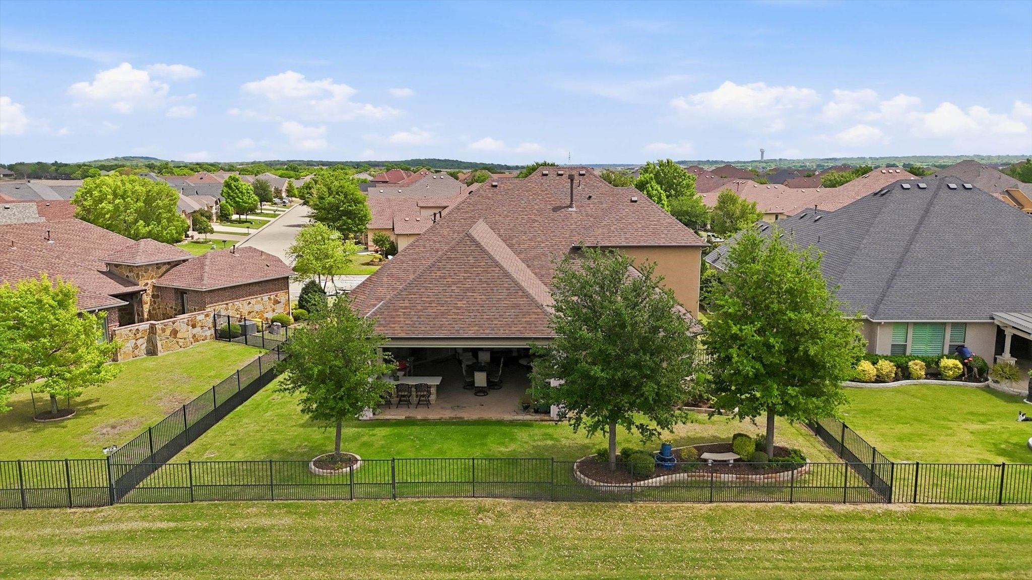 Extended patio sitting right in the golf course perfect for entertaining! Rare 3 bedroom layout, and private guest quarters set this home apart in Robson Ranch, one of North Texas’ premier 55+ active adult communities. Positioned along Hole 5, this property offers unobstructed fairway views and a covered outdoor living space designed for year-round enjoyment. The patio features an outdoor kitchen anchored by a full-size Kamado Joe grill, electric shades on three sides for added comfort, and direct views of the course and sunset skies. Inside, the open-concept layout is centered around a spacious living area with fireplace and flows into a well-appointed kitchen featuring granite countertops, GE Monogram gas cooktop, built-in oven and microwave, oversized island, butler’s pantry, and an expanded walk-in pantry with wine storage. Recent updates include a new roof in 2023, replaced windows in 2024, new dishwasher in 2025, fresh interior paint and updated lighting in 2026, along with a new disposal and upcoming GE Profile oven and microwave installation. The main level offers a primary suite with bay window, plantation shutters, custom closet system, and a spacious bath with dual sinks, soaking tub, and separate shower, along with a secondary bedroom suite on the first floor. Upstairs, a private guest retreat includes a separate living area, bedroom, and full bath, offering flexibility for visitors or additional living space. Additional features include a tankless water heater, water conditioning and reverse osmosis system, electric shades, plantation shutters, a fully fenced wrought iron backyard, RainBird sprinkler system, and an oversized 3-car garage with permanent storage solutions. Residents enjoy access to resort-style amenities including golf, pickleball, tennis, pools, fitness centers, walking trails, clubhouse dining, and a full calendar of clubs and activities.