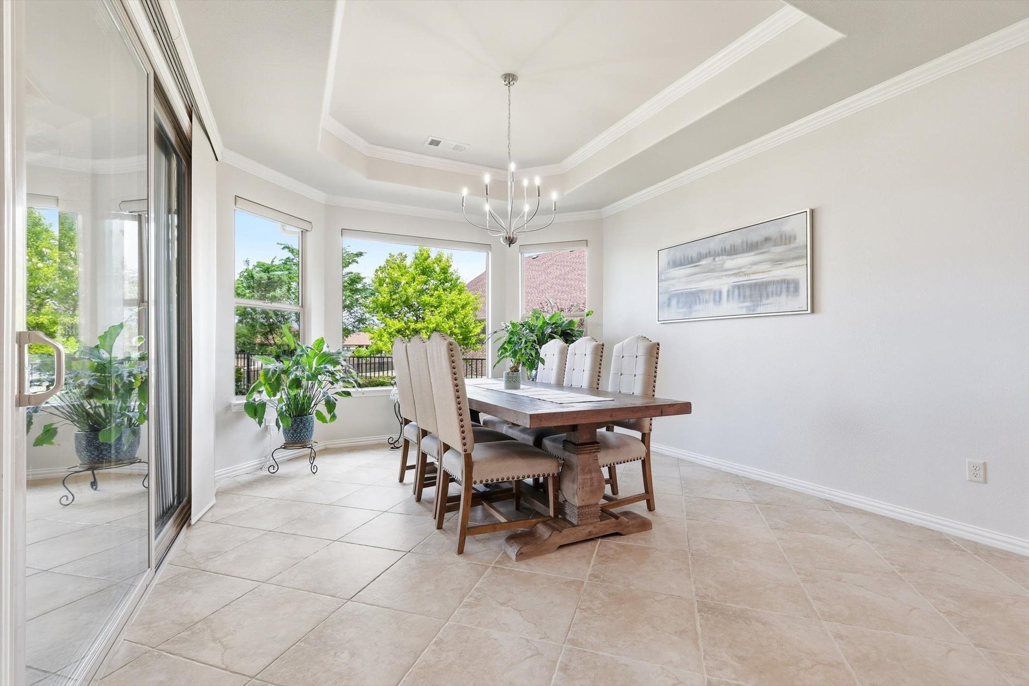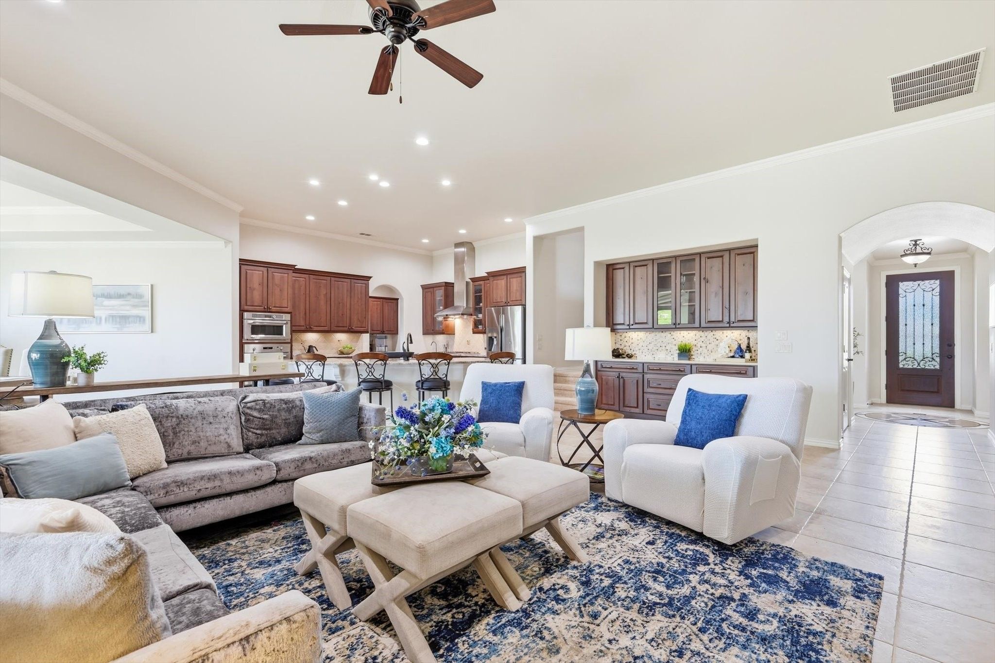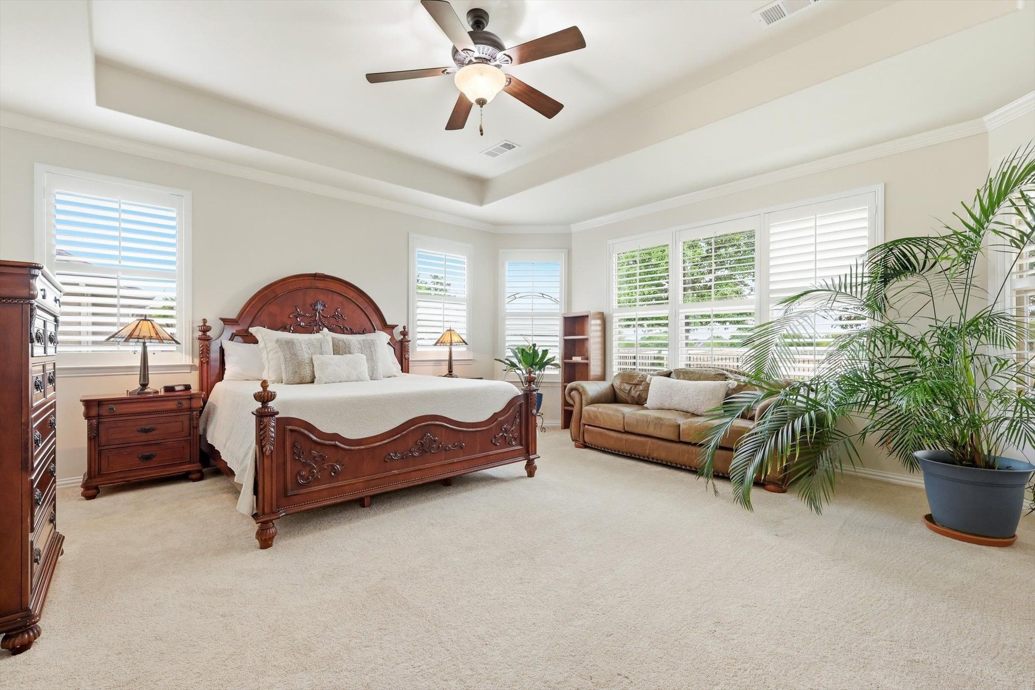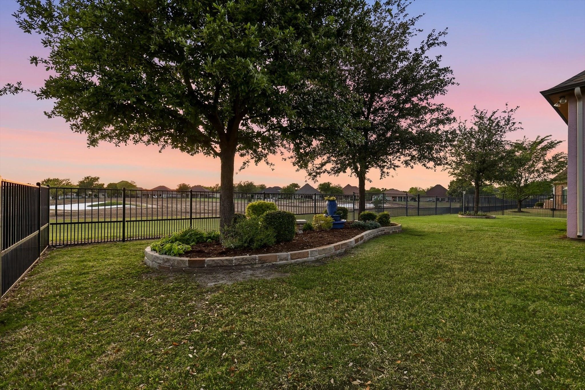 Extended patio sitting right in the golf course perfect for entertaining! Rare 3 bedroom layout, and private guest quarters set this home apart in Robson Ranch, one of North Texas’ premier 55+ active adult communities. Positioned along Hole 5, this property offers unobstructed fairway views and a covered outdoor living space designed for year-round enjoyment. The patio features an outdoor kitchen anchored by a full-size Kamado Joe grill, electric shades on three sides for added comfort, and direct views of the course and sunset skies. Inside, the open-concept layout is centered around a spacious living area with fireplace and flows into a well-appointed kitchen featuring granite countertops, GE Monogram gas cooktop, built-in oven and microwave, oversized island, butler’s pantry, and an expanded walk-in pantry with wine storage. Recent updates include a new roof in 2023, replaced windows in 2024, new dishwasher in 2025, fresh interior paint and updated lighting in 2026, along with a new disposal and upcoming GE Profile oven and microwave installation. The main level offers a primary suite with bay window, plantation shutters, custom closet system, and a spacious bath with dual sinks, soaking tub, and separate shower, along with a secondary bedroom suite on the first floor. Upstairs, a private guest retreat includes a separate living area, bedroom, and full bath, offering flexibility for visitors or additional living space. Additional features include a tankless water heater, water conditioning and reverse osmosis system, electric shades, plantation shutters, a fully fenced wrought iron backyard, RainBird sprinkler system, and an oversized 3-car garage with permanent storage solutions. Residents enjoy access to resort-style amenities including golf, pickleball, tennis, pools, fitness centers, walking trails, clubhouse dining, and a full calendar of clubs and activities.