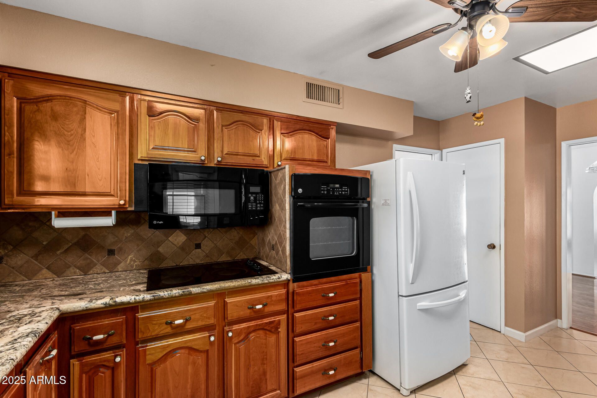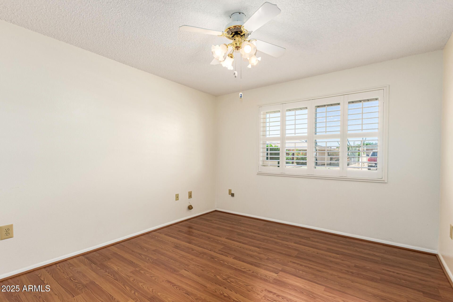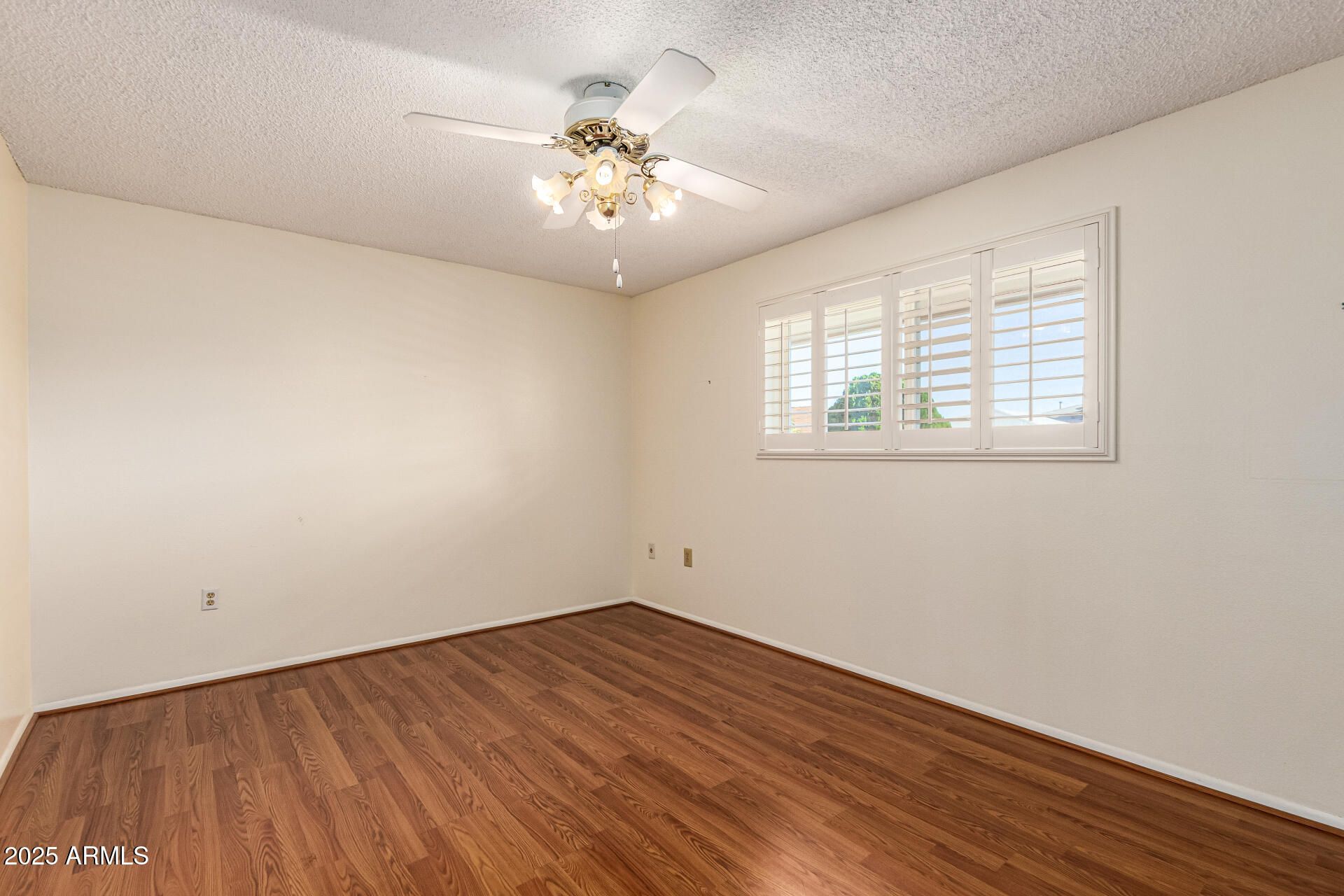 Beautifully maintained 3-bedroom, 2-bath Sun City home with a rare fenced backyard and spacious 300 sq. ft. bonus room. Perfect for active adult living, this home offers a 2-car garage with workshop, granite kitchen countertops, wood shutters, and remodeled main shower. Abundant storage throughout plus laundry with wash basin and cabinets. Washer/Dryer and two refrigerators convey. Enjoy Arizona living on the large covered patio surrounded by shade trees—ideal for relaxing or entertaining friends. Nestled in a quiet, quaint neighborhood, this home combines comfort, convenience, and the sought-after Sun City lifestyle.