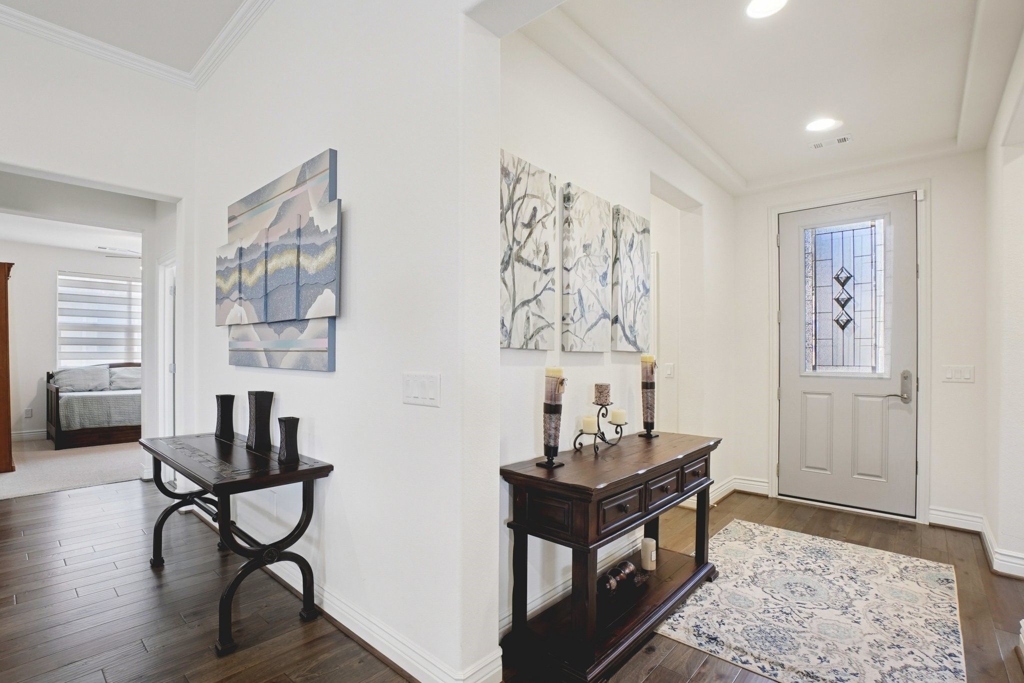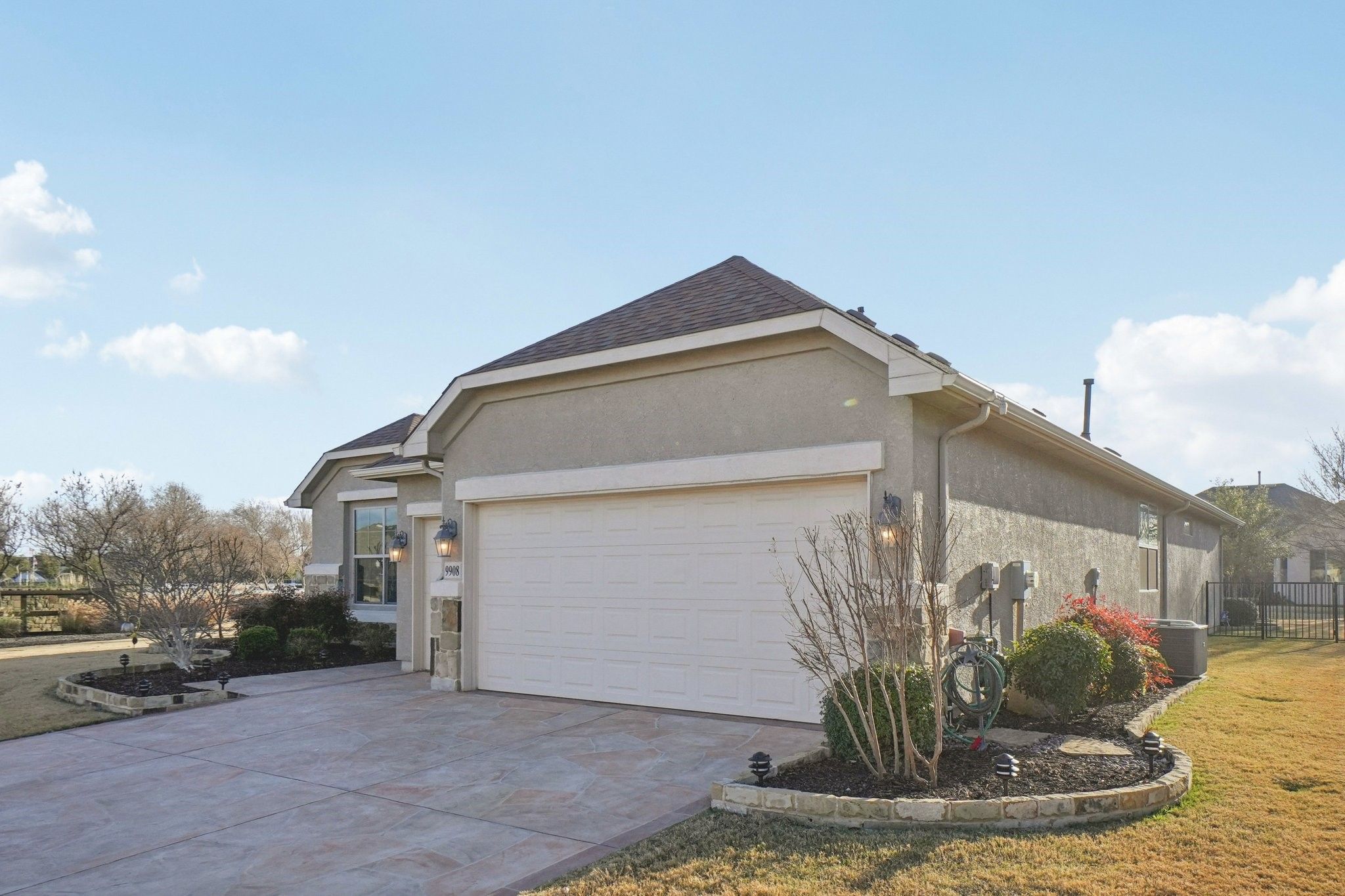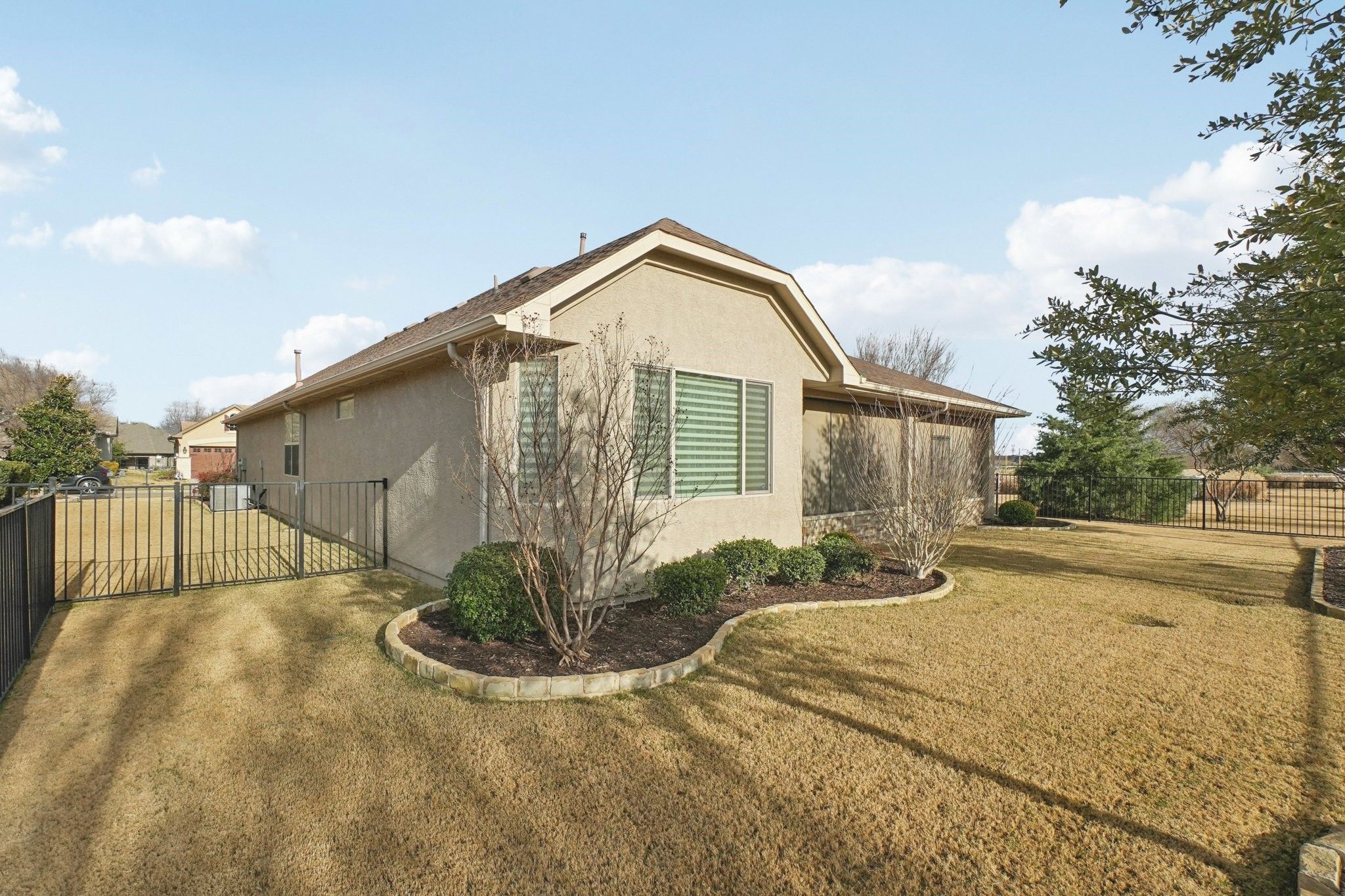 A BEAUTIFUL move-in-ready home in the heart of Robson Ranch. Enjoy a screened-in patio with fireplace overlooking a fenced backyard with lush landscaping and custom lighting—perfect for relaxing or entertaining. The open-concept design includes engineered wood floors, soaring ceilings, a bright bay window in the dining area, and a custom front door. A private guest suite with ensuite bath welcomes visitors, while a spacious den or home office offers flexible use. The primary suite includes dual sinks and a walk-in closet. Custom blinds throughout. An oversized garage offers space for two cars plus a golf cart and features a 4' extension, epoxy floors, an attic lift, additional decking, and abundant storage. Stamped concrete driveway with convenient access to Hwy 35. Residents of Robson Ranch enjoy a vibrant, resort-style lifestyle with access to exceptional amenities, including 27 holes of championship golf, a clubhouse with a restaurant and bar, indoor and outdoor pools, 16 pickleball courts, tennis courts, bocce ball courts, a state-of-the-art fitness center, an indoor sports building, a beauty salon, saunas, greenbelts, sidewalks, fishing ponds, and scenic walking and biking trails. With engaging community events and activities for every interest, this home offers the perfect blend of comfort, luxury, and active living!