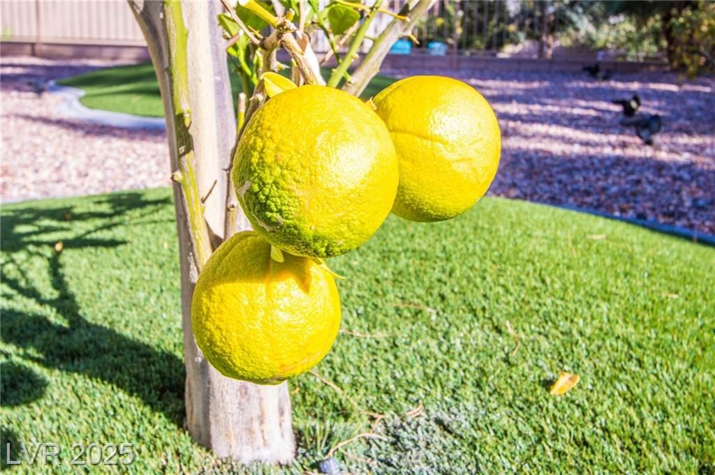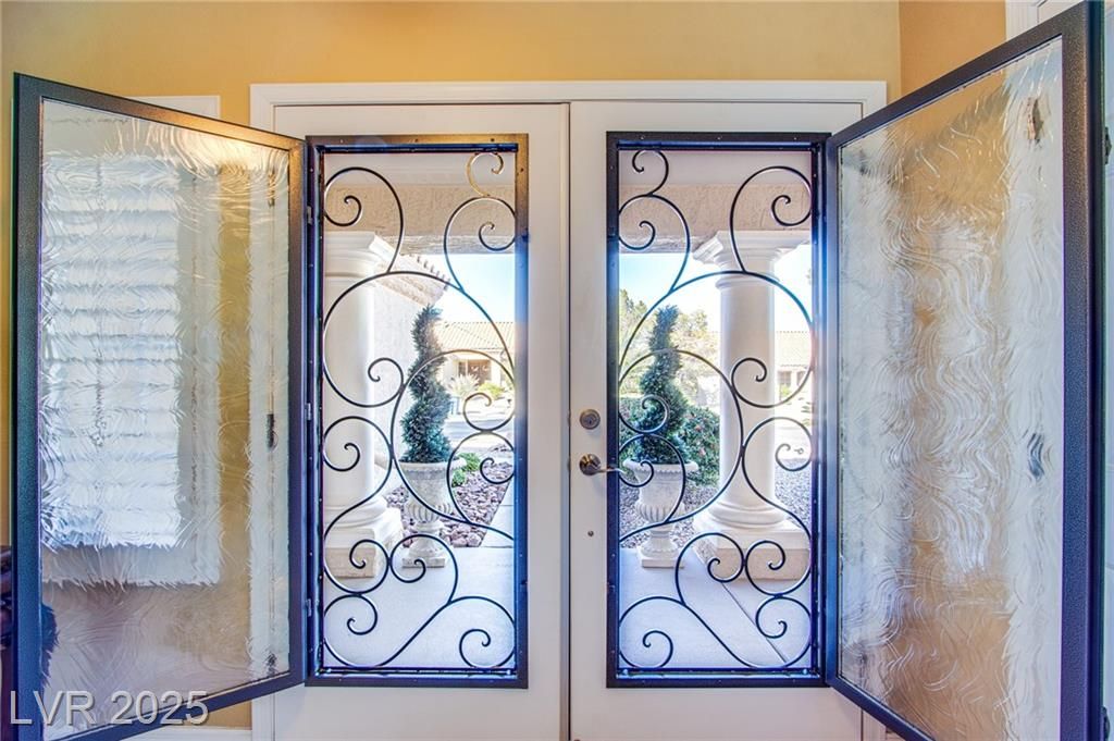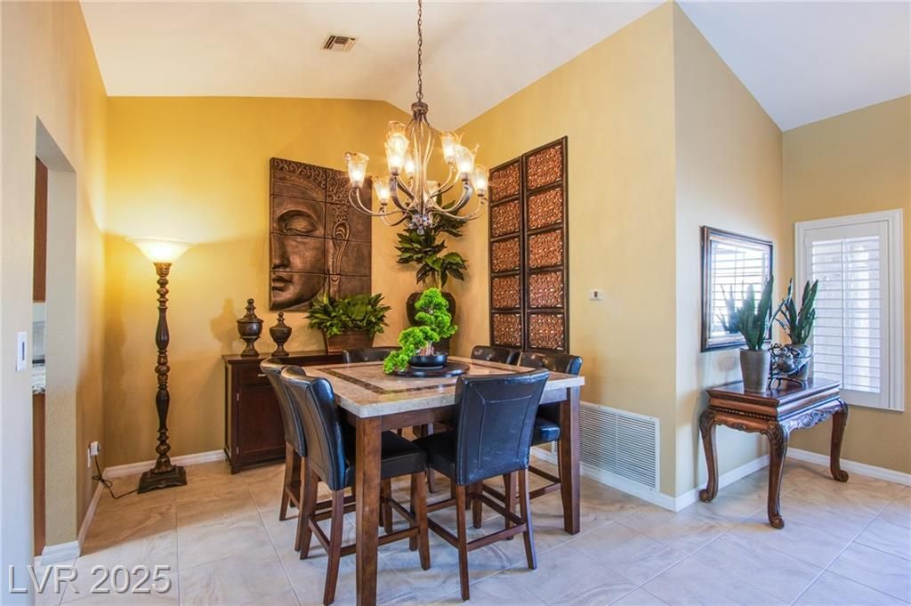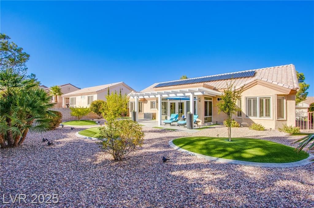 Beautifully upgraded and impeccably maintained Sun City masterpiece! This open and inviting Sandalwood model features a foyer with custom french glass entry doors, and a spacious living room and dining room with custom lighting! Also included is an added on flex space room, perfect for a den or hobby room, and laundry area is in the home! Gorgeous kitchen with slate stainless appliances, custom cabinets with pull out shelves, kitchen desk, and comfortable dining nook space. Tile floors with medallion inlay at entry, granite counters, ceiling fans, and shutters throughout! Primary suite includes custom closet organizer and primary bath with cultured marble shower and makeup counter. Enclosed sunroom leading to the backyard is the perfect place to relax. Exceptional landscaping including citrus fruit trees, tiled patio, and beautiful mature plants and trees! Located in the heart of Sun City Summerlin, surrounded by world class amenities and the golf course!
