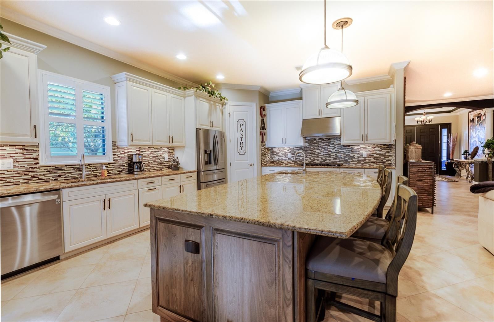 - Ceiling Fan(s), Coffered Ceiling(s), Crown Molding, Eat-in Kitchen, High Ceilings, Kitchen/Family Room Combo, Living/Dining Room, Open Floorplan, Main Level Primary, Solid-Wood Cabinets, Split Bedrooms, Stone Counters, Tray Ceiling(s), Walk-In Closet(s), Window Treatments