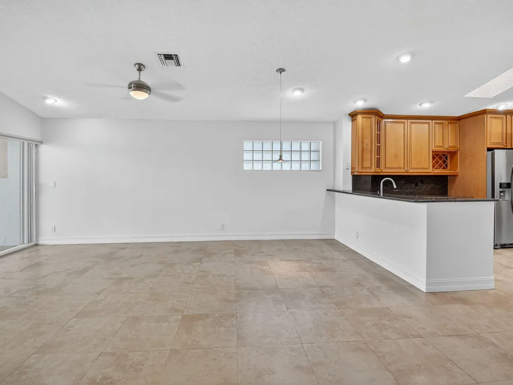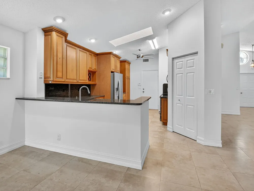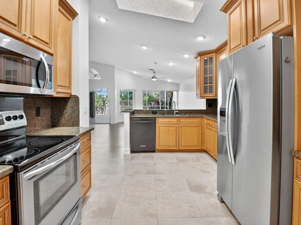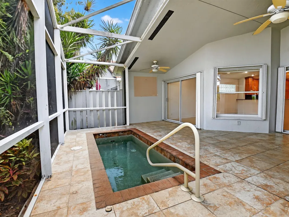 Welcome to a one-of-a-kind home in the vibrant Palm Isles community! This charming 3-bedroom, 2-bathroom residence features a spacious open floor plan and a private inground pool/spa--ideal for entertaining. With porcelain tile throughout and cozy carpeting in two bedrooms, enjoy the elegance of granite countertops, wood cabinets, and stainless steel appliances in the kitchen, alongside convenient pull-out drawers and an oversized washer and dryer.