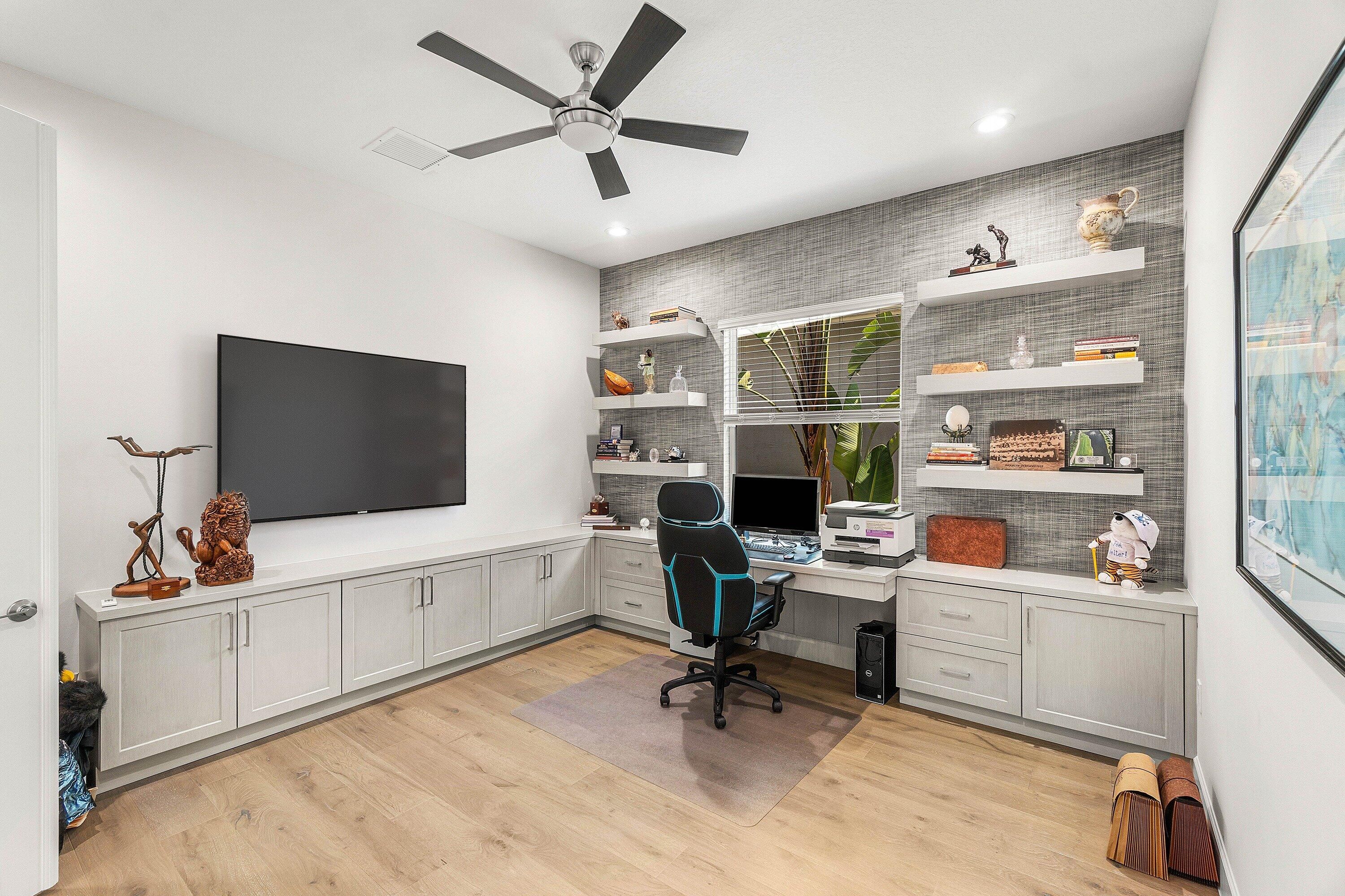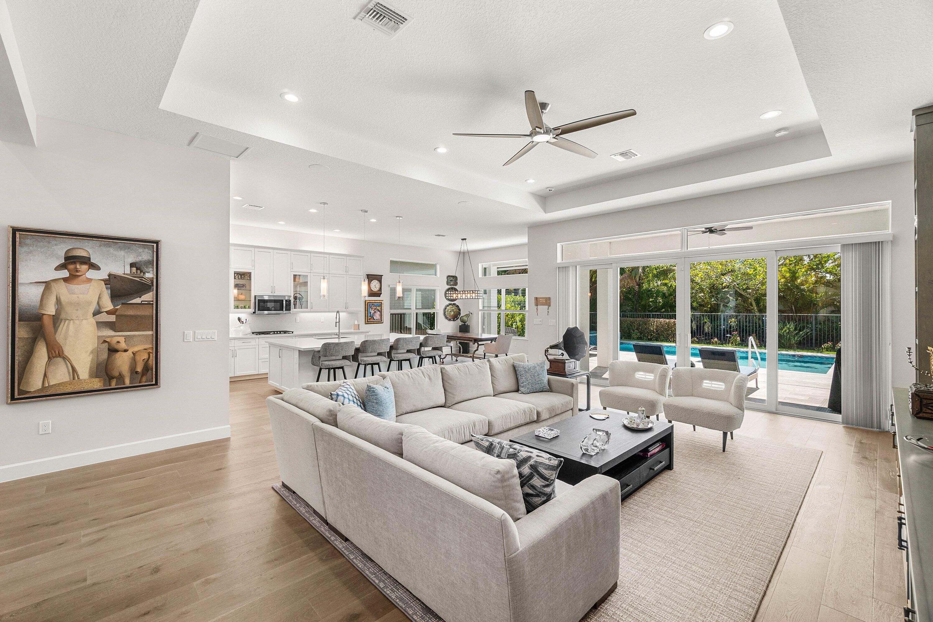 Enjoy the best of indoor-outdoor living in this beautifully upgraded home featuring a private heated pool and spa with an expanded travertine paver deck and motorized retractable hurricane and mosquito screens. Impact-rated windows and doors, mirrored double glass entry doors, upgraded landscaping, and an aluminum fenced yard enhance both style and security. Inside, engineered hardwood floors run throughout (no carpet). The gourmet kitchen showcases quartz countertops and backsplash, double-stacked cabinetry with glass accents, and double wall ovens with gas cooktop. Bathrooms feature quartz vanities and floor-to-ceiling tiled showers. Additional highlights include custom built-ins in the Great room and Den, motorized blinds, custom closet systems, epoxy garage floor, and so much more!