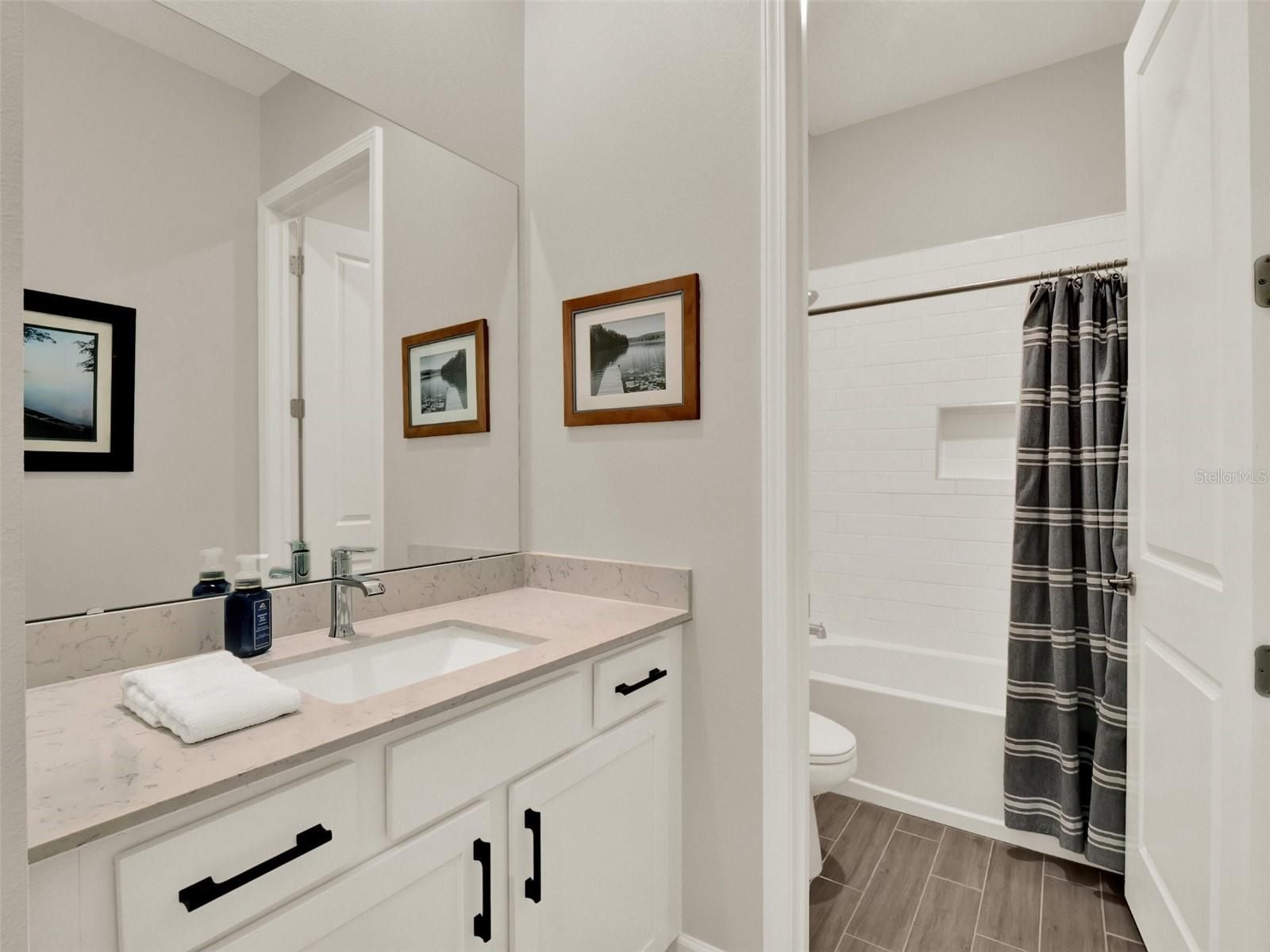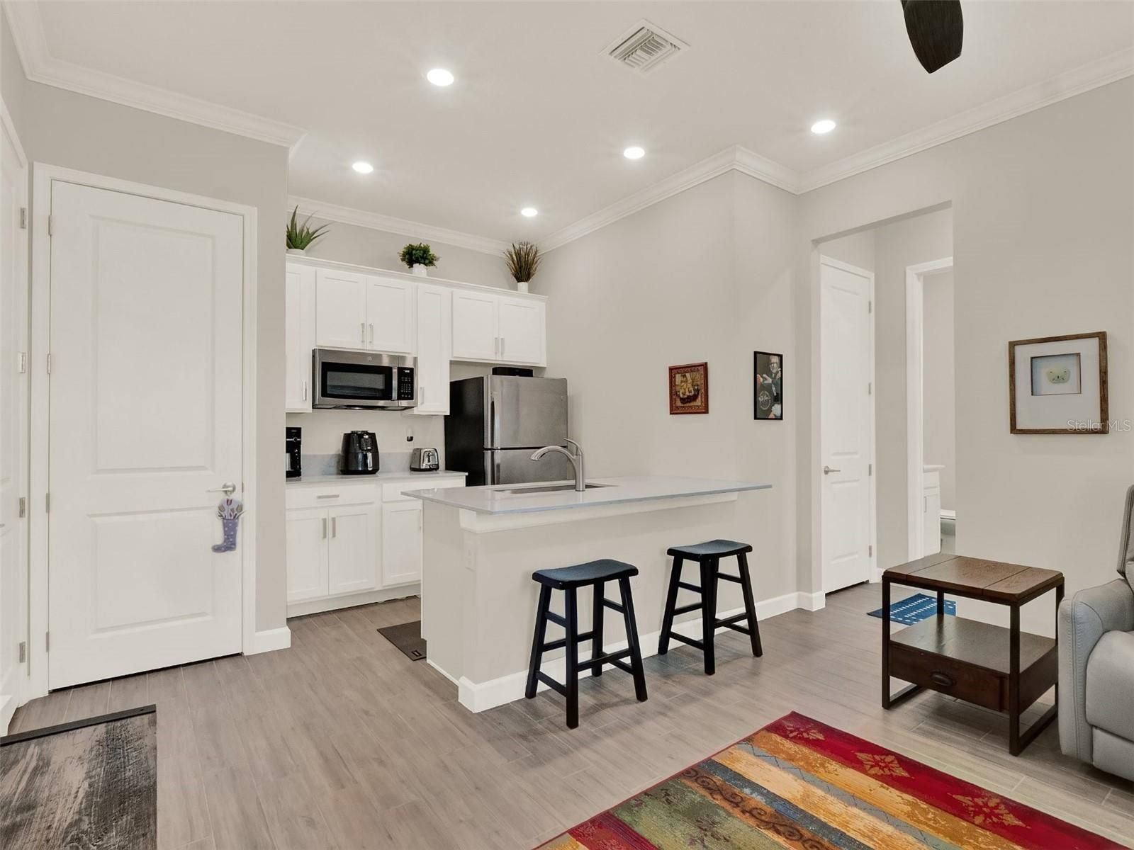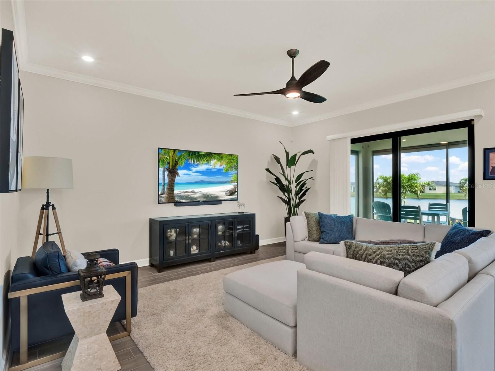 Stunning waterfront home in Bridgewater at Viera - a vibrant 55+ resort-style community offering luxury, comfort, and convenience. Designed for versatility, the main home offers 3 bedrooms and 2 full bathrooms, while a separate attached in-law suite (ADU) is equipped with its own private entrance, kitchenette, laundry, bedroom, and full bath - perfect for family or guests. This meticulously maintained home features a spacious open-concept layout, natural light, accented by plank tile flooring throughout, IMPACT WINDOWS AND SLIDERS, and elegant crown molding. The heart of the home is the gourmet kitchen, where entertaining is effortless with a built-in wall oven & microwave, white cabinetry with under-cabinet lighting, tiled backsplash, cooktop with designer hood, walk-in pantry, and a large shiplap-detailed island under pendant lighting. Step outside to enjoy custom landscaping, lighting, and both front and rear patios equipped with retractable hurricane screening. The garage features epoxy finished flooring, built-in storage, wall organizers, and bike racks for optimal functionality. Additional upgrades include 50 amp Interlock kit for generator, whole home surge protector, HVAC Reme-Halo Airflow UV Light, custom wall paneling and designer doors in flex room, modern ceiling fans and lighting, all adds comfort and convenience. Residents of Bridgewater at Viera enjoy access to state-of-the-art clubhouse, resort-style pool, lap pool, spa, tennis and pickleball courts, all just minutes from top rated dining, shopping, and sparkling Florida beaches.
